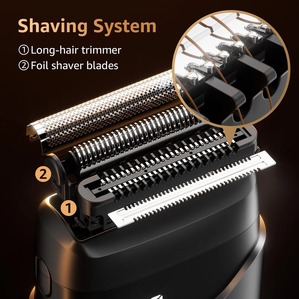 Skin Friendly: The foil shavers for men feature precision curved steel blades with built in smart sensing technology, effectively preventing hair pulling. With floating head technology, the mens electric razor adapts perfectly to your facial contours, providing a comfortable shaving experience Optimized Blades: After numerous ergonomic tests, we designed the ideal blade layout for the foil shaver. By combining the foil shaving head with the long beard trimming head, the electric razor for men precisely shaves short beards and easily trims longer ones Fast Charging: The electric shavers for men face comes with an upgraded LED battery display, so you can easily monitor battery life. With USB C fast charging technology, it only takes 90 minutes to charge, providing 100 minutes of lasting power for a hassle-free foil shaver experience IPX7 Waterproof: The electric razor for men face is rated IPX7 waterproof, easily handling both shower use and deep grooming with shaving foam. The electric shavers for men allow smooth dry and wet shaving and are easy to clean, simply rinse to restore them to like new condition Travel Companion: The men's foil shavers feature a unique magnetic dustproof cap design, keeping the blades clean. Its compact design makes it easy to store and with the travel lock to prevent accidental activation, the mini electric shaver is a must have tool for your travels