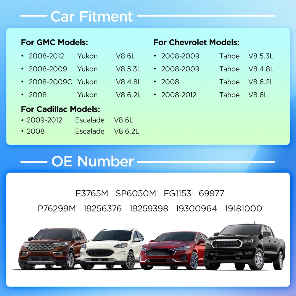 For 08-13 Escalade Tahoe Yukon 4.8L 5.3L 6.0L 6.2L Fuel Pump Module Assembly Compatible with the following vehicles: Cadillac 2009-2013 Escalade Hybrid 2010-2013 Escalade Hybrid Platinum 2008 Escalade (submodel: Base, Platinum) Chevrolet 2008-2013 Tahoe Hybrid 2008-2009 Tahoe (submodel: LS, LT, LTZ) GMC 2008 Yukon Denali 2010-2013 Yukon Denali Hybrid 2008-2013 Yukon Hybrid 2008-2009 Yukon (submodel: SLE, SLT) Payment Delivery details Terms of sales About us Contact us Payment 1.We only accept PayPal. PayPal is the only online payment method we accept. Please make sure you have a valid/confirmed PayPal account prior bidding. 2.All Paypal Payments must be Confirmed. Payment must be made within 48hrs of the auction end time. Non-Paying bidders will be reported. 3.When you get your package,maybe you will pay some charges, it's taxes for local customs,not pay to us, and the fees are depends on the customs, all buyer are same. Delivery details 1.Items will be shipped within 2 business days after payment is received. 2.We ship to your eBay address. Please make sure your eBay address is correct. Buyer takes responsibility if eBay address is wrong. 3.Import duties, taxes and charges are not included in the item price or shipping charges. Please check with your country customs office for these additional charges. 4.We shipping using UPS or USPS from our nearest warehouse to you. Tracking numbers will be emailed upon shipment. Terms of sales 1.Please feel free to email us if you have any question. 2.We appreciate you contact us via eBay message when you are not satisfied rather than open case or leave negative feedback directly. We'll try our best to solve the issue. 3.Refund will be issued once we receive your returned items. Buyer is responsible for all return shipping charges. 4.Please contact us for return process before you return the item. 5.All items for exchange or refund must be returned in "as new" condition. About us We are the responsible seller ,always provide high-quality products and best service .If you have any questions, please contact us, and will try our best to help you. Please contact us by eBay Message, and we will reply you within 24 hours. Thank you very much! Contact us We are the professional auto parts manufacturer , and provide line lock, AN hose end fittings , fuel line , fuel filter , fuel regulator , exhaust cutout , exhaust tips , exhaust muffler and so on .The quality of the product to be secured. If you have any questions or any needs , please contact us , and will try our best to help you. Brand Unbranded Drive Type Electrical Features New,With Fuel Sending Unit,With Pressure Sensor,Fuel Pump With Mo Fitment Type Direct Replacement Flow Rate 34 gallons/hour Interchange Part Number E3765M, 19368768, 19300964, 19181000, 19259398, 19256376, 2013 2012 2011 2010 2009 2008, Cadillac, GMC, Chevrolet, Chevy, Escalade Yukon Tahoe, with 1 Connectors, with 3 Tube Ports, Sport Utility, 8Cyl, 6.0L 4.8L 5.3L 6.2L, Hybrid Platinum Hybrid Denali Hybrid LS SLE SLT LT LTZ Platinum, Base Denali, Fuel Pump Manufacturer Part Number 14407966 Manufacturer Warranty 1-year unlimited-mileage warranty Notes Module Assembly; 3 Tube Fuel Lines OE Number 19368768, 19300964, 19181000, 19259398, 19256376 OE/OEM Part Number 19368768, 19300964, 19181000, 19259398, 19256376 Other Part Number 19368768, 19300964, 19181000, 19259398, 19256376 Part Name Fuel Pump Performance Part No Quantity Sold individually Superseded Part Number E3765M, 19368768, 19300964, 19181000, 19259398, 19256376, 2013 2012 2011 2010 2009 2008, Cadillac, GMC, Chevrolet, Chevy, Escalade Yukon Tahoe, with 1 Connectors, with 3 Tube Ports, Sport Utility, 8Cyl, 6.0L 4.8L 5.3L 6.2L, Hybrid Platinum Hybrid Denali Hybrid LS SLE SLT LT LTZ Platinum, Base Denali, Fuel Pump Type Fuel Pump Universal Fitment No UPC 723650277157
