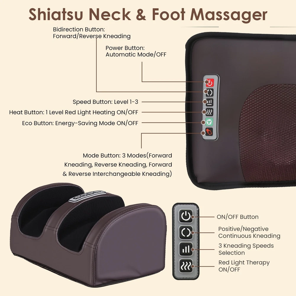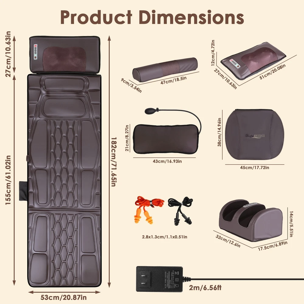 Free Shipping Featured Item Product Detail Image Gallery Product Description Overview: This full body massage mat is an ultimate solution for body pain and relaxation. With 12 massage heads, 9 vibration modes, pinpoint vibration, 9 speed/intensity levels, 3 heating options, and 3 timer settings, it relieves discomfort caused by various issues. The massage mat includes a detachable Shiatsu neck massager and foot massager, a sponge head pillow, inflatable lumbar pillow and earplugs for enhanced comfort. Available in flannel or PU leather, it has an anti-slip bottom. Comes with a storage bag, easy to carry. An ideal gift for loved ones on special occasions like Mother’s Day, Father’s Day, or birthdays. Features: Full Body Massage Mat: Suffering from back,waist,hip,thigh,or leg pain due to a sedentary lifestyle,cold,sports injury,,or meniscus issues? This electric massage mat is your ideal solution!It features 12 massage heads and offers versatile relief with 9 vibration modes,9 pinpoint vibration modes,9 speed levels,9 intensity levels,3 heating levels,and 3 timer settings—all designed to target and soothe your pain. Shiatsu Neck & Foot Massager: Designed for versatile relaxation,this full body massage mat includes 2 powerful massagers:The detachable neck massager gives a comfortable massage for your neck,back,arms,and legs,while the individual foot massager delivers soothing relief to your feet,calves,and arms. Each massager features 2 rotating Shiatsu heads,multiple speed and mode options,soothing heat,and a 15mins auto-off timer—making them perfect for releasing muscle tension anytime,anywhere. Whether at home,in the office,or traveling,enjoy a spa-like experience. Sponge Head Pillow & Inflatable Lumbar Pillow: Designed for total comfort,our massage chair pad includes two supportive pillows:The soft sponge head pillow provides optimal support for your head,while the inflatable lumbar pillow lets you customize the height to perfectly match your body's curves. Comfortable Surface & Anti-Slip Bottom: For ultimate comfort at home, this massage mat offers two choices: cozy Flannel for warmth and softness, perfect for cooler environments or sensitive skin; or easy-clean PU Leather, ideal if you prefer a sleek feel and worry about spills. Both options feature a secure anti-slip dotted bottom and a adjustable strap, allowing you to safely enjoy deep massage on any surface—whether attached to a recliner, placed on a bed/sleeper sofa, or over a soft carpet. Portable Use & Thoughtful Gift: All components detach easily to fit into the included storage bag, making it perfect for travel or saving space at home. Plus, if you feel noisy when massaging, you can use our included earplugs. The massage mat with heat serves as an ideal gift for loved ones on special occasions like Mother’s Day, Father’s Day, or birthdays—offering relaxation and care to grandparents, parents, partners, and friends! Usage FAQs: Q1: Why do I feel sore or uncomfortable during/after the first few uses? A: It’s normal to experience some soreness or discomfort initially, especially if it’s your first time using a massage mat. This sensation aligns with the traditional belief: “Where there is pain, there is blockage; where there’s blockage, pain follows. Relief comes once energy flows freely.” The massage nodes stimulate muscles and acupoints that may be tense or underused. This initial reaction often indicates that your muscles are being actively relaxed and circulation is improving. The discomfort should lessen within a few sessions as your body adapts. Q2: How Can I minimize discomfort during the first few sessions? A: To reduce discomfort in the initial sessions, try the following methods: Method 1: Begin with shorter sessions, lasting 8–10 minutes, and gradually extend the duration as your body acclimates to the massage. Method 2: Avoid applying your full body weight directly onto the mat. Instead, slightly lift part of your body to decrease pressure. Method 3: Place a flap, towel, or thin blanket over the Shiatsu Massager. This extra layer can cushion the massage intensity and alleviate discomfort. Q3: Where should I place the massage mat for optimal comfort and safety? A: For the best experience, place the mat on flat, soft surfaces like reclining/lounge chairs, beds, sofa beds, or thick carpets. Measure the chair's dimensions and compare them with the mat to ensure a proper fit;avoid using chairs smaller than the mat. Opt for armless chairs for better comfort. Steer clear of hard or uneven surfaces,as they can increase vibration and noise. Q4:How can I reduce vibration noise during use? A:To minimize noise,you can place the mat on a soft surface as recommended. Use the included earplugs for additional noise reduction. Q5:Is the entire mat a deep tissue or Shiatsu massager? A:Only the detachable neck and foot massagers use Shiatsu(deep kneading) technology. The main vibration mat provides a soothing vibration massage,not deep tissue or Shiatsu. Use them together or separately for full-body relaxation. Q6:Can I sleep on the mat or use it overnight? A:Absolutely not. For your safety,never use the massager while sleeping or unattended. Each should have a maximum duration of 30 minutes. Always unplug the adapter from the power outlet after use. Q7:Can I wash the massage mat? A:The main Vibration Mat cover is non-removable and not machine washable. Clean it by wiping the surface with a soft,damp cloth and mild detergent. Avoid soaking or spraying water directly on the mat. Q8:Why does the massage mat feel hot? Is this safe? A:The massage mat supports overheating protection. If heat feels excessive,painful,or localized in one spot,turn off heating function immediately and unplug. Check for obstructions(blankets,pillows) trapping heat. Specifications: Brand: Blissful Massage Product Type: Full Body Massage Mat Color : Brown Materials: PU Leather+Shaped Sponge+Plastic Dots Bottom Surface Pattern: Hot-Press