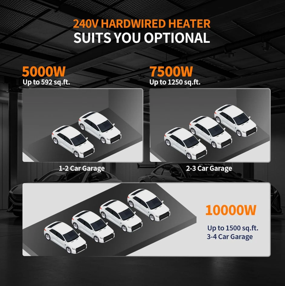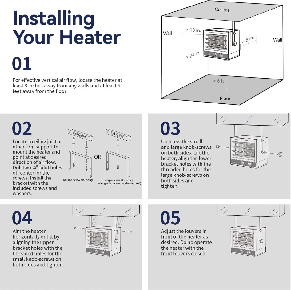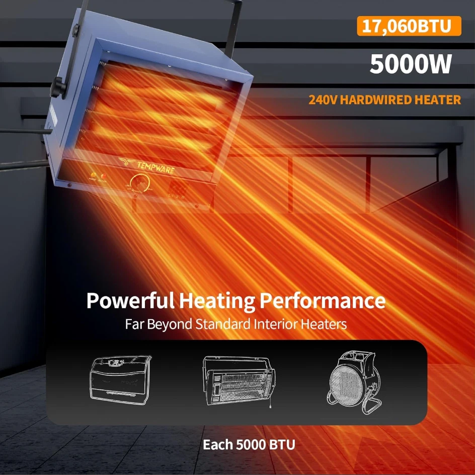 Free eBay listing template designed by dewiso.com Electric Garage Heater Adjustable Angle & 3 Heat Settings: This garage heater has adjustable louvers and variable mounting angle to direct the air output. Its maximum BTUs of 17,060 is powerful enough to heat a large area up to 592 square feet. Power ranges from low to high, 3,000 watts, 4,000 watts, and 5,000 watts to meet your different needs Space Saving Design: This is an ideal compact garage heater with almost industrial-strength power. It can be stably placed on the ground or mounted on a wall or ceiling, which is very suitable for factories,workshops and warehouses to save precious space Safe & Sturdy Structure: Our electric garage heater is made of heavy-duty steel material, which is very strong and durable, and has a long service life. In addition, the heater for workshop is ETL certified to ensure your safe use Thermostat & Overheat Protection: Our garage heater is equipped with a built-in thermostat. You can adjust the thermostat to suit your needs and preferences. And a built-in sensor switches the device off automatically if it overheats Hardwired Installation: You will need an electrician to do this safely. The garage heater must be grounded and hardwired to a properly sized current protection circuit breaker in accordance with the (US) National Electric Code and local codes Note: This heater does not come with a power cord. Please switch off the circuit breaker to turn the garage heater off. Product Description Free eBay listing template designed by © dewiso.com .