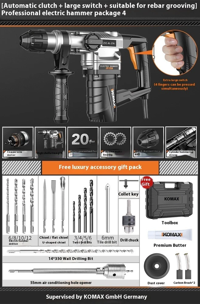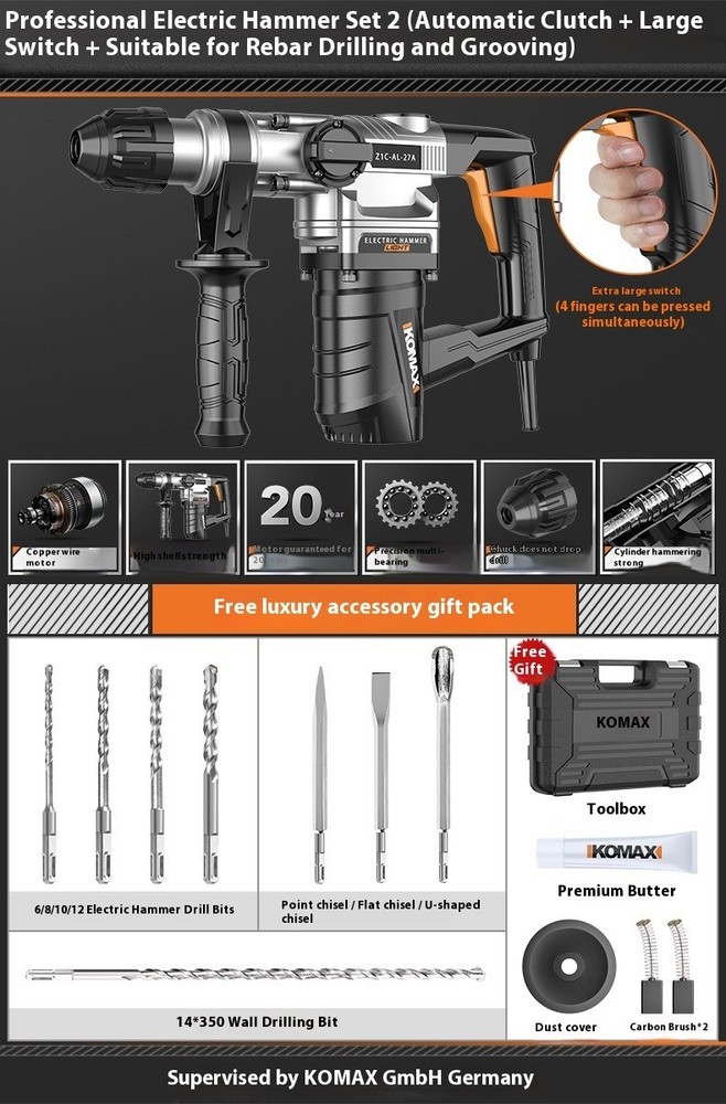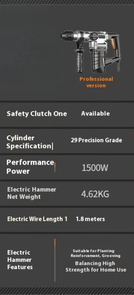 Electric Hammer Electric Pick Dual-use Multi-function Impact Drill Household Safety clutch: Yes Cylinder specification: 29 precision grade Rated power: 1500W Hammer drill net weight: 4.62KG Cord length: 1.8 meters Hammer drill features: Suitable for rebar anchoring and grooving, also handles heavy-duty household tasks