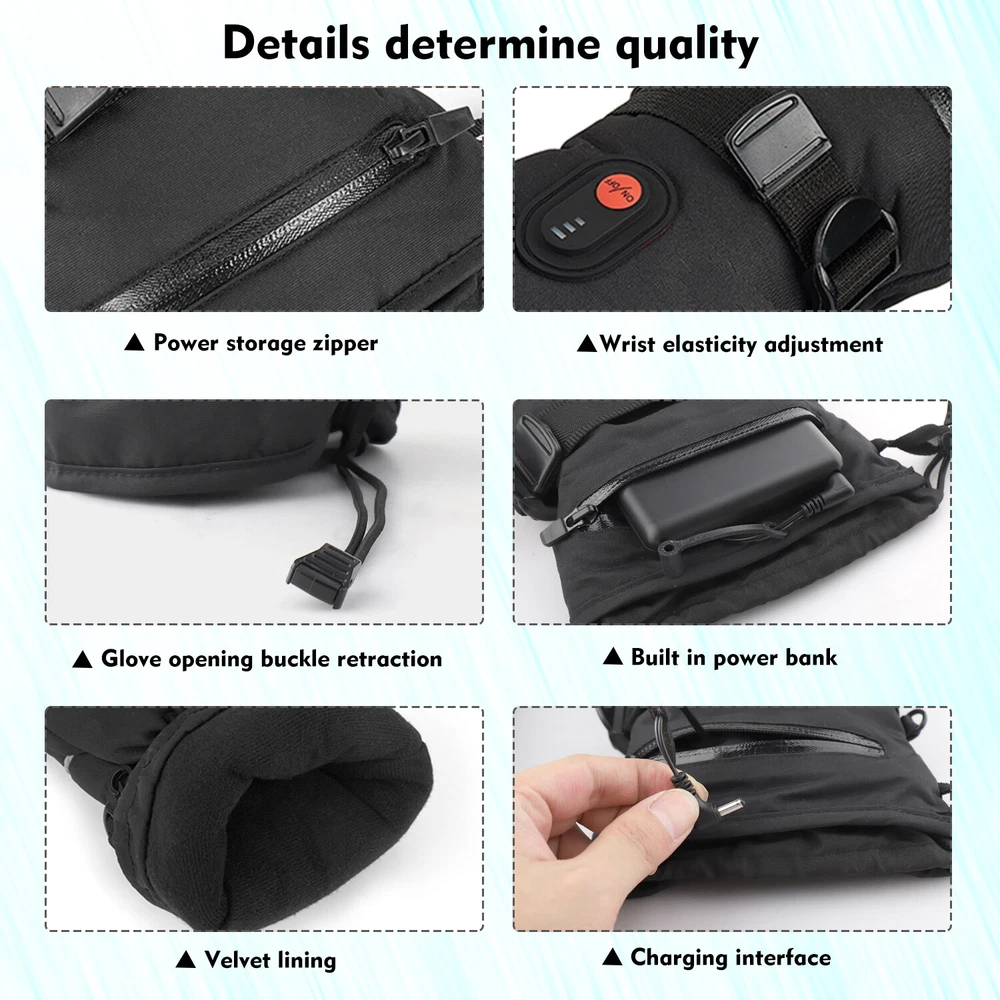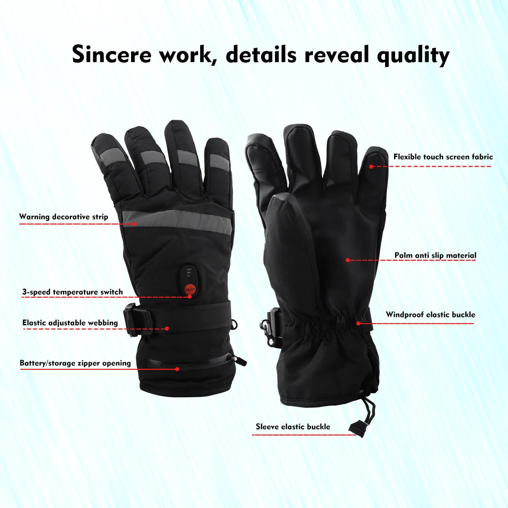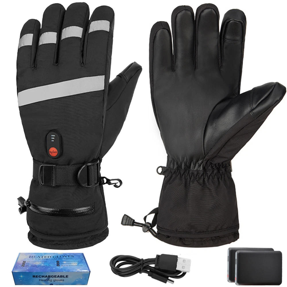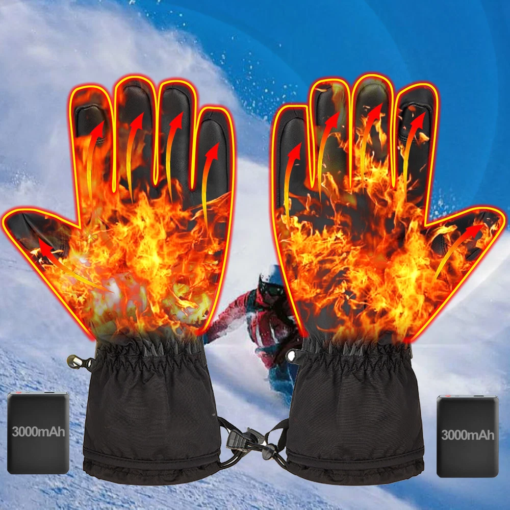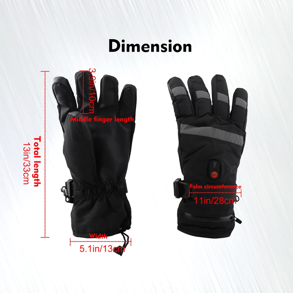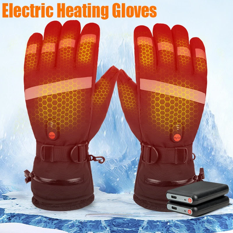 Features: 2024 Winter Gloves Upgrade Design:The electric heated gloves is composed of 4 layers of warmth and filled with super soft cotton liners, effectively winterized. Palm and finger area of the heat motorcycle gloves are premium leather, non-slip, wear-resistant with a long service life. Heating area is the back and fingers that accelerate blood circulation and keep your hands warmer for a long time. 3000mAh Battery & 3 Temperature Adjustable:Equipped 3000mAh large capacity battery that makes the rechargeable gloves can be quickly heated to maximum temperature There are 3 intelligent modes. You can adjust the heating level by clicking the button on the back of the gloves to meet your need at anytime, anywhere. Multifunctional Hand Warmers Gloves:The thumb and forefinger part can touch sensor of the phone without taking off the heated work gloves. Exterior is made of waterproof material that can use it in rainy or snow days. With zipper pocket can hide the battery, money, tickets... Widen the tail and drawstring closure can tuck the sleeves into the heated gloves and tighten the opening for good windproof, warmth effect. Widely Used & Perfect Gift for Winter Sports: Perfect for all indoor outdoor activities, such as skiing, cycling, driving, fishing, camping, hiking, hunting, riding, snow shoveling, walking the dogs, etc. suit for both men and women. A nice Thanksgiving/ Christmas/ New Year/ Valentine's Day gift for family and friends. Tips: Fully charge the battery before use, Please. Specification: Name: Electric Heating Gloves Specification: battery type Material: nylon + cotton Lithium battery: 3000 mAh Features: waterproof, warm, non-slip touch screen Warm keeping time: constant temperature about 3-6 hours Packing List: 1 Pair of Heating Gloves 1*USB Charging Cable 2*3000 mAh Battery