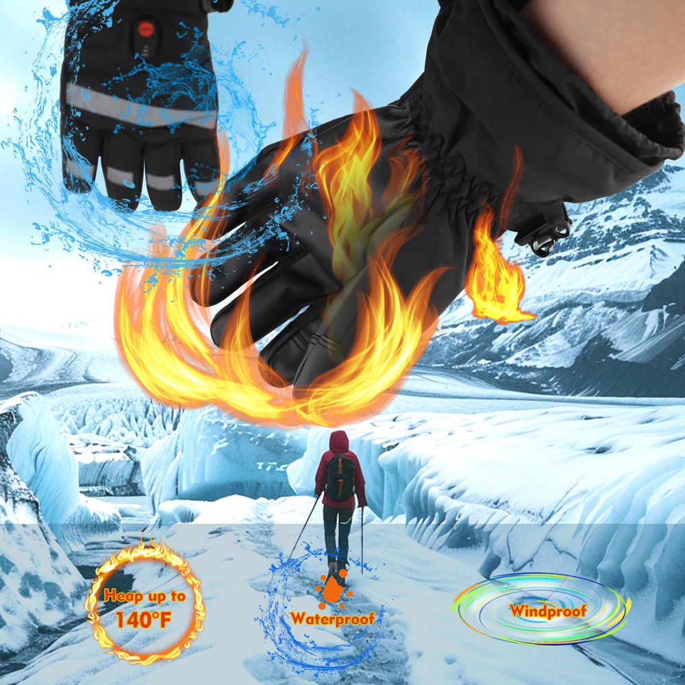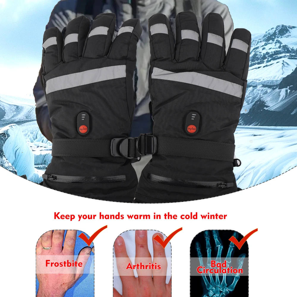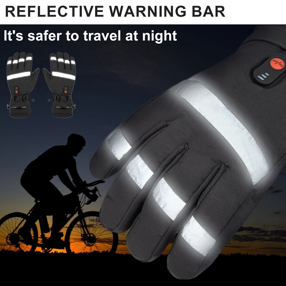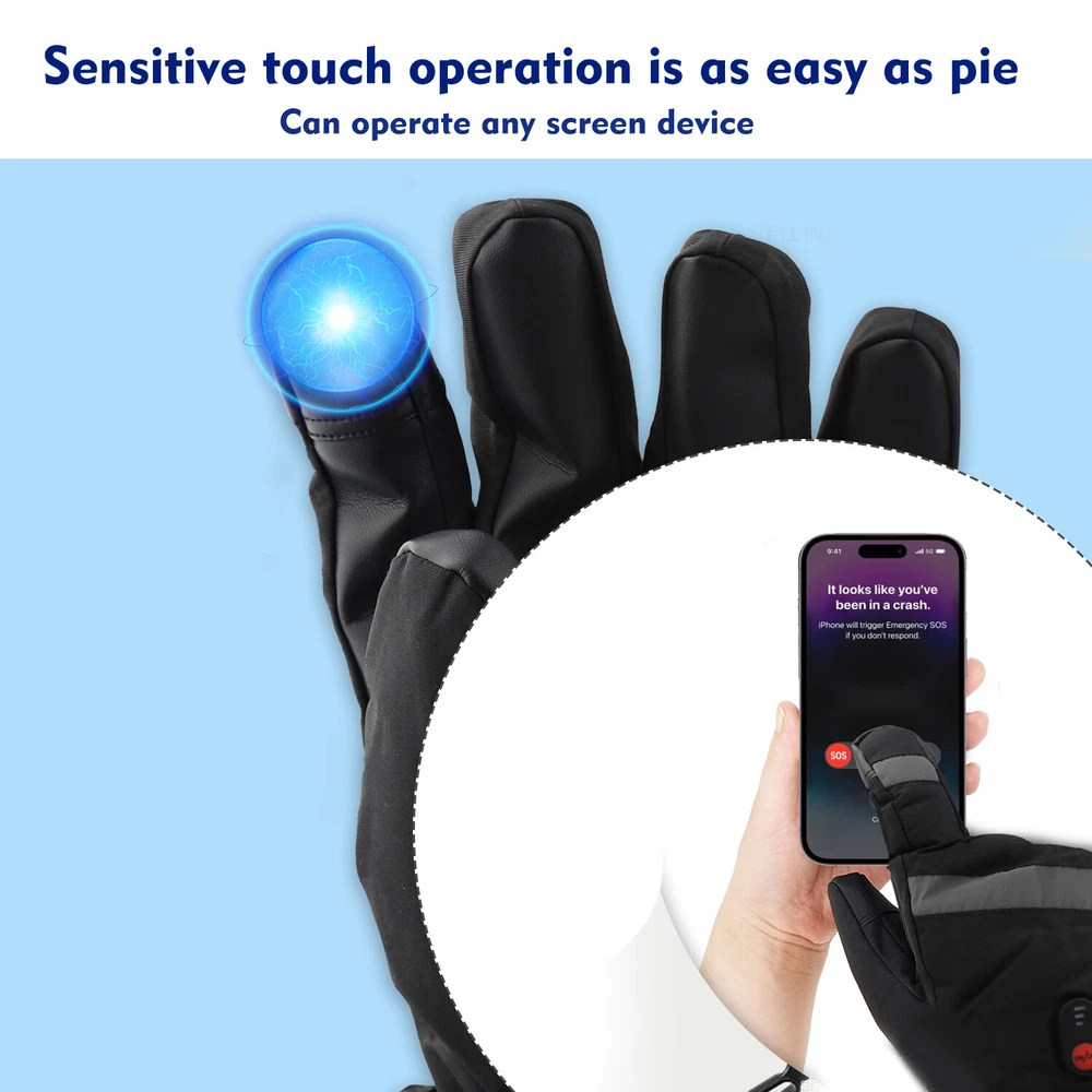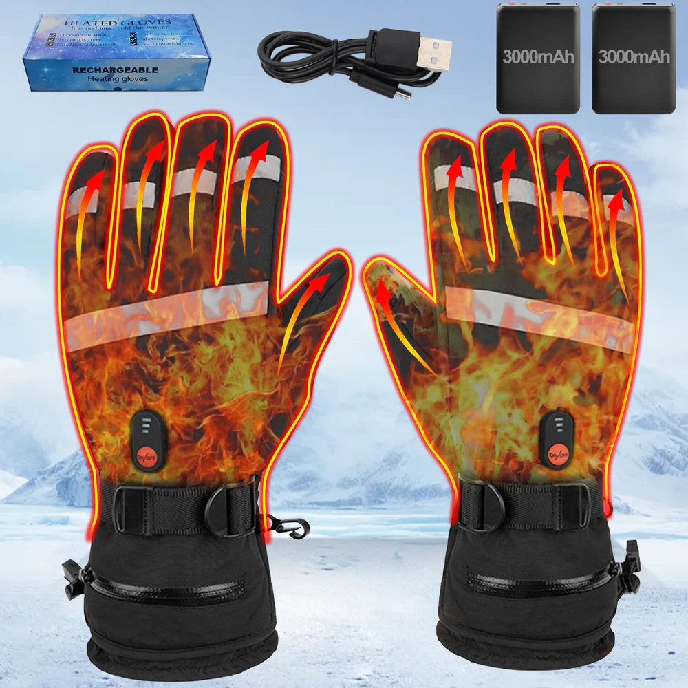 Features: 2024 Winter Gloves Upgrade Design:The electric heated gloves is composed of 4 layers of warmth and filled with super soft cotton liners, effectively winterized. Palm and finger area of the heat motorcycle gloves are premium leather, non-slip, wear-resistant with a long service life. Heating area is the back and fingers that accelerate blood circulation and keep your hands warmer for a long time. 3000mAh Battery & 3 Temperature Adjustable:Equipped 3000mAh large capacity battery that makes the rechargeable gloves can be quickly heated to maximum temperature There are 3 intelligent modes. You can adjust the heating level by clicking the button on the back of the gloves to meet your need at anytime, anywhere. Multifunctional Hand Warmers Gloves:The thumb and forefinger part can touch sensor of the phone without taking off the heated work gloves. Exterior is made of waterproof material that can use it in rainy or snow days. With zipper pocket can hide the battery, money, tickets... Widen the tail and drawstring closure can tuck the sleeves into the heated gloves and tighten the opening for good windproof, warmth effect. Widely Used & Perfect Gift for Winter Sports: Perfect for all indoor outdoor activities, such as skiing, cycling, driving, fishing, camping, hiking, hunting, riding, snow shoveling, walking the dogs, etc. suit for both men and women. A nice Thanksgiving/ Christmas/ New Year/ Valentine's Day gift for family and friends. Tips: Fully charge the battery before use, Please. Specification: Name: Electric Heating Gloves Specification: battery type Material: nylon + cotton Lithium battery: 3000 mAh Features: waterproof, warm, non-slip touch screen Warm keeping time: constant temperature about 3-6 hours Packing List: 1 Pair of Heating Gloves 1*USB Charging Cable 2*3000 mAh Battery