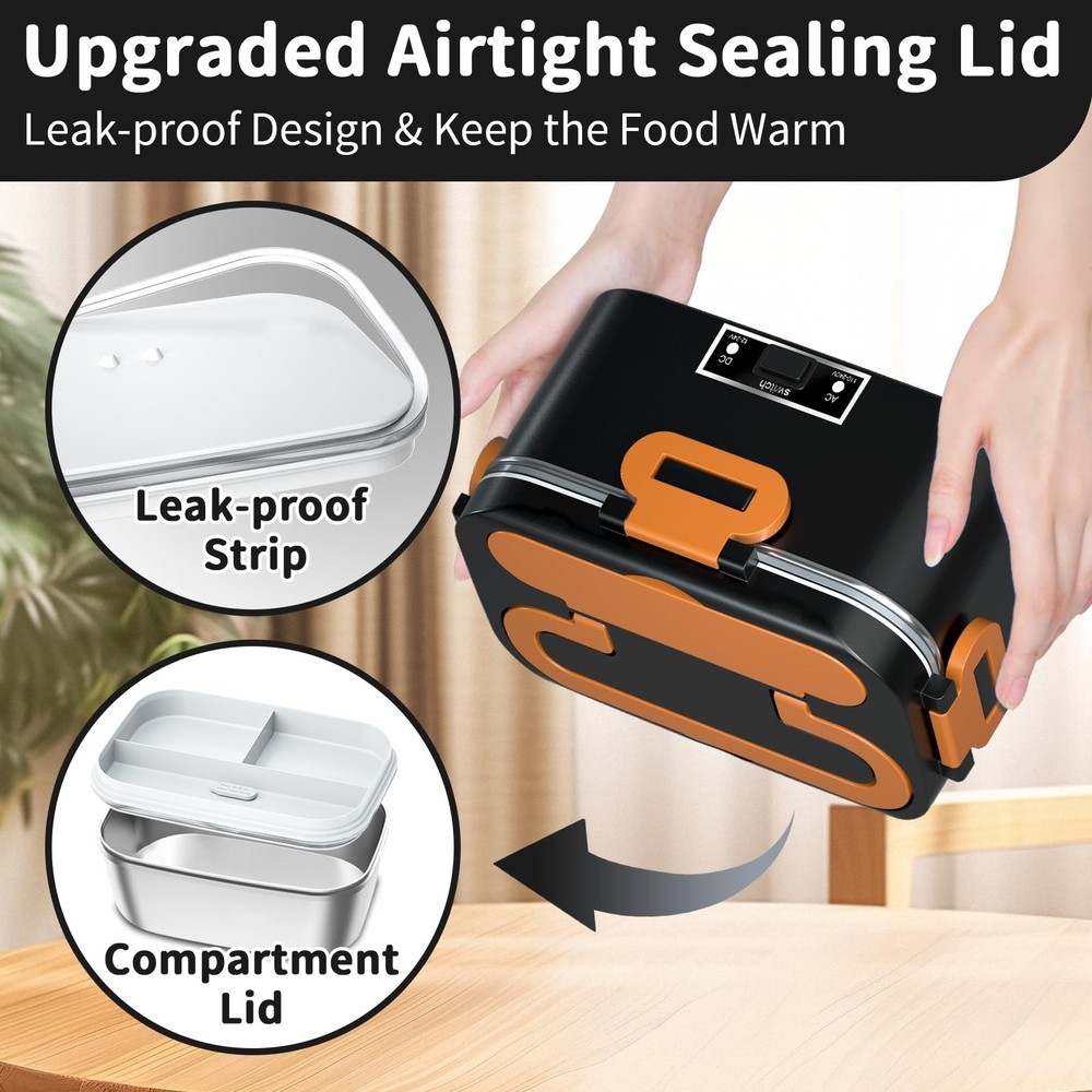 electric lunch box for adults electric lunch box for men heated lunch box electric lunch box food heater electric heating lunch boxes lunch electric lunch box for men heating lunch box Upgraded 10 Minutes 3 Times Faster Heated Lunch Boxes - The upgraded heated lunch box heats your lunch 3 times faster than others, taking just 10 minutes to warm up your meal at the office or home and enjoy the hot and delicious meal. Enjoy a more extended lunch break at the office. 2 Pack 1.8L Containers Included - The removable container has 2 pack 1.8L containers( compartment and single one) ! Enjoy the flexibility electric lunch box to match your lunch content, provides the convenience for your daily lunch! 3 IN 1 Fast Heating Lunch Boxes for Adults - The heated lunch box food warmer comes with two power cords (110V/24V/12V), 110V for office, 24V for car, 12V for truck. Elevate your dining experience with convenience and comfort! Stylish Exclusive Design - Elevate your lunchtime experience with our exclusive designed electric lunch box for adults. From its carefully crafted silhouette to the thoughtful ear clasp and handle design. Say Goodbye to Cold Meals - Say hello to our 3-IN-1 electric lunch box! Simply plug it in and relish your warm meals! Whether you're on a work trip, in your car, or at your truck, this electric lunch box is your solution. Say goodbye to microwave queues by heating your lunch conveniently beforehand. Easy to Clean - The removable container and Tight-Seal Lid for the electric lunch box is dishwash safe.