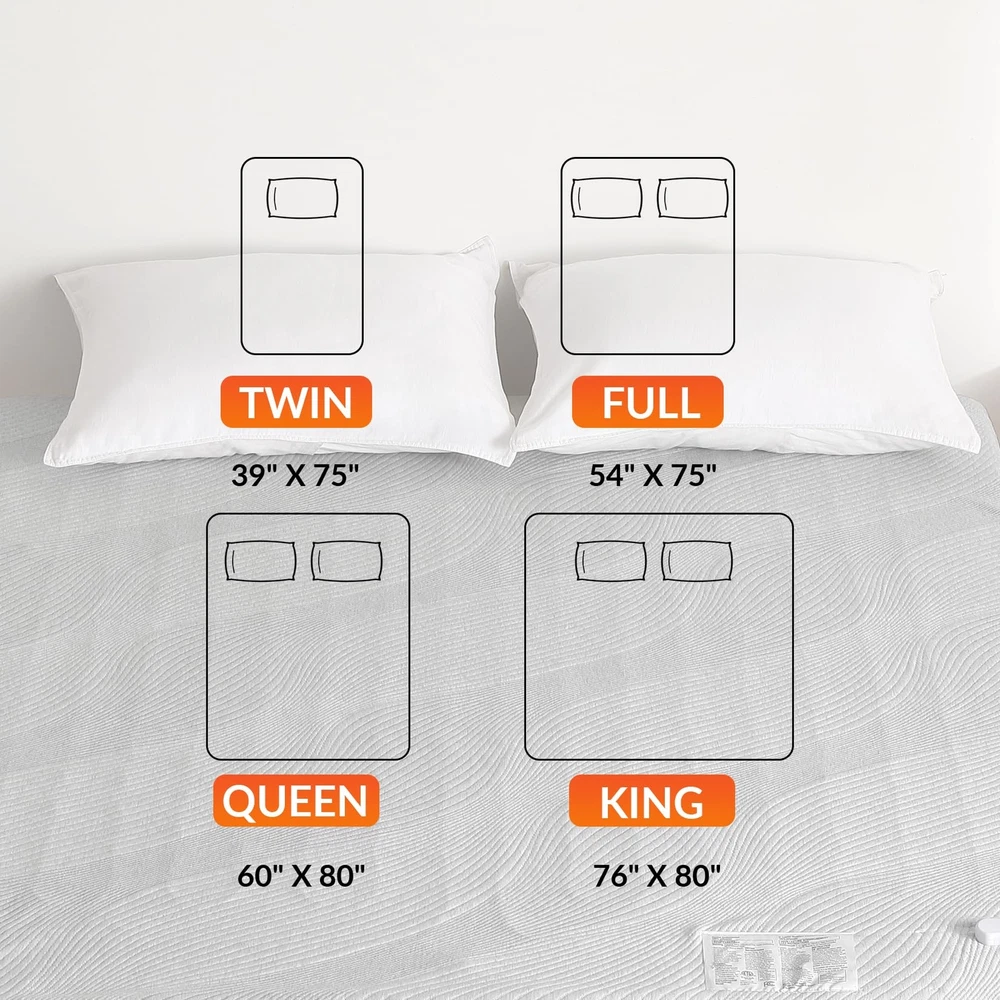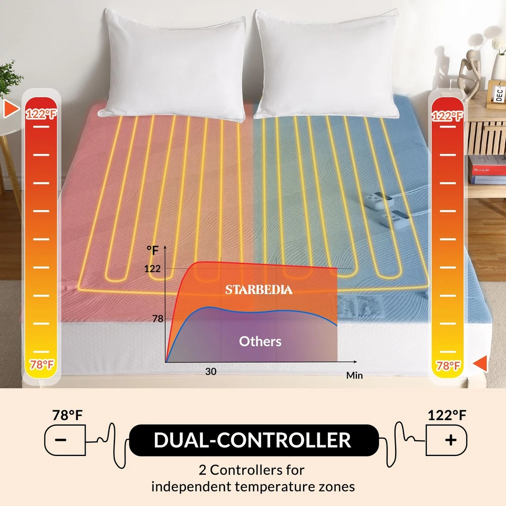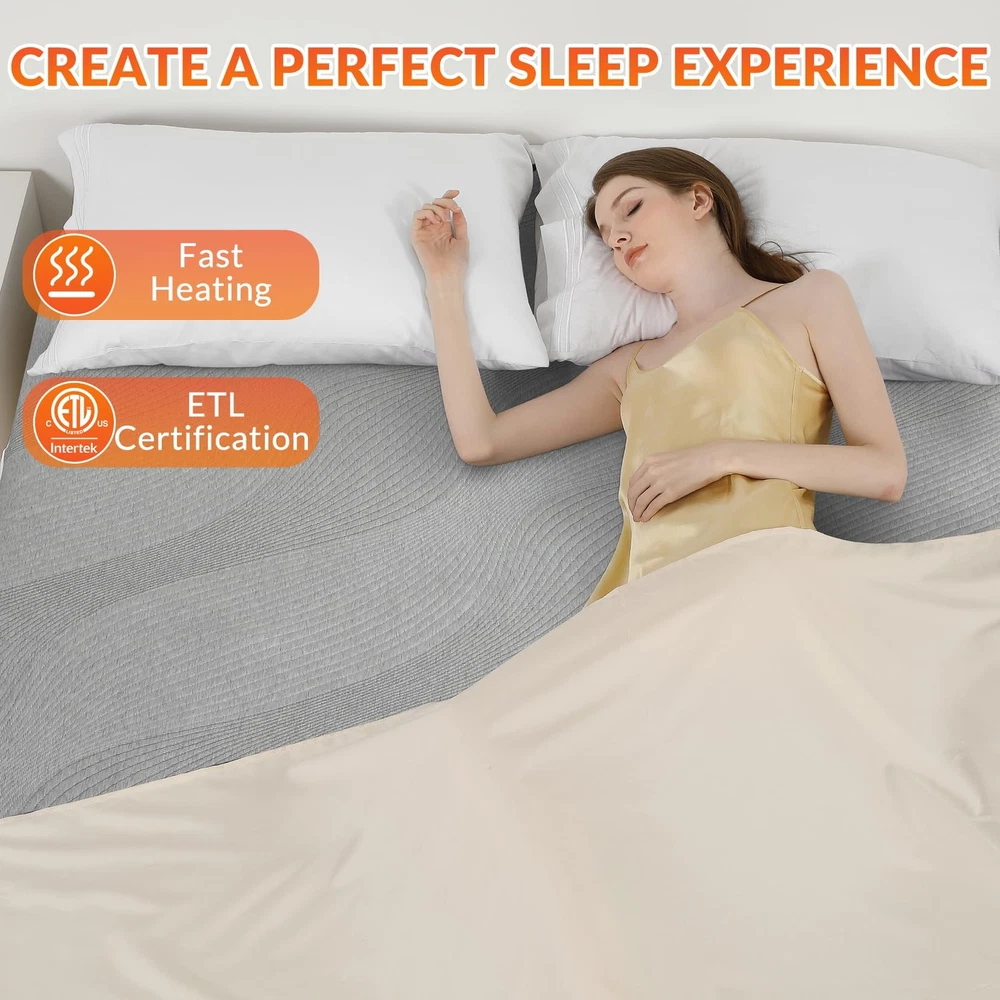 Experience the ultimate in comfort and convenience with our premium heated mattress pad. Made of high-quality air layer fabric, it offers a soft and fluffy touch while ensuring excellent breathability, regulating temperature and moisture for a cozy sleep environment. The delicately designed striped pattern adds elegance to any bedroom decor. With our one-touch controller, adjusting the temperature is a breeze. Choose from 5 heat settings (86℉ to 112℉) and feel the pad warm up in just 30 minutes, providing a cozy embrace. The elasticized edge ensures a perfect fit for mattresses up to 18 inches deep, preventing slipping and maintaining a tidy bed. Safety is paramount, as our electric mattress cover is ETL certified, and the 10-hour automatic shut-off function promotes energy efficiency. Cleaning is effortless with the machine washable feature. Remove the controller and toss it in the washing machine for a hygienic and allergen-free sleeping surface. Enjoy the perfect blend of comfort, convenience, and safety with our feature-packed heated mattress pad. 【Premium Fabric】Made of high-quality air layer fabric, the heated mattress pad not only provides a soft and fluffy touch but also ensures excellent breathability. This helps to regulate temperature and moisture, creating a comfortable and cozy sleeping environment. The delicately designed striped pattern adds a touch of elegance and beauty to any bedroom decor. 【Dual Control】The dual controller allows for independent temperature control in two separate zones, accommodating the needs of two individuals. Each controller offers 10 heat settings ranging from a gentle warmth of 78℉ to a toasty 122℉, both partners can enjoy your desired level of warmth and comfort throughout the night. Achieving the perfect temperature is quick and easy, thanks to the fast heat-up time of just 30 minutes. 【Perfect Fit】The elasticized edge of the heating mattress pad is designed to fit most mattresses depths of up to 18 inches. The strong elasticity ensures a snug and secure fit, preventing the cover from slipping or bunching up during the night. This not only provides a hassle-free sleep experience but also helps to maintain the overall appearance of the bed, giving it a neat and tidy look. 【Safe & Efficient】Safety is a top priority with the queen electric mattress pad cover. Rest easy with the ETL certification, guaranteeing the highest safety standards. The built-in 10-hour automatic shut-off function is not only convenient but also promotes energy efficiency, reducing the risk of overheating and conserving electricity. 【Machine Washable】Maintaining cleanliness is a breeze with our machine washable heated mattress pad cover. Just remove the controller and toss the mattress pad into the washing machine for a convenient and hassle-free cleaning experience. Say goodbye to time-consuming hand washing and enjoy a fresh and clean mattress pad cover with ease.
