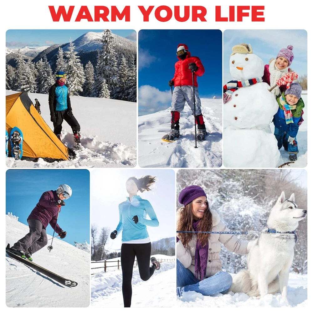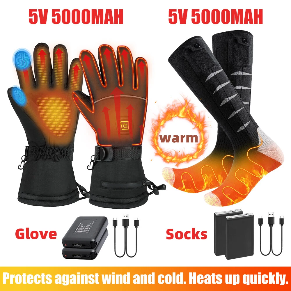 1 Pair electric heated gloves Specifications: 2x Palm leather model gloves + 2x 5V/6000mAh Power bank + USB charging cables Use Category: Skiing/Leisure/Sports Function: waterproof, non-slip, touch screen, warm, windproof, self-heating Size: XL Season: Winter Applicable object: middle and high consumption crowd Applicable age group: adult Fabric Name: Polyester Main fabric composition: polyester (polyester fibre) Charging treasure: 5V 6000 mAh, constant temperature 2.5-6 hours Use Scene:Skiing, cycling, outdoor and so on Packing list: Gloves *2 Charging treasure *2 USB cable *1 ============================================================================================ 1 Pair electric heated socks Features: 【Full Foot Coverage Heating】Hidden heating pad covers the entire area from the toes to the heel delivering warm blood to the whole body through the blood vessels. Also features a newly designed inline heating pad and almost imperceptible ultra-thin wire dramatically reducing the sensation of foreign bodies on the bottom of the foot 【Swift Heat Performance】Powered by high-capacity 5V 5000mAh battery electric socks deliver rapid and efficient heating. Surpassing traditional solutions they generate more abundant and even warmth ensuring consistent comfort in cold outdoor conditions 【4 Heating Levels】Choose your idea l warmth with four adjustable temperature settings. Equipped with two independent 5V 5000mAh rechargeable batteries, you'll enjoy 3-8 hours of continuous heating. Select from three temperature options (45/55/65°C) to adapt to various outdoor environments(Press 2S to start heating) 【Enhanced Fit & Durability】Crafted from supple Modal fabric heated socks offer exceptional elasticity and comfort. The reinforced heel is made from wear-resistant and anti-pilling mink suede and wool ensuring enduring quality 【Free Movement】Rechargeable battery has a separate fixed inner pocket and the opening has been upgraded to an elasticated fixation. Even when skiing, skating, cycling and other strenuous activities, the battery will not fall out. so you can move freely without any burden Electric heated socks for men and women are an excellent choice for outdoor activities such as skiing, hiking, hunting, snow shoveling, ice fishing, horseback riding, motorcycling, cycling and other cold-weather pursuits. The exquisite packaging makes them an ideal gift Main size: toe to heel 21cm, heel to sock 33cm Packing list: Box *1 Instruction manual *1 Socks *2 Battery *2 Charging cable *1 =========================================================================== 1 Pair Hand Warmers About this item: Compact and Portable: Perfectly sized to fit in your pocket or bag, our hand warmers provide on-the-go warmth without bulk. Three Adjustable Temperature Levels: Choose from low, medium, or high heat settings to customize your warmth experience and stay comfortable in any weather. Convenient LED Disp lay : Easily monitor your chosen temperature setting with the clear, intuitive LED display. Value Pack of 2: Comes with two hand warmers, so you can keep one in your bag and one at home, or share the warmth with a friend or loved one. Ideal Gift Choice: A thoughtful and practical gift for anyone who loves outdoor activities or needs extra warmth during the colder months.