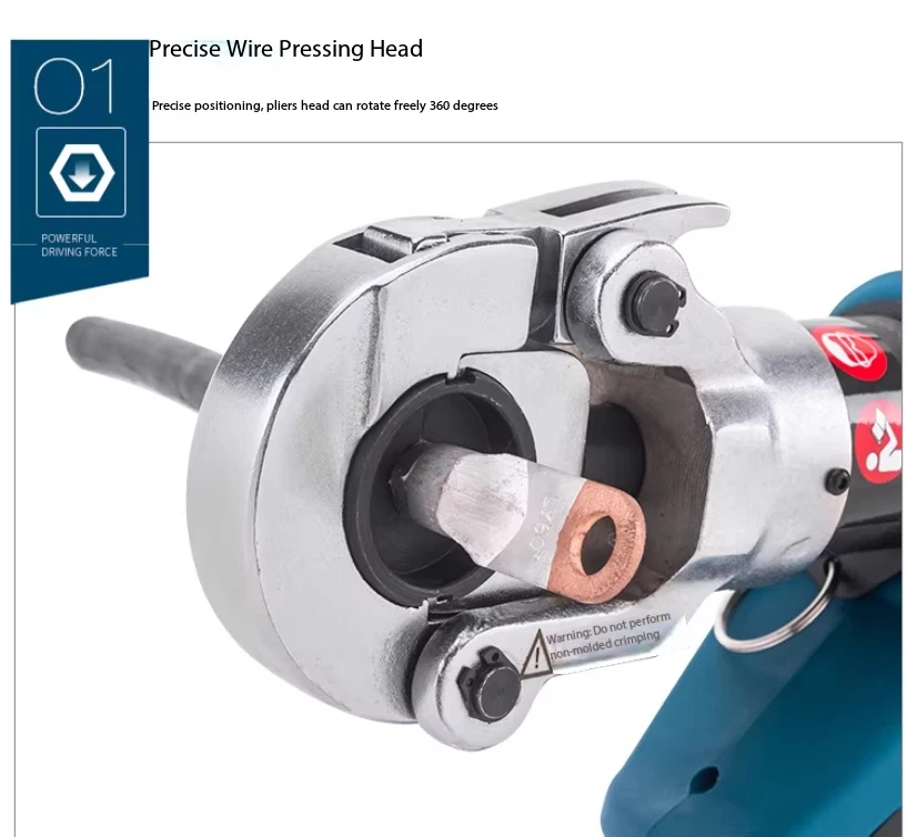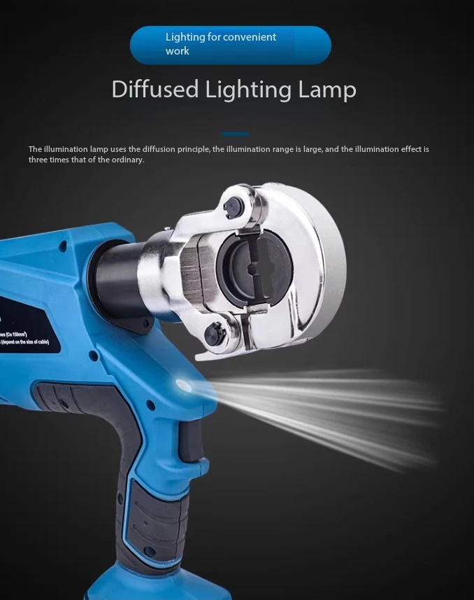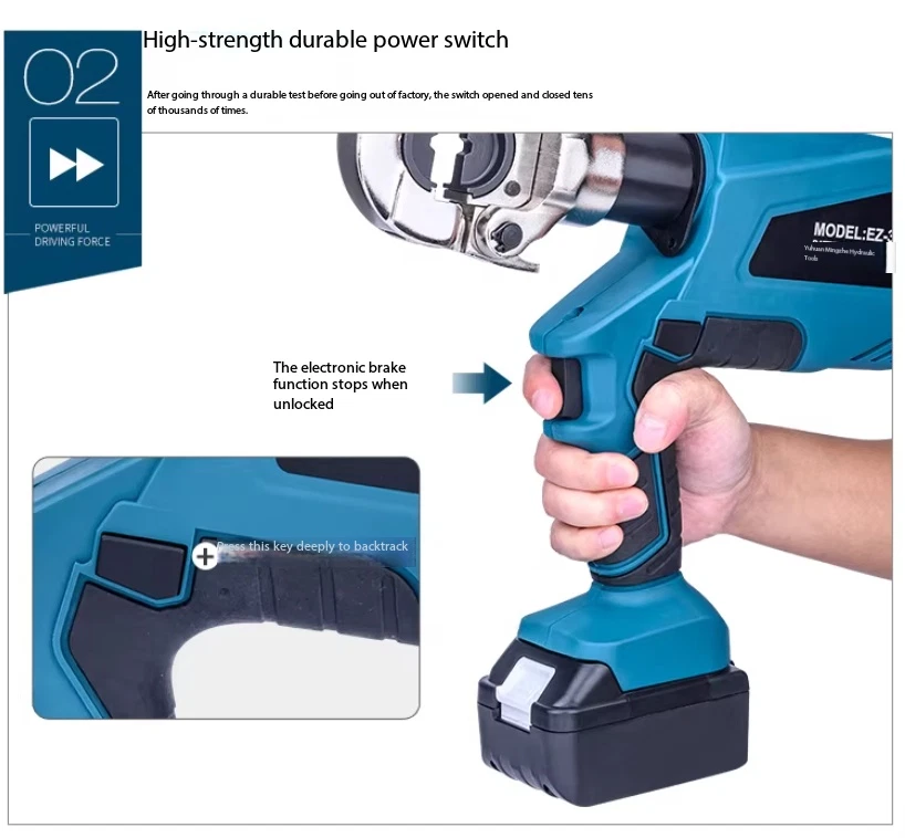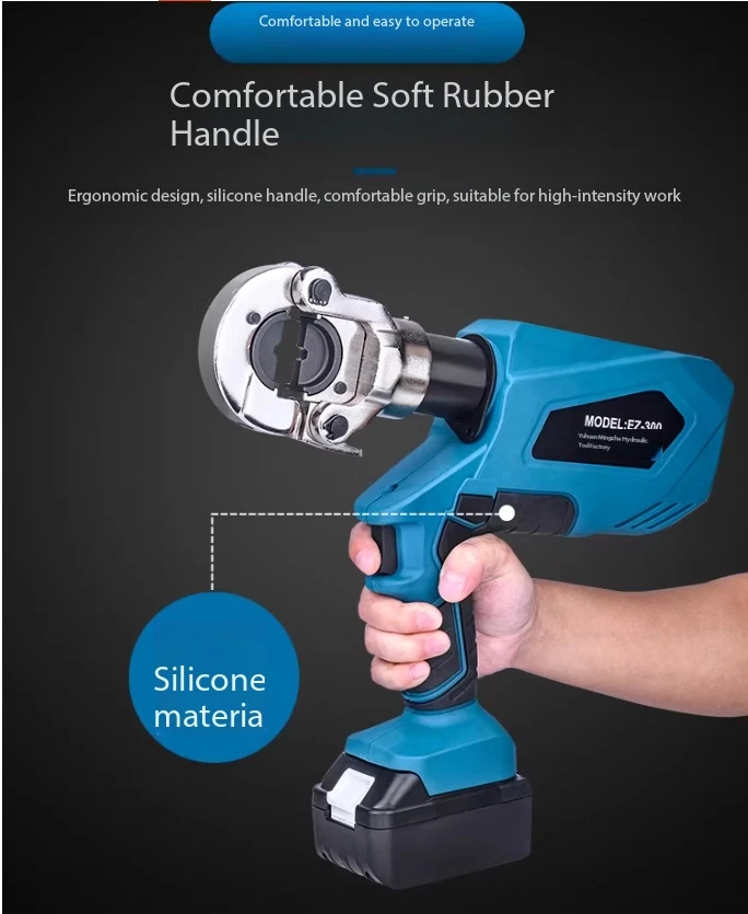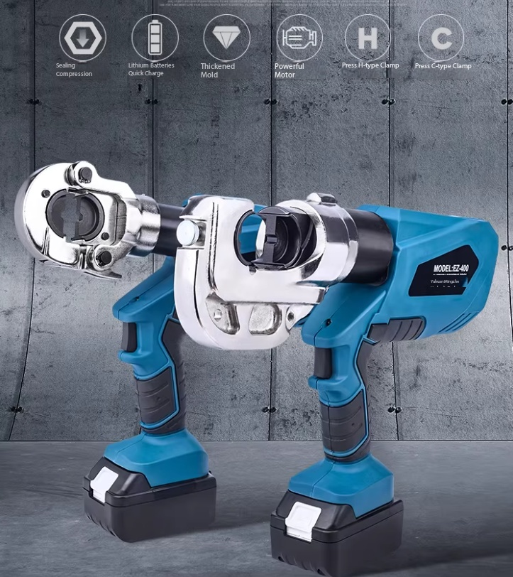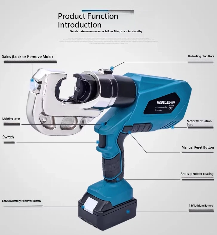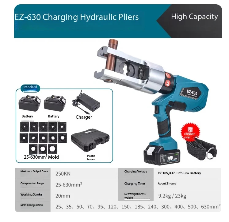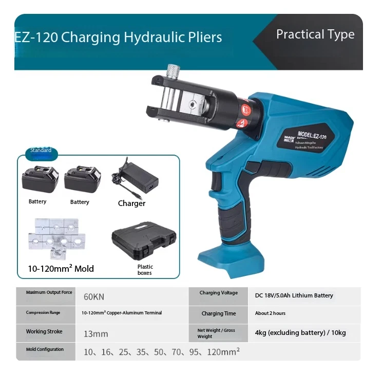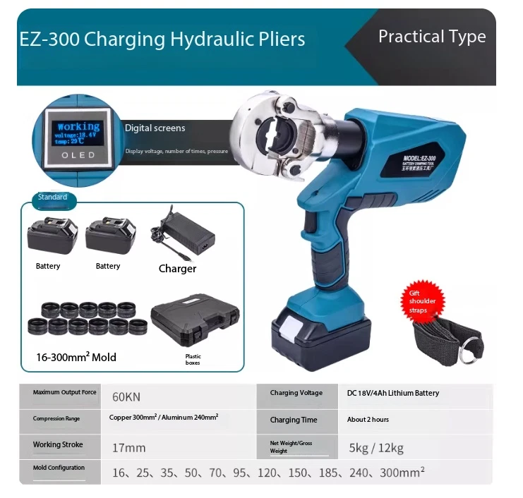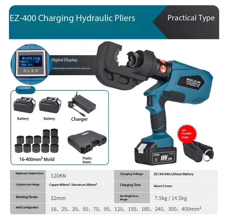 Electric Hydraulic Crimping Pliers Rechargeable Crimping PliersTerminal Crimping EZ-400 Maximum Output Force: 120 kN Crimping Range: Copper 400 mm² / Aluminum 300 mm² Working Stroke: 32 mm Die Configurations: 16, 25, 35, 50, 70, 95, 120, 150, 185, 240, 300, 400 mm² Charging Voltage: DC 18V / 4Ah battery Charging Time: Approx. 2 hours Net Weight / Gross Weight: 7.5 kg / 14.5 kg