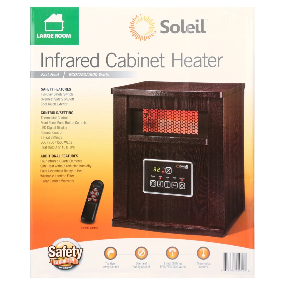 Keep a living room, bedroom, dining room, office or kitchen warmer with the Soleil Infrared Cabinet Heater. It makes your space comfortable because it heats without reducing humidity or oxygen. It is constructed of sturdy and durable materials for a longer life. This 1,500W heater features four infrared quartz elements for maximum results. It is equipped with several safety features, such as a tip-over switch. It also provides overheating protection as well. The Soleil cabinet heater saves energy and has three settings on the front panel. The low settings are for 750W and the highest setting utilizes the full 1,500W. This infrared heater has an LED display with easy-to-push button controls. It uses a conventional 110V three-prong outlet, so you can plug it in anywhere in the home. It includes a handy remote control for added convenience Soleil Infrared 4-Element Quartz Electric Room Heater with Remote, 750/1500 Watt, Walnut Color Cabinet WH-94H: Energy saving auto mode Low setting: 750W High setting: 1,500W Soleil cabinet heater features front panel push button controls LED display Remote control 4 infrared quartz elements Overheating protection Safety tip-over switch Uses conventional 110V 3-prong outlet 1,500W infrared heater will heat a designated space without reducing humidity or oxygen Model# WH-94H Compact size is inconspicuous Product Dimensions: 11.8 x 12.2 x 14.5 inches 5,100 BTU