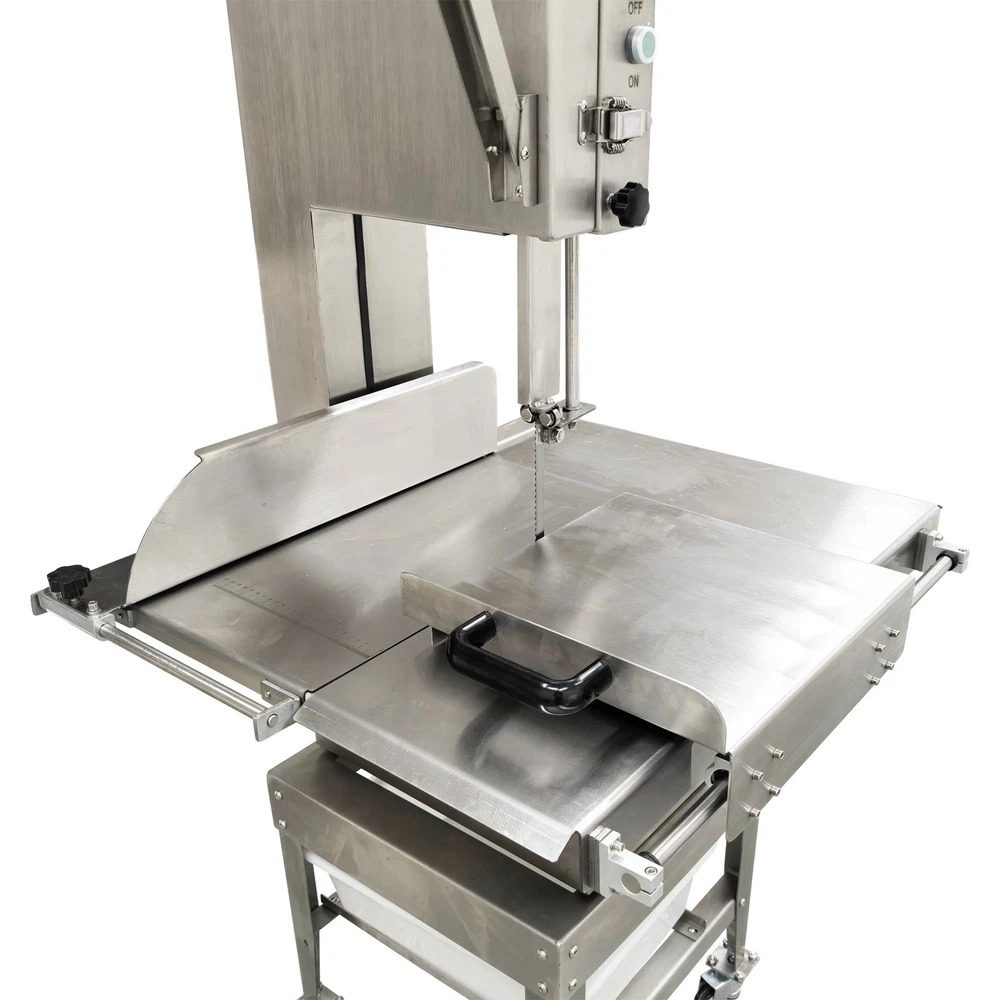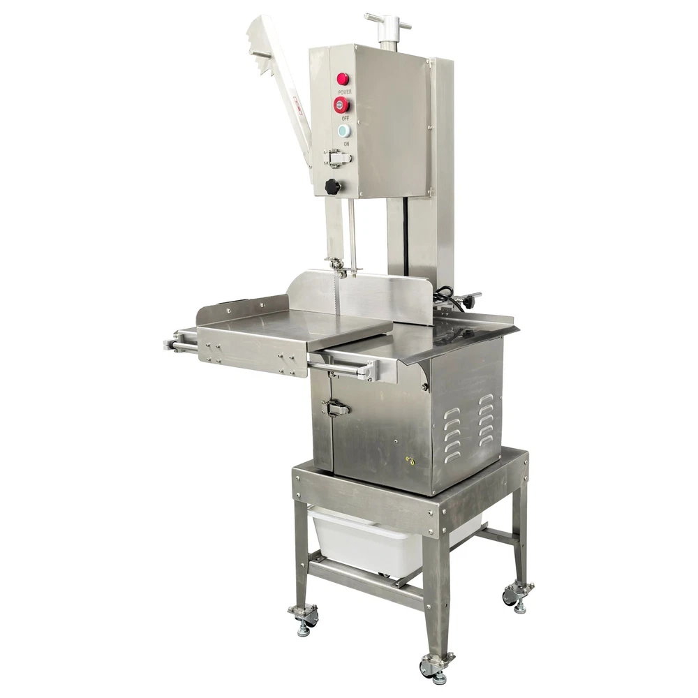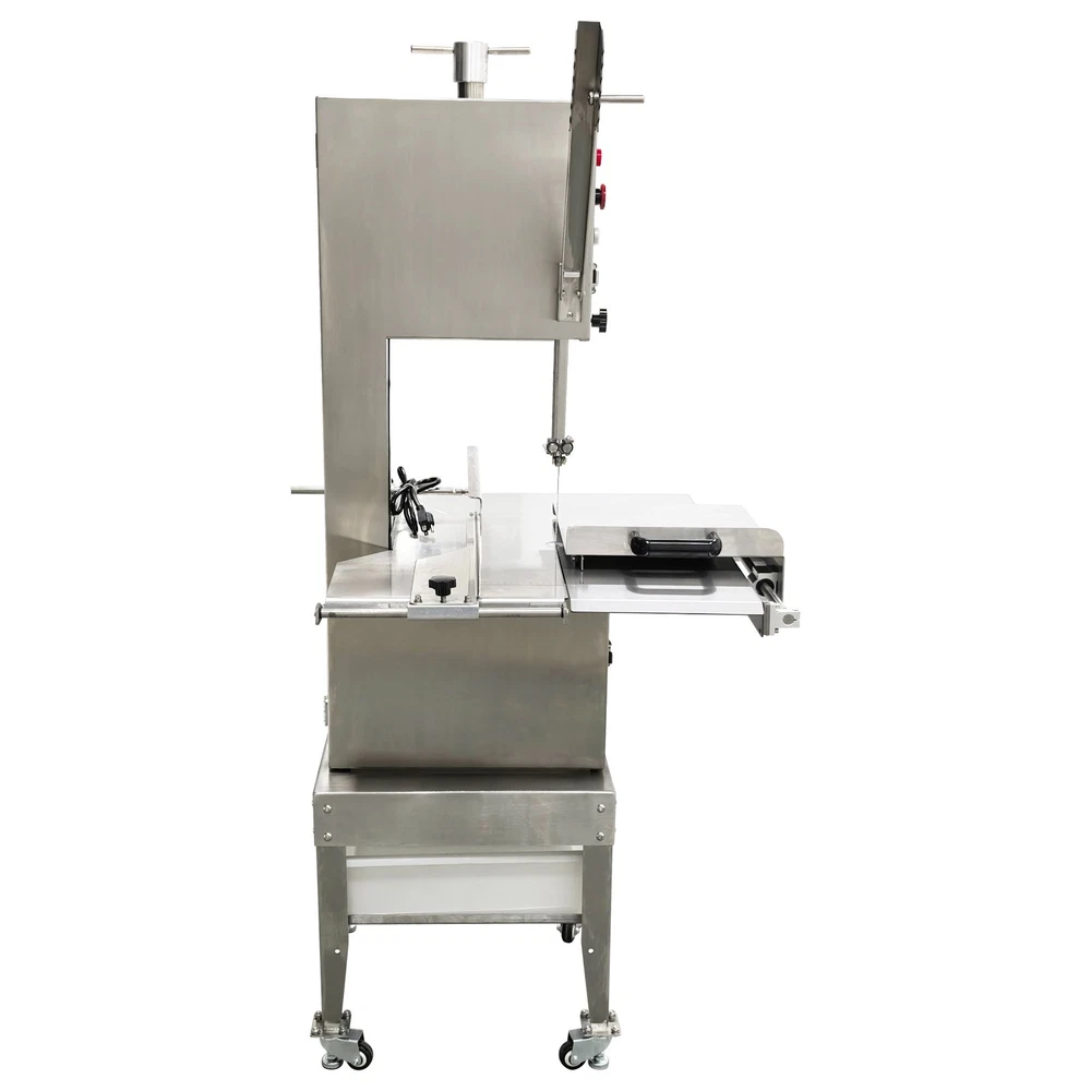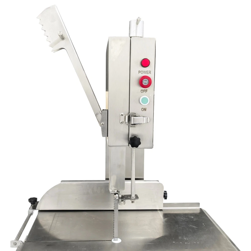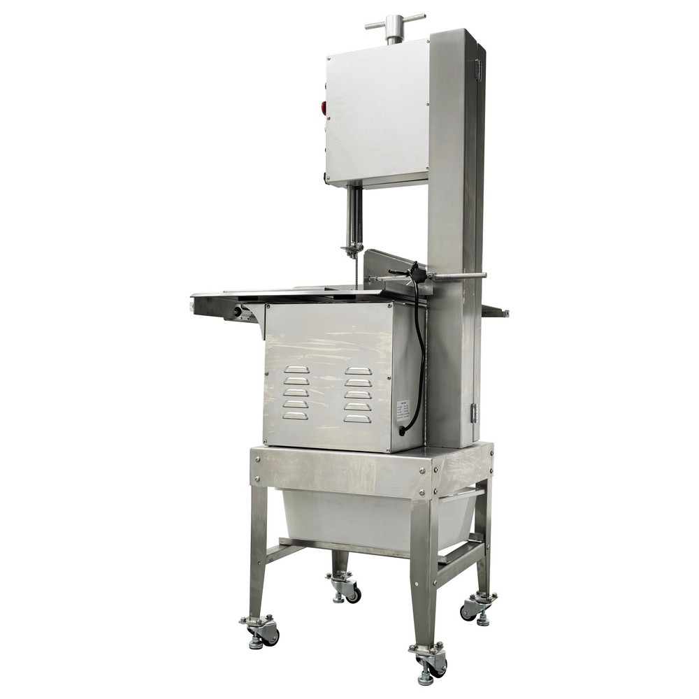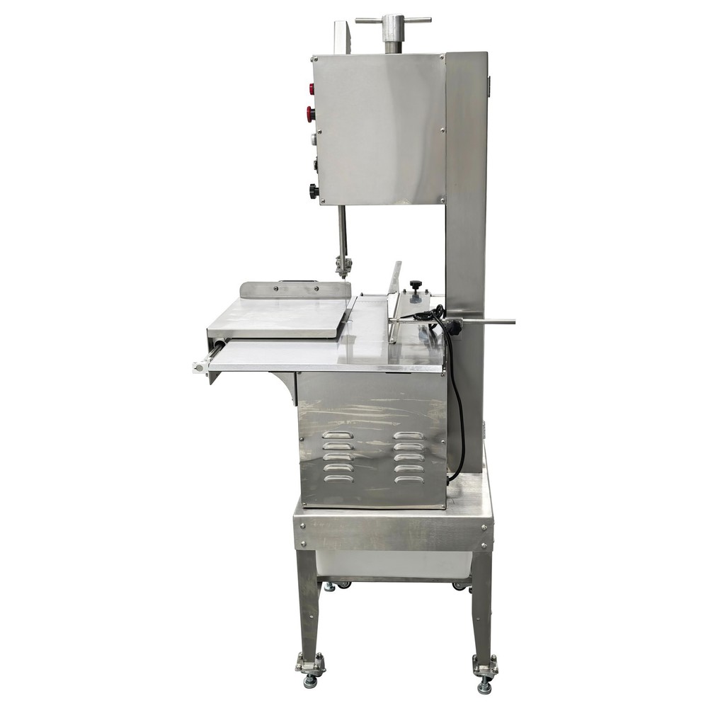 Electric Commercial Bone Sawing Machine 110V Product Overview The electric commercial bone sawing machine is a special device for accurately and efficiently cutting large meat and bones, such as frozen meat, hams, ribs and steaks. It is equipped with a large operation platform, a sliding plate and a 1.8KW motor so that the bone sawing machine can improve the working efficiency, reduce the labor intensity and safety risks and be widely applied to meat processing and cutting. Product Parameters Model HR-300A Voltage 110V 60Hz Power 1800W Output 0.8-1t/h Pulley diameter 30cm (11.81in) Waterproof level IPx1 Blade length 240cm (94.49in) Cutting height 34.5cm (13.58in) Cutting thickness 25cm (9.84in) Product size 74x64x170cm (29.13in x 25.2in x 5.58ft) Product Features 1. High-quality stainless steel materials, attractive appearance, exquisite workmanship, firm and durable, and resistant to rust and corrosion. 2. 1.8KW high-performance motor, provide high power for cutting operation, high cutting efficiency, more stable operating performance and longer service life. 3. Larger operation platform, the size is 29.13’’x25.2’’, larger food materials can be easily cut, and it better ensures the health and sanitation. 4. Easy and convenient to operate, cutting is easily achieved through a few buttons. 5. Two feeding modes can be flexibly selected, the food materials can be pushed on the movable push plate or the fixed table. 6. Sharp saw blade, with the length of 2400mm, can quickly and stably cut the food materials and has high cutting efficiency. 7. Stable supporting base with four universal wheels and supporting legs, keep the machine body balanced, free of vibration in the working process, and convenient to move and fix. 8. Two material baffle fastening knobs and two safety buckles, stably fix the material baffle and double doors in the working process, and achieve a good fastening effect. 9. Multiple safety protection measures to ensure safe operation of the machine and personal safety of the operators. 10. Wide application, suitable for cutting different foods materials and applicable to different occasions. A sliding push plate is movably arranged on the operating platform, and there two feeding modes can be freely selected by the user as needed. The user can place the food materials on the push plate and then push the sliding push plate to feed the materials. The user can also turn over the sliding push plate outwards, place the food materials on the operating platform and directly push the food materials manually to conduct cutting operation. The cutting operation is smooth and quick no matter when the sliding push plate is used or not. The bone sawing machine is equipped with a high-performance motor with the 1.8KW power. The high-power motor can provide the higher torque to easily cut hard bones and frozen products and prevent the saw blade from getting stuck. It has the more stable operating performance, achieves the more stable power output and has a longer service life. The high-quality sharp saw blade with the length of being 2400mm is used for quickly and stably cutting the food materials under the action of the stainless steel bearing clamp saw stabilizing base. The saw blade is firm and durable, can cut meat and bones for a long time and has good performance. The power switch, the emergency switch and the on/off switch are integrated on the front side of the upper machine box clearly and visibly, the operator can easily control and operate the machine, the operation difficulty and complexity are greatly reduced, and the operation is easy and convenient. A spare saw blade and a water gun are additionally provided for the customer. The worn saw blade can be replaced after working for a long time. The bone sawing machine can be cleaned with the water gun after cutting is finished. The maintenance cost is lower, cleaning is easier and faster, and the operator can easily maintain and repair the bone sawing machine. Multiple fastening parts are installed on the machine to achieve a good fastening effect. Two safety buckles are installed on the upper and lower machine boxes correspondingly for tightly locking and easily opening the box doors. Two material baffle fastening and reinforcing knobs are arranged on the two sides of the material baffle and can fix and loosen the material baffle as required after the material baffle is pushed or fixed. The operating practicability is well enhanced, and the convenience is greatly improved. Multiple safety protection measures are taken to ensure the operating safety and the personal safety. The meat push rod can be used for pushing the bones to be cut so as to avoid cutting accidents. The emergency switch can be pressed immediately in emergency to stop the machine. The machine can automatically stop working when the saw blade breakage phenomenon is detected or the machine box door is opened. Dual waterproof protection is adopted by the motor to ensure the normal operation of the motor. By means of these parts, the safety can be guaranteed to the maximum extent. A stable supporting base is arranged at the bottom and designed for supporting and fixing the machine body stably. Four universal wheel and supporting leg assemblies are installed at the four corners of the supporting base so that the bone sawing machine can be moved and fixed conveniently and easily. There is no vibration and swing in the working process, and the stability is greatly improved. Application The commercial bone sawing machine is equipped with a larger operation platform and higher power, so that it can cut different large and heavy food materials neatly and efficiently, such as ribs, steaks, bones, frozen meat and pig trotters and can be widely applied to multiple application occasions, such as restaurants, hotels, meat stalls, slaughterhouses, meat plants and supermarkets. It is the best choice for meat and bone processing. Product Display Item Number (120100): 1 x Ele