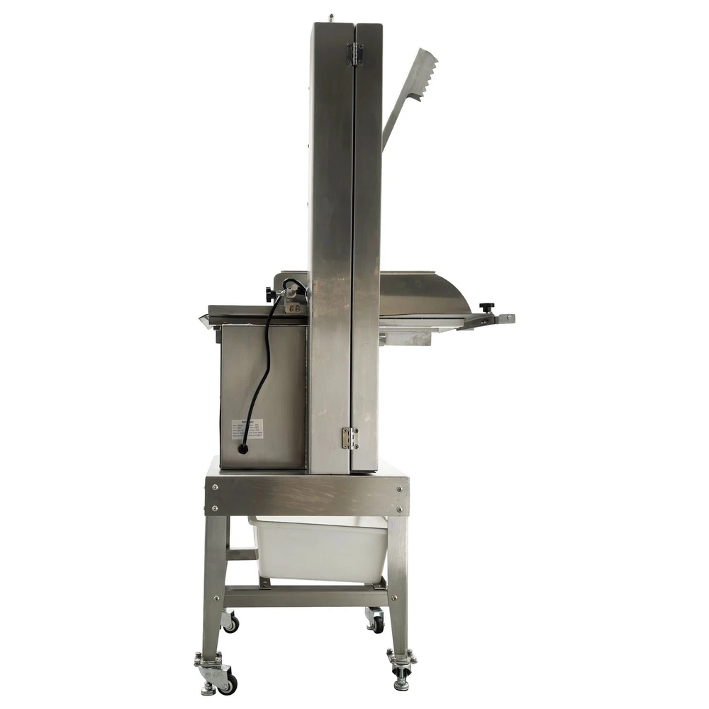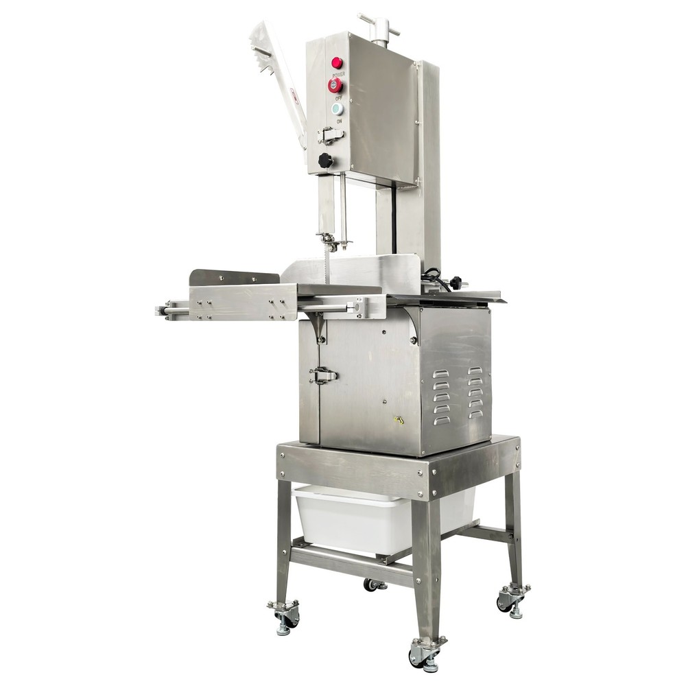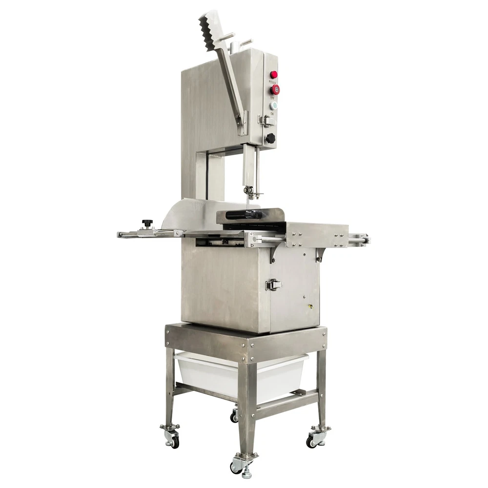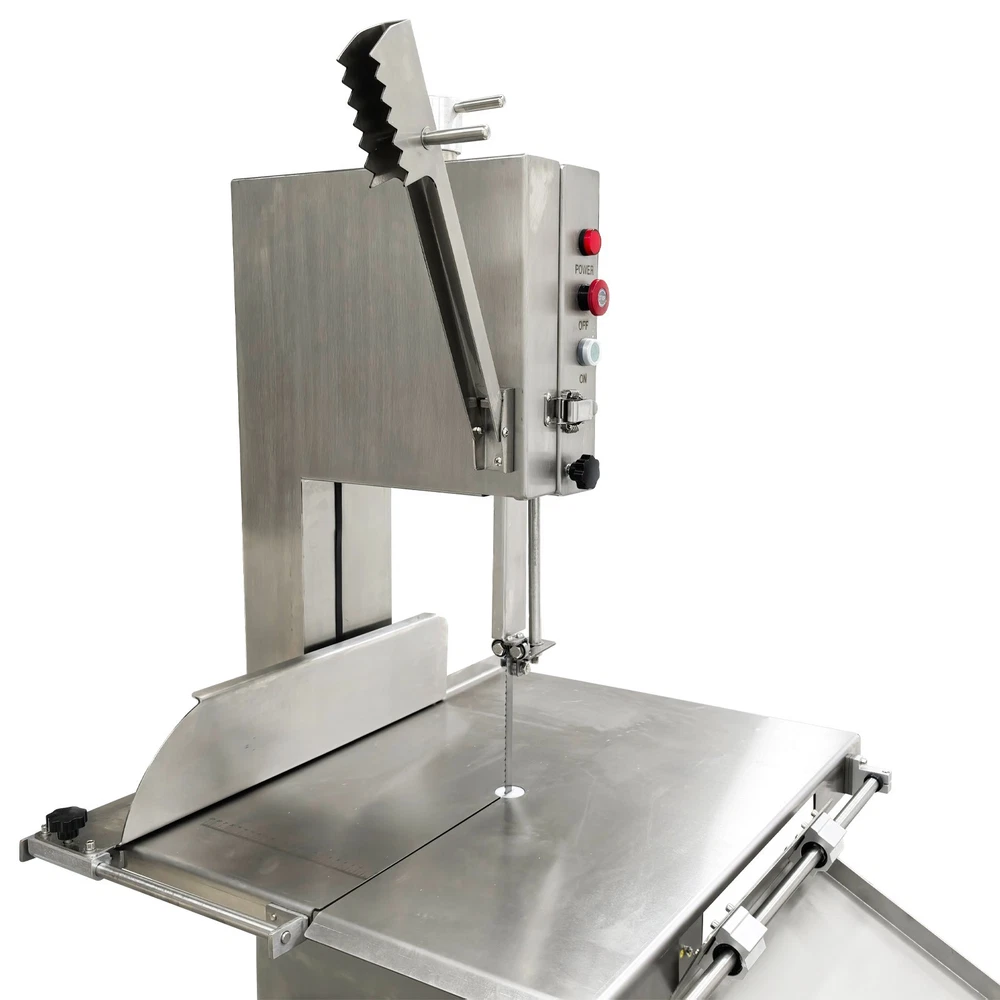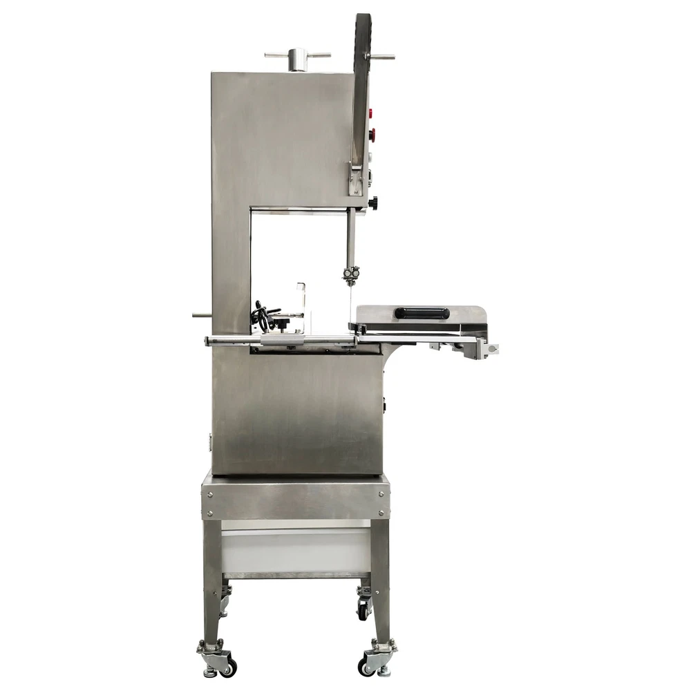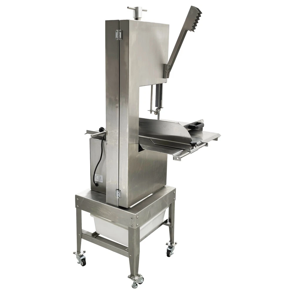Electric Commercial Bone Sawing Machine 110V Product Overview The electric commercial bone sawing machine is a special device for accurately and efficiently cutting large meat and bones, such as frozen meat, hams, ribs and steaks. It is equipped with a large operation platform, a sliding plate and a 1.8KW motor so that the bone sawing machine can improve the working efficiency, reduce the labor intensity and safety risks and be widely applied to meat processing and cutting. Product Parameters Model HR-300A Voltage 110V 60Hz Power 1800W Output 0.8-1t/h Pulley diameter 30cm (11.81in) Waterproof level IPx1 Blade length 240cm (94.49in) Cutting height 34.5cm (13.58in) Cutting thickness 25cm (9.84in) Product size 74x64x170cm (29.13in x 25.2in x 5.58ft) Product Features 1. High-quality stainless steel materials, attractive appearance, exquisite workmanship, firm and durable, and resistant to rust and corrosion. 2. 1.8KW high-performance motor, provide high power for cutting operation, high cutting efficiency, more stable operating performance and longer service life. 3. Larger operation platform, the size is 29.13’’x25.2’’, larger food materials can be easily cut, and it better ensures the health and sanitation. 4. Easy and convenient to operate, cutting is easily achieved through a few buttons. 5. Two feeding modes can be flexibly selected, the food materials can be pushed on the movable push plate or the fixed table. 6. Sharp saw blade, with the length of 2400mm, can quickly and stably cut the food materials and has high cutting efficiency. 7. Stable supporting base with four universal wheels and supporting legs, keep the machine body balanced, free of vibration in the working process, and convenient to move and fix. 8. Two material baffle fastening knobs and two safety buckles, stably fix the material baffle and double doors in the working process, and achieve a good fastening effect. 9. Multiple safety protection measures to ensure safe operation of the machine and personal safety of the operators. 10. Wide application, suitable for cutting different foods materials and applicable to different occasions. A sliding push plate is movably arranged on the operating platform, and there two feeding modes can be freely selected by the user as needed. The user can place the food materials on the push plate and then push the sliding push plate to feed the materials. The user can also turn over the sliding push plate outwards, place the food materials on the operating platform and directly push the food materials manually to conduct cutting operation. The cutting operation is smooth and quick no matter when the sliding push plate is used or not. The bone sawing machine is equipped with a high-performance motor with the 1.8KW power. The high-power motor can provide the higher torque to easily cut hard bones and frozen products and prevent the saw blade from getting stuck. It has the more stable operating performance, achieves the more stable power output and has a longer service life. The high-quality sharp saw blade with the length of being 2400mm is used for quickly and stably cutting the food materials under the action of the stainless steel bearing clamp saw stabilizing base. The saw blade is firm and durable, can cut meat and bones for a long time and has good performance. The power switch, the emergency switch and the on/off switch are integrated on the front side of the upper machine box clearly and visibly, the operator can easily control and operate the machine, the operation difficulty and complexity are greatly reduced, and the operation is easy and convenient. A spare saw blade and a water gun are additionally provided for the customer. The worn saw blade can be replaced after working for a long time. The bone sawing machine can be cleaned with the water gun after cutting is finished. The maintenance cost is lower, cleaning is easier and faster, and the operator can easily maintain and repair the bone sawing machine. Multiple fastening parts are installed on the machine to achieve a good fastening effect. Two safety buckles are installed on the upper and lower machine boxes correspondingly for tightly locking and easily opening the box doors. Two material baffle fastening and reinforcing knobs are arranged on the two sides of the material baffle and can fix and loosen the material baffle as required after the material baffle is pushed or fixed. The operating practicability is well enhanced, and the convenience is greatly improved. Multiple safety protection measures are taken to ensure the operating safety and the personal safety. The meat push rod can be used for pushing the bones to be cut so as to avoid cutting accidents. The emergency switch can be pressed immediately in emergency to stop the machine. The machine can automatically stop working when the saw blade breakage phenomenon is detected or the machine box door is opened. Dual waterproof protection is adopted by the motor to ensure the normal operation of the motor. By means of these parts, the safety can be guaranteed to the maximum extent. A stable supporting base is arranged at the bottom and designed for supporting and fixing the machine body stably. Four universal wheel and supporting leg assemblies are installed at the four corners of the supporting base so that the bone sawing machine can be moved and fixed conveniently and easily. There is no vibration and swing in the working process, and the stability is greatly improved. Application The commercial bone sawing machine is equipped with a larger operation platform and higher power, so that it can cut different large and heavy food materials neatly and efficiently, such as ribs, steaks, bones, frozen meat and pig trotters and can be widely applied to multiple application occasions, such as restaurants, hotels, meat stalls, slaughterhouses, meat plants and supermarkets. It is the best choice for meat and bone processing. Product Display Item Number (120100): 1 x Ele