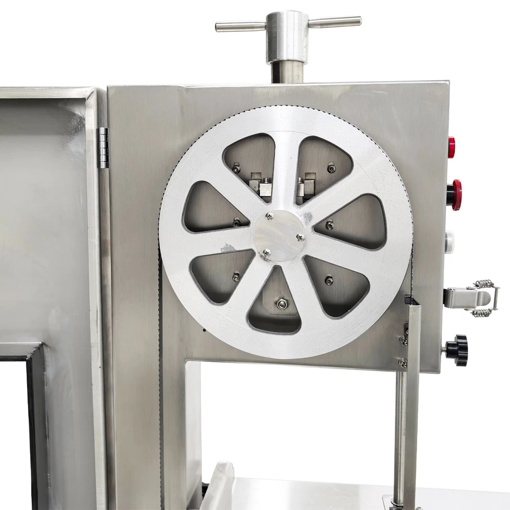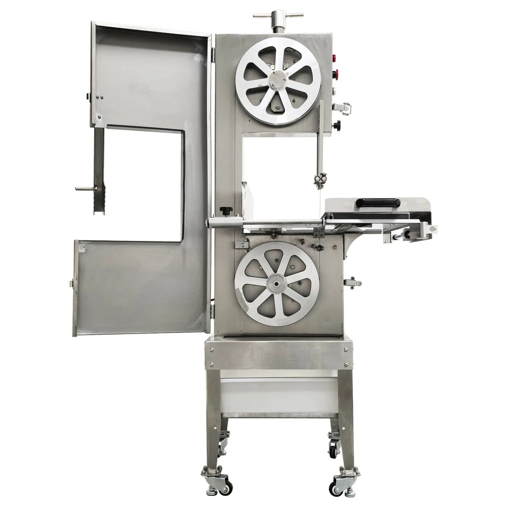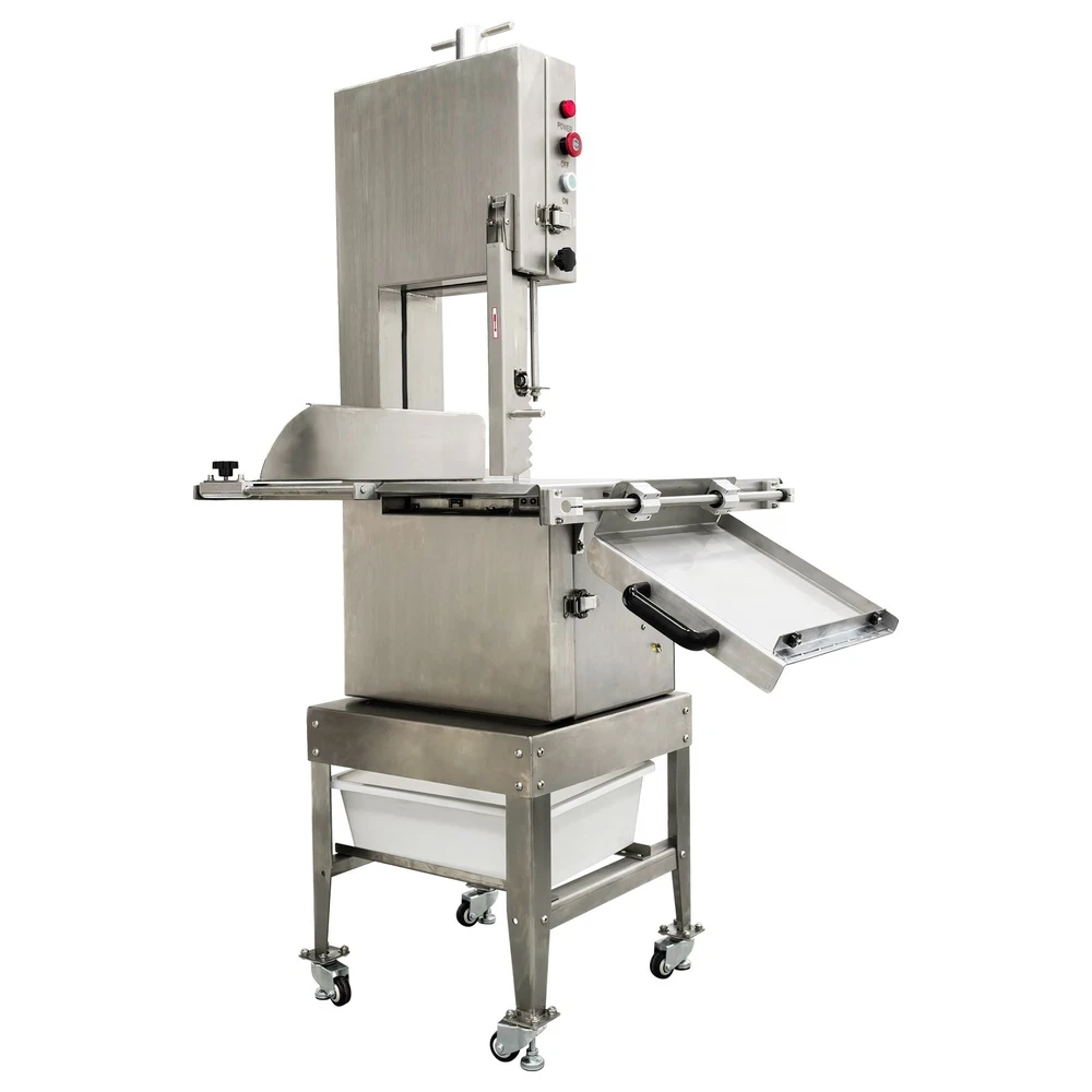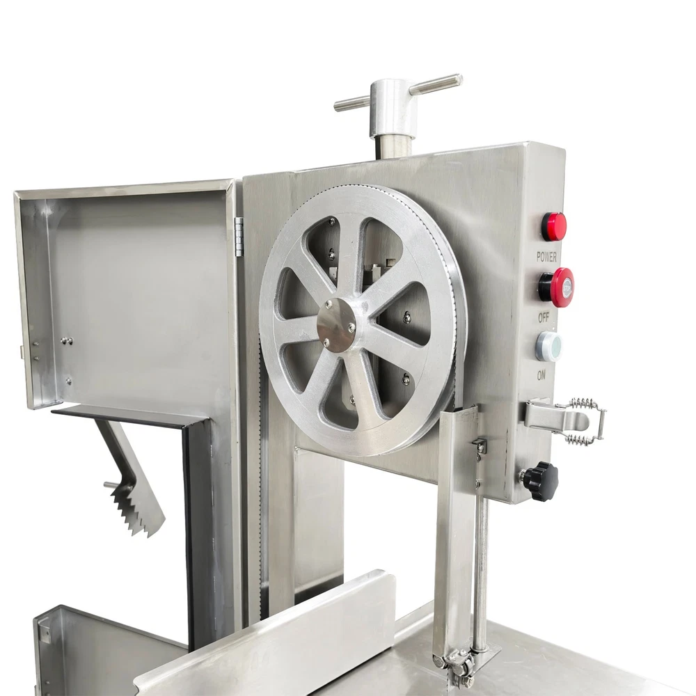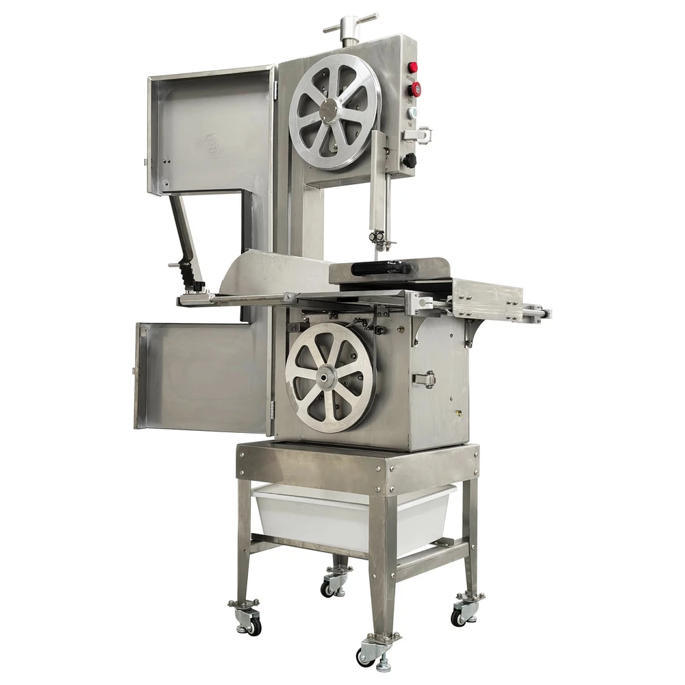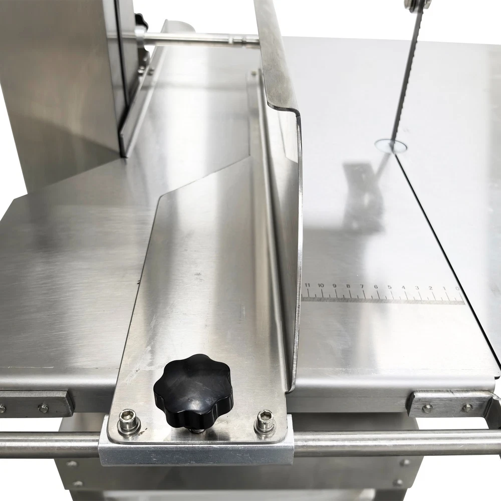 Electric Commercial Bone Sawing Machine 110V Product Overview The electric commercial bone sawing machine is a special device for accurately and efficiently cutting large meat and bones, such as frozen meat, hams, ribs and steaks. It is equipped with a large operation platform, a sliding plate and a 1.8KW motor so that the bone sawing machine can improve the working efficiency, reduce the labor intensity and safety risks and be widely applied to meat processing and cutting. Product Parameters Model HR-300A Voltage 110V 60Hz Power 1800W Output 0.8-1t/h Pulley diameter 30cm (11.81in) Waterproof level IPx1 Blade length 240cm (94.49in) Cutting height 34.5cm (13.58in) Cutting thickness 25cm (9.84in) Product size 74x64x170cm (29.13in x 25.2in x 5.58ft) Product Features 1. High-quality stainless steel materials, attractive appearance, exquisite workmanship, firm and durable, and resistant to rust and corrosion. 2. 1.8KW high-performance motor, provide high power for cutting operation, high cutting efficiency, more stable operating performance and longer service life. 3. Larger operation platform, the size is 29.13’’x25.2’’, larger food materials can be easily cut, and it better ensures the health and sanitation. 4. Easy and convenient to operate, cutting is easily achieved through a few buttons. 5. Two feeding modes can be flexibly selected, the food materials can be pushed on the movable push plate or the fixed table. 6. Sharp saw blade, with the length of 2400mm, can quickly and stably cut the food materials and has high cutting efficiency. 7. Stable supporting base with four universal wheels and supporting legs, keep the machine body balanced, free of vibration in the working process, and convenient to move and fix. 8. Two material baffle fastening knobs and two safety buckles, stably fix the material baffle and double doors in the working process, and achieve a good fastening effect. 9. Multiple safety protection measures to ensure safe operation of the machine and personal safety of the operators. 10. Wide application, suitable for cutting different foods materials and applicable to different occasions. A sliding push plate is movably arranged on the operating platform, and there two feeding modes can be freely selected by the user as needed. The user can place the food materials on the push plate and then push the sliding push plate to feed the materials. The user can also turn over the sliding push plate outwards, place the food materials on the operating platform and directly push the food materials manually to conduct cutting operation. The cutting operation is smooth and quick no matter when the sliding push plate is used or not. The bone sawing machine is equipped with a high-performance motor with the 1.8KW power. The high-power motor can provide the higher torque to easily cut hard bones and frozen products and prevent the saw blade from getting stuck. It has the more stable operating performance, achieves the more stable power output and has a longer service life. The high-quality sharp saw blade with the length of being 2400mm is used for quickly and stably cutting the food materials under the action of the stainless steel bearing clamp saw stabilizing base. The saw blade is firm and durable, can cut meat and bones for a long time and has good performance. The power switch, the emergency switch and the on/off switch are integrated on the front side of the upper machine box clearly and visibly, the operator can easily control and operate the machine, the operation difficulty and complexity are greatly reduced, and the operation is easy and convenient. A spare saw blade and a water gun are additionally provided for the customer. The worn saw blade can be replaced after working for a long time. The bone sawing machine can be cleaned with the water gun after cutting is finished. The maintenance cost is lower, cleaning is easier and faster, and the operator can easily maintain and repair the bone sawing machine. Multiple fastening parts are installed on the machine to achieve a good fastening effect. Two safety buckles are installed on the upper and lower machine boxes correspondingly for tightly locking and easily opening the box doors. Two material baffle fastening and reinforcing knobs are arranged on the two sides of the material baffle and can fix and loosen the material baffle as required after the material baffle is pushed or fixed. The operating practicability is well enhanced, and the convenience is greatly improved. Multiple safety protection measures are taken to ensure the operating safety and the personal safety. The meat push rod can be used for pushing the bones to be cut so as to avoid cutting accidents. The emergency switch can be pressed immediately in emergency to stop the machine. The machine can automatically stop working when the saw blade breakage phenomenon is detected or the machine box door is opened. Dual waterproof protection is adopted by the motor to ensure the normal operation of the motor. By means of these parts, the safety can be guaranteed to the maximum extent. A stable supporting base is arranged at the bottom and designed for supporting and fixing the machine body stably. Four universal wheel and supporting leg assemblies are installed at the four corners of the supporting base so that the bone sawing machine can be moved and fixed conveniently and easily. There is no vibration and swing in the working process, and the stability is greatly improved. Application The commercial bone sawing machine is equipped with a larger operation platform and higher power, so that it can cut different large and heavy food materials neatly and efficiently, such as ribs, steaks, bones, frozen meat and pig trotters and can be widely applied to multiple application occasions, such as restaurants, hotels, meat stalls, slaughterhouses, meat plants and supermarkets. It is the best choice for meat and bone processing. Product Display Item Number (120100): 1 x Ele