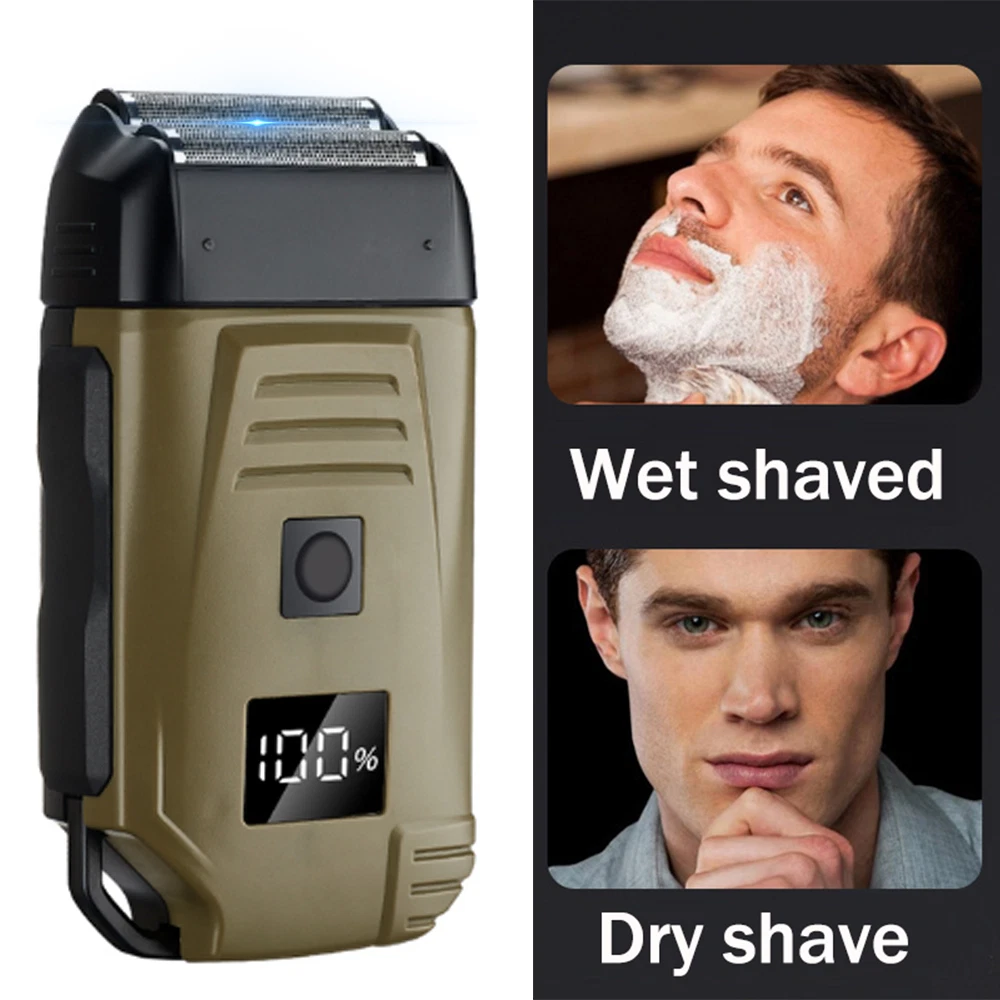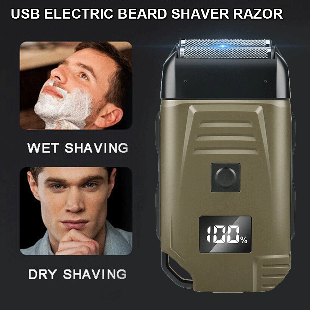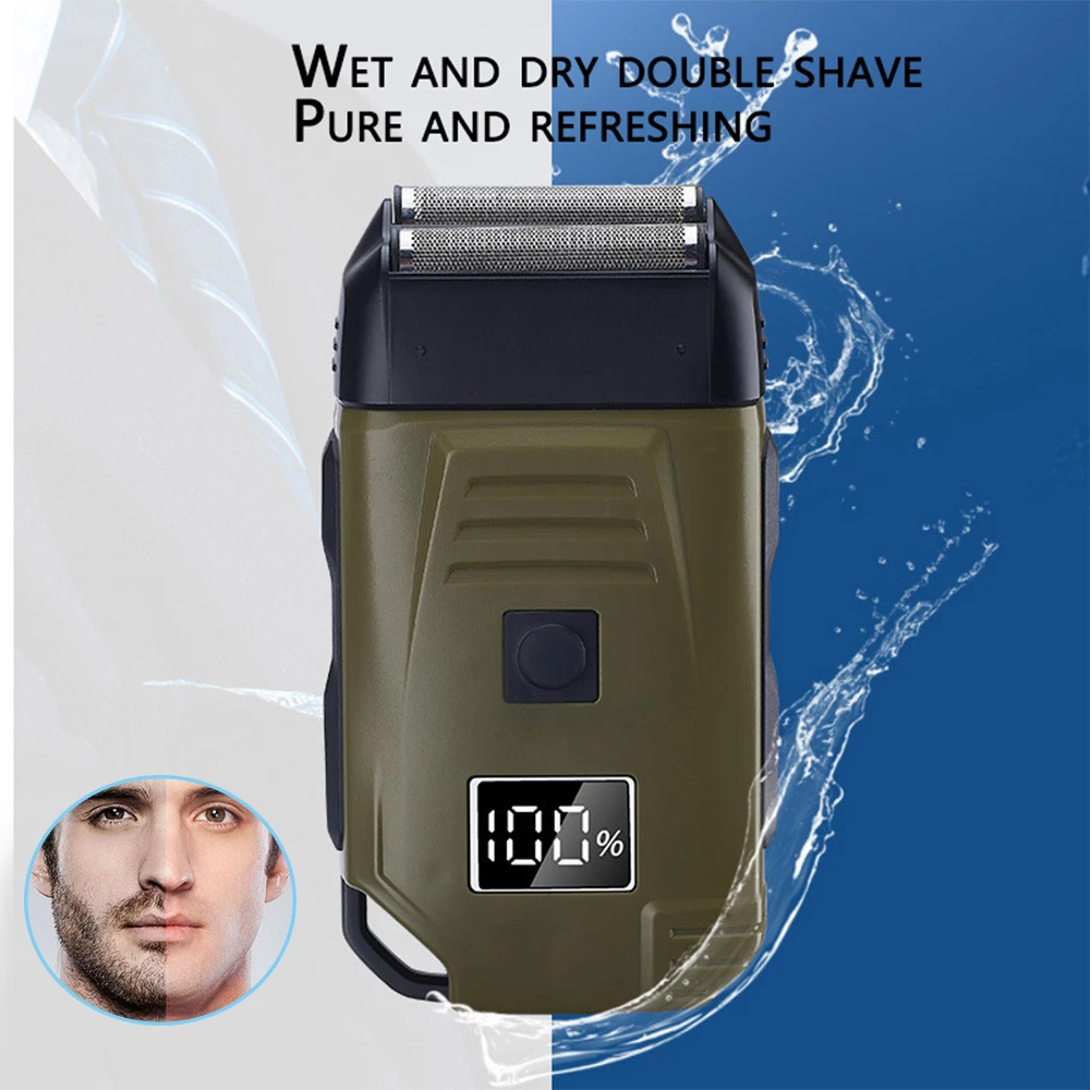 Feature: Brand New and High Quality Newly designed army green double-edged shaver for both dry and wet shaving. 2 Independent floating currter hear to fir the curves of the face for a clean shave. Equipped with L E D display that shows battery. Super thin polygonal blade net that cuts hair lenth to less than 0.5mm. lightweight design and easy to carry. Specifications: Work: Cord/cordless Type: USB Rechargeable Usage Time: 90 mins Charging Time: 2 hours Voltage: 100-240V,50/60Hz Material: ABS Weight: 250g Color: Army Green Machine Size: 4.96 x 2.76 x 1.4 inch Package Includes: 1 x Electric Shaver 1 x Protective cover 1 x Charger 1 x Cleaning brush 1 x Manual NOTE: Due to transportation reasons, all our haircut products are not equipped with oil bottles, please understand the inconvenience