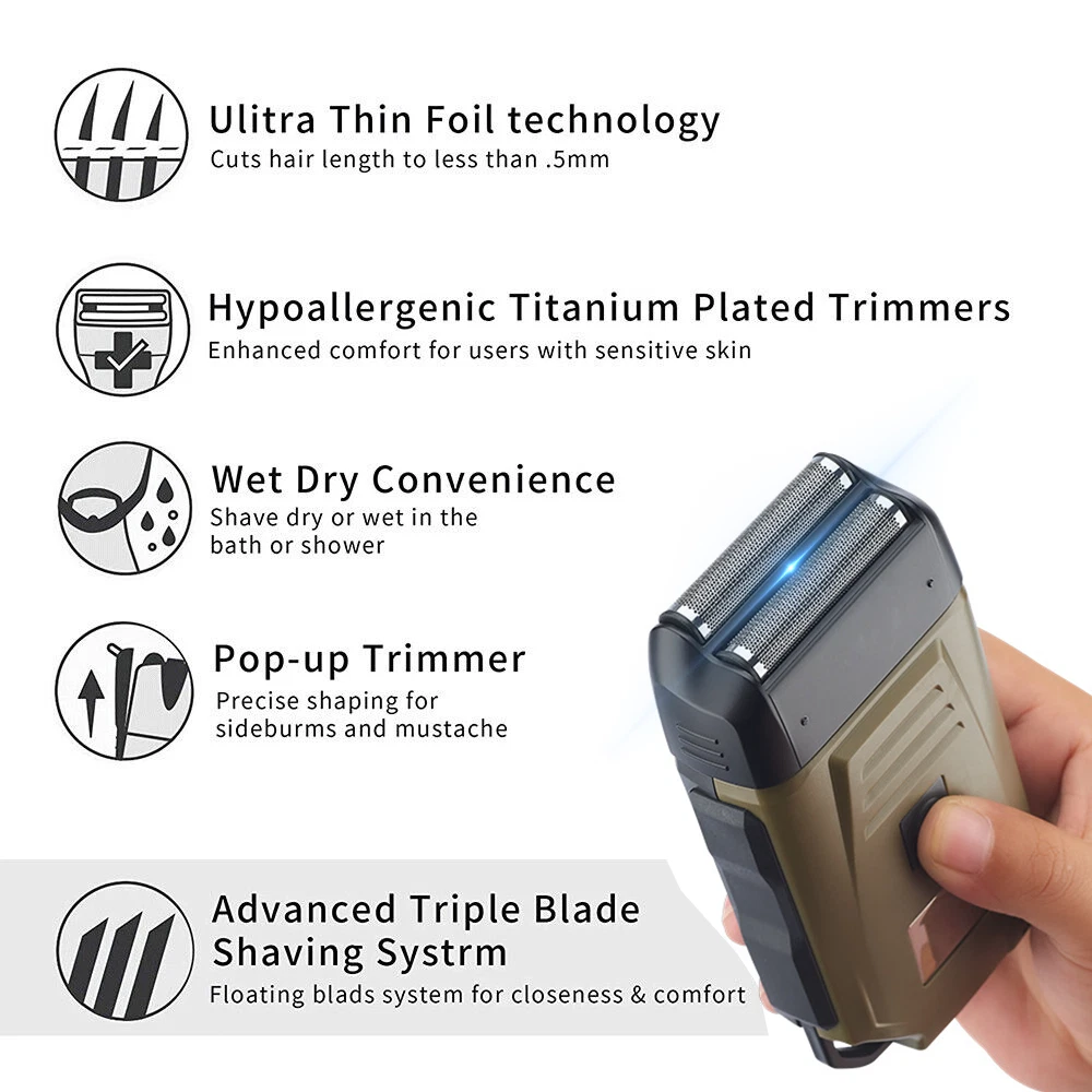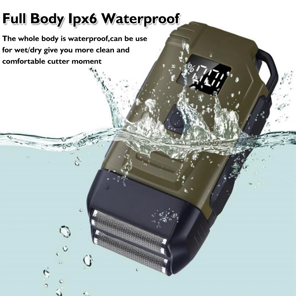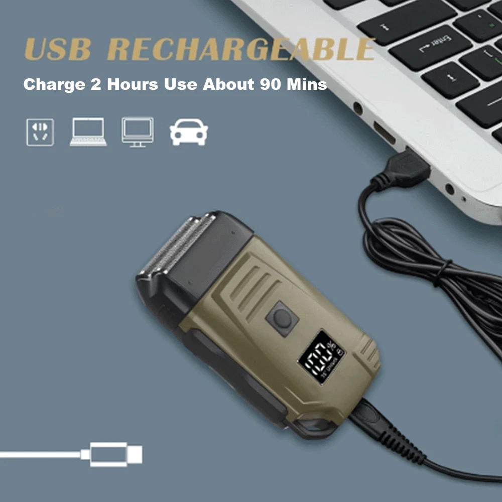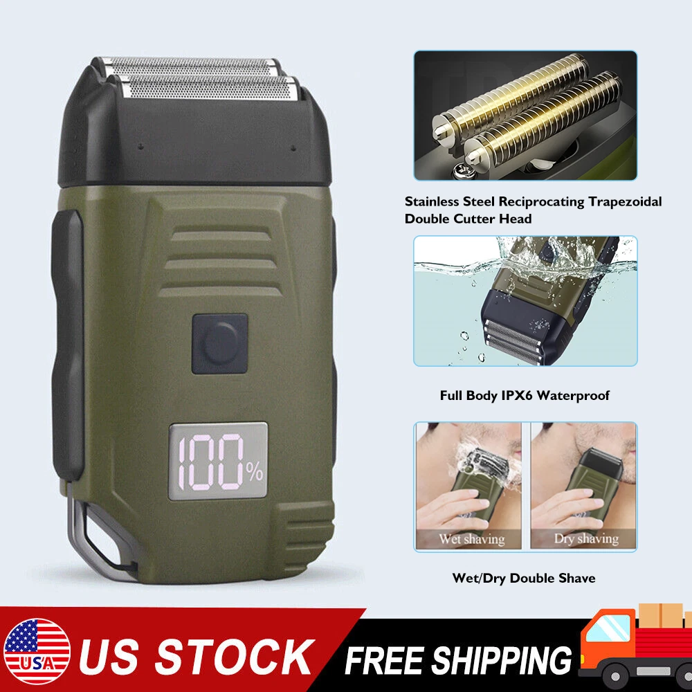 Feature: Brand New and High Quality Newly designed army green double-edged shaver for both dry and wet shaving. 2 Independent floating currter hear to fir the curves of the face for a clean shave. Equipped with L E D display that shows battery. Super thin polygonal blade net that cuts hair lenth to less than 0.5mm. lightweight design and easy to carry. Specifications: Work: Cord/cordless Type: USB Rechargeable Usage Time: 90 mins Charging Time: 2 hours Voltage: 100-240V,50/60Hz Material: ABS Weight: 250g Color: Army Green Machine Size: 4.96 x 2.76 x 1.4 inch Package Includes: 1 x Electric Shaver 1 x Protective cover 1 x Charger 1 x Cleaning brush 1 x Manual NOTE: Due to transportation reasons, all our haircut products are not equipped with oil bottles, please understand the inconvenience