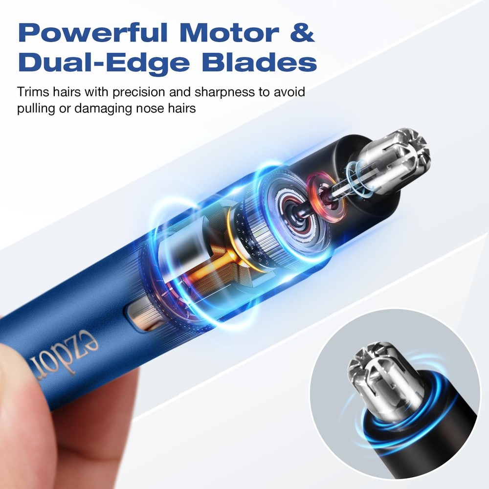 Nose & Ear Hair Trimmers: Professional Cordless Nose Hair Trimmer's blade system is made of high quality stainless steel, which can effectively and comfortably remove unwanted hair from nose, ears and face, one-touch on/off design, suitable for both men and women. Compact size: 0.7 x 4.4” Only 0.9oz Powerful & Painless: The allergy-resistant stainless steel nose hair trimmer features an upgraded copper-core motor that's powerful enough to work with the dual-edge spinning blades system to cleanly cut hairs without pulling almost painlessly. Can trim hair precisely and sharply. The blade system is designed to fit snugly in the nasal cavity, and the enhanced anti-allergy ability ensures a safer, more comfortable trimming experience SMOOTHER & SAFER TRIMMING: Nasal-specific stainless steel round blades with safety guard design and powerful motor powers a 360° rotating dual-blade system that smoothly passes through thick, coarse hairs. Operation noise is less than 50db, use the nose hair clippers freely. USB Rechargeable: Nose & Ear Hair Trimmers comes with a USB cable and built-in battery for easy charging. It can be charged anywhere with the included USB C charging cable, and its powerful fast-charging feature allows it to be fully charged in less than 2 hours, eliminating the hassle of replacing AA batteries too often! EASY TO CLEAN: The stainless steel blades of the nose hair trimmer are waterproof, remove the trimmer head directly from the body for cleaning, washable and removable trimmer head for easy cleaning and maintenance. Convenient body design comes with a dust cover to protect the trimmer head.