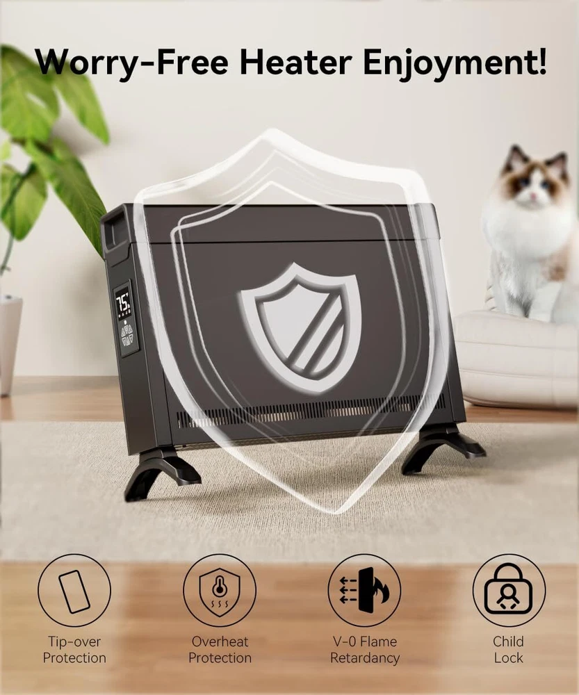 Fast & Efficient Convection Heating – Warmth in Seconds! Transform your space into a cozy haven with this convection heater. It heats medium to large rooms quickly and evenly, delivering floor-to-ceiling warmth in just 10-30 seconds—no cold spots! Perfect for consistent warmth all season long. Why wait for heat when you can feel it instantly? Fanless Heating – Quiet, Fast! Choose from 3 customizable modes to match your comfort needs. The heater provide quiet, fan-less heating—perfect for peaceful nights or you want to relax without noise. Quiet When You Need It, Powerful When You Want It! Space Heater – Comfort at Your Fingertips! Stay cozy all season long with the heater, designed for larger spaces and ultimate ease. Whether you're lounging or sleeping, the user-friendly control panel and included remote let you easily adjust your settings, thermostat, and even set a 24-hour timer—comfort at your command! Lightweight & Portable – Comfort Wherever You Go! With its convenient handle, you can easily move it from room to room—take it from the living room to the bedroom, or even your office, with zero hassle. Whether you’re working, relaxing, or sleeping, just enjoy warmth exactly where you need it, when you need it! Safety First – Peace of Mind with Every Use! Your safety is our priority! features advanced protection with tip-over and overheat protection, along with a flame-retardant power cord and built-in child lock to keep little hands safe. Warmth you can trust, all day, every day Details: Package includes: 1 x panel heater with feet, 1 x instruction. Overall Dimension: 22.6''L x 16.9''H x 3.7''W. Weigh 9.25 LB. Length of Power Cord: 6 ft. Power supply: 110-120 volts AC, 60Hz