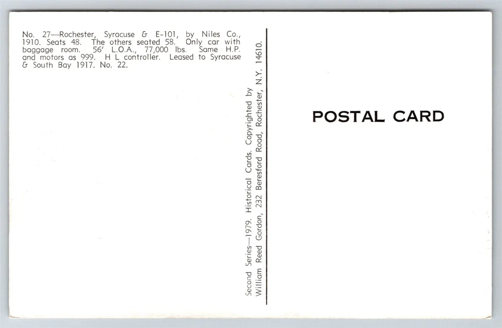 Electric Passenger Car Rochester Syracuse & E101 Postcard S11 Thank you for visiting! This is a standard size postcard, 3.5" X 5.5". Packaged in a sleeve for protection. In stock, usually ships within 24 hours of your purchase. Please ask questions if you are unsure about anything. My goal is for your complete satisfaction with the postcard and your experience. I have over 10,000 selections in my store. Check it out here RETIREDWITHBOOKS Powered by SixBit's eCommerce Solution
