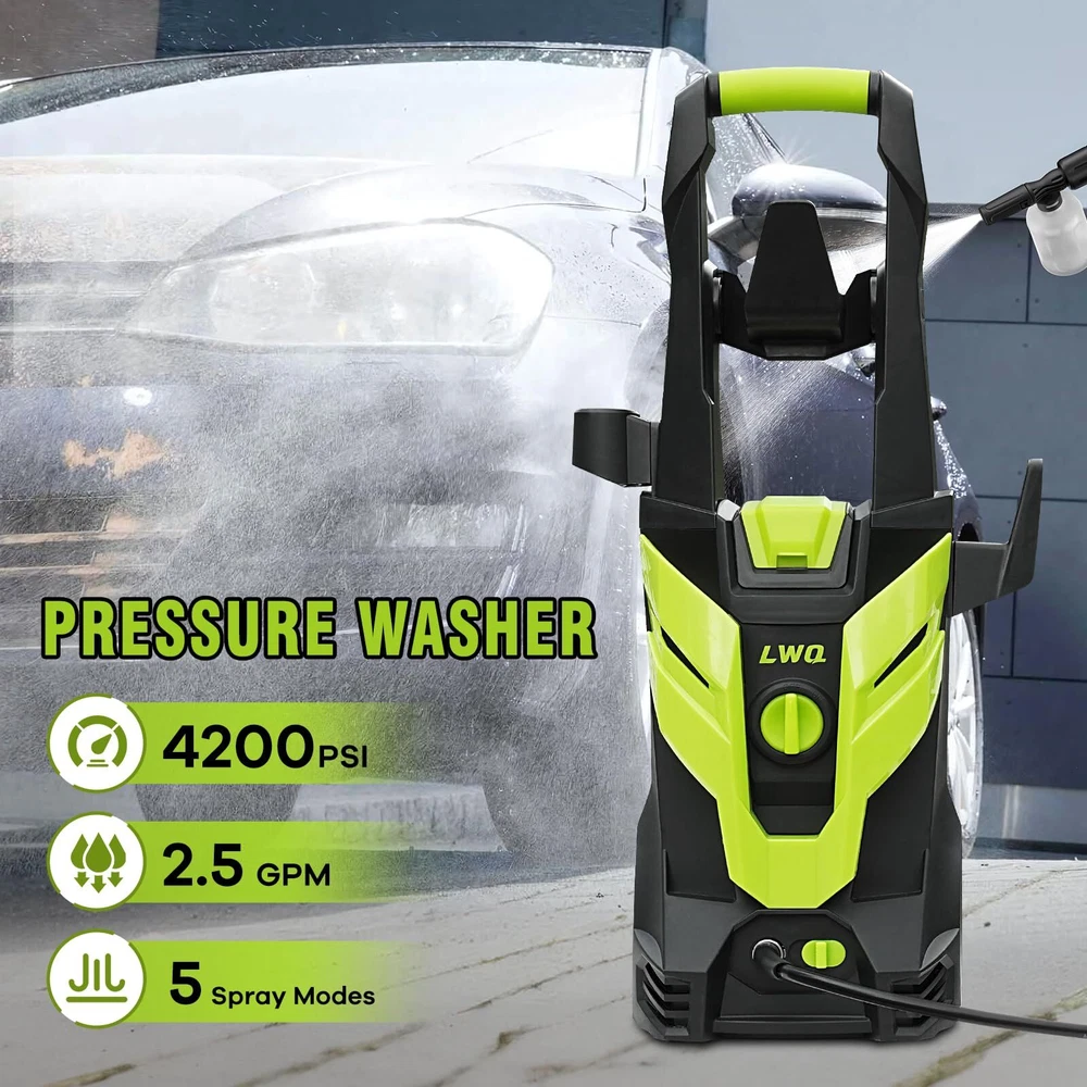 【POWERFUL CLEANING】The Electric Pressure Washer has a deep cleaning water pressure of 4200 Max PSI and up to 2.5 GPM of water flow. While saving water and energy, it also ensures high cleaning efficiency and the ability to clean objects with complex shapes and structures, which makes it ideal for cleaning various surfaces in the home, such as driveways, patio furniture, and cars. 【MULTI-FUNCTIONAL USE】The Power Washer is equipped with four quick-connect metal spray nozzles (water-pressure strength:0°>15°> 25°> 40°) and a foam cannon. 4 metal nozzles with different pressure strengths for different application scenarios to meet your cleaning needs. The detergent bottle can be filled with chemicals such as bleach, the cleaner will not pass through the pump, so you don't have to worry about cleaning the machine. 【EASY TO USE】Equipped with a 23 FT hose and 36 FT power cord, The Pressure Washers provides ample length to ensure freedom of movement. The design of two rollers breaks through the environmental limitations for easy movement and operation, while the bottom of the body adds an anti-tipping design for overall stability when not in motion. In addition, it can take water from both a faucet and a bucket, making it easy to create a clean space wherever you want. 【CONVENIENT STORAGE】The High Pressure Cleaning Machines are equipped with a power cord hook and nozzle holder for easy access. In addition, its compact design makes it easy to store in a garage or pantry when not in use. The high pressure washer is perfect for cleaning concrete, pavement, driveways, patios, decks, sidewalks, RVs, cars, boats, homes, fencing, and more. 【SAVING WATER & SAFETY】The Electric Pressure Washer using high-pressure water flow to clean up the dirt, is currently recognized as the world's most scientific, economical and environmentally friendly cleaning methods. While saving water and energy, it also ensures high cleaning efficiency.