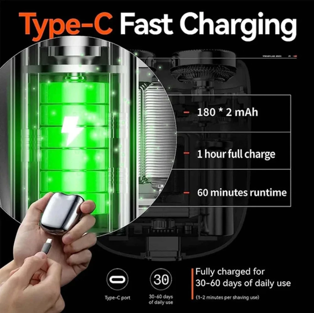 New Mini Double Head Shaver: 2025 New Upgraded Pocket Shaver USB Mini Men's Shaver, Convenient to Carry and Very Stylish. Clean shaving allows you to enjoy a great shaving experience. Double ring: The double ring floating net provides and more efficient shaving at once, with convenient suction and energy-saving. The shaver head has a magnetic function that is convenient and energy-saving. : Men's mini portable shaver, use our fully shaver to enjoy dry and wet shaving. Safe to use during showering, easy to clean under flowing water, ensuring hygiene and convenience. Large capacity battery: Type-C interface large capacity battery, easy to charge. Mini size, portable to use: Its stylish and compact design is for travel, gym, office or car. Shaving easily anytime, anywhere. Specifications Product Name: Mini Shaver Material: ABS+aluminum alloy Battery Type: Lithium Battery Battery capacity: 300mAH Charging : 1 hour Usage : 30-60 days Power: 5W Input voltage: 3.7V Weight: 64 grams Size: 70 * 54mm 1 * Mini shaver 1 * Brush 1 * USB charging cable 1 * User Manual 【New Model Mini Double Head Electric Shaver】Enjoy a closer, smoother shave with our advanced 2024 New Upgrade Pocket Shaver USB Mini Shavers for Men, featuring dual precision magnetic heads. These heads glide effortlessly over your skin, capturing even the smallest hairs for a great finish. 【New Model Mini Dual-Head Electric Shaver】 Equipped with USB charging design, pocket portable electric shaver is compatible with multiple charging methods. After a full charge, it can be used continuously for multiple times without frequent charging, making your shaving process more convenient and quicker. 【New Model Mini Double Head Electric Shaver】 This new electric mini portable razor is waterproof, supports full body cleaning, and can be used both wet and dry.The double head razor is non slip and durable, and the motor rotates quickly to achieve quick shaving. 【New Model Mini Dual-Head Electric Shaver】 This pocket size shaver adopts a low-noise design, with almost no noise interference when working, providing a quiet shaving experience, and ensure a comfortable shaving experience every time. 【New Model Mini Double Head Electric Shaver】 This pocket size shaver adopts a low-noise design, with almost no noise interference when working, providing a quiet shaving experience, and ensure a comfortable shaving experience every time.