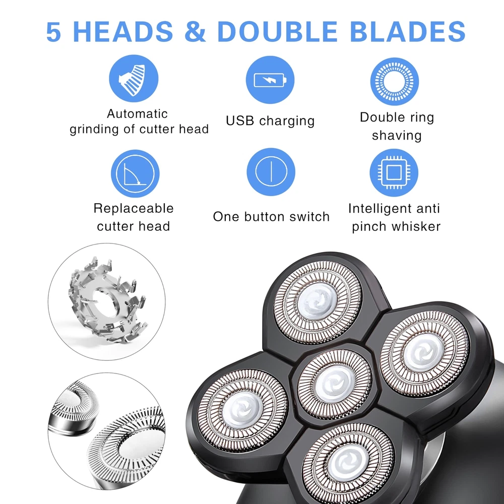 Electric Razors for Women - Head Shavers for Bald Men, Wet/Dry 5D Razor with USB Adapter & Charging Cable,5D Rechargeable Rotary Shaver, Grooming Kit Product Details Color: Black 1 Brand: TAYAYO MPN: TMQ035 UPC: 745431408413 EAN: 0745431408413 Brand: TAYAYO Special Feature: rechargeable, travel_lock, lightweight Power Source: Battery Powered Included Components: Cleaning Brush, Battery, Attachment Battery Life: 90 minutes Package Dimensions : 6.02 x 5.47 x 3.58 inches; 14.89 ounces Batteries : 1 Lithium Ion batteries required. (included) Date First Available : August 23, 2023 Manufacturer : DongGuanShiRunxianShangmaoYouxiangongsi Country of Origin : China 5 in 1 Womens&Men Grooming KitThe electric shaver grooming kit includes 5D women&men rotary shaver, hair clipper (with 3-5-7 mm guide combs), nose hair trimmer, facial cleansing brush, facial silica gel brush, meets any body shaving, grooming and cleansing needs, enjoy hair-free smooth skin without irritation. Smooth and Closer Shaving5D flex heads automatically adapt to the contours of your head, face, neck and jaw, providing you a comfortable and close shave. Rechargeable Shaver for Women&MenThis hair trimmer is rechargeable- you'll never have to worry about running out of batteries. The lithium-ion battery provides up to 90 minutes of shaving time and be quickly recharged with the included USB adapter and cable. Shave Wet or DryWith upgraded IPX7 waterproof technology, the whole shaver could be soaked in water as long as 30 minutes(but we don't suggest do this), you could enjoy shaving in the shower. Perfect GiftSmall and lightweight, unique travel lock design,; Nice package as a gift for your family to use at home or travelling.