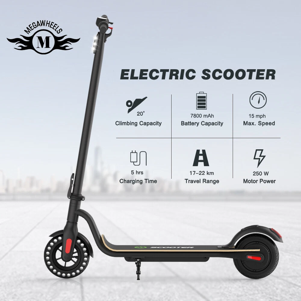Main features: LONG RANGE BATTERY LIFE - Powerful 250W motor and 7.8 Ah/36V lithium battery pack that supports a speed of up to 15 Mph with a range up to 13 Miles. Updated large-capacity battery life, designed for commuters and longer distances. 8.0" HONEYCOMB & SOLID TIRES - Shock-absorbing rubber tires offer a smooth ride even over bumpy surfaces. PORTABLE FOLDING DESIGN - Electric scooter can be folded easily in 3 seconds with quick folding latch for easy carrying and storage. BATTERY INDICATOR AND LIGHTS - Battery indicator keeps to track battery life. Ultra bright LED headlight and taillight. Fast recharging about 5 hours. GEAR SHIFT SETTING - 1st gear for a 7 Mph comfortable ride or 3rd gear to get the 15 Mph fast experience. Extremely fun to ride and end boring commutes. Specification: Brand: Megawheels Model: S10 Dimension: Unfolding 105 x 43 x 118 cm; Folding: 105 x 43 x 48 cm Net Weight: 11.9kg Color: Black Frame Material: Aluminium Tires: 8.0" Honeycomb Front Tire & Solid Rear Tire Max Load: 100kg Max speed: 25KM/h Speed level: Gear 1--Max 10km/h ; Gear 2--Max 20km/h; Gear 3--Max 25km/h Mileage: 17-22km Grade Ability: 20 degree slope Working Temperature: -15°C-50°C Storage Temperature: -20°C-25°C Mode Type of Motor: Brushless hub motor Battery Type: High quality lithium battery Battery Capacitiy: 7.8 Ah Battery Voltage: 36V Charger Input Voltage: 100V-240V Charger Frequent: 50Hz/60Hz Charging time: 5 hours Package Contents: 1 * Folding Electric Scooter 1 * Battery Charger 1 * User's Manual NOTE:The appearance of the product you receive may vary slightly from the image shown due to differing production batches! Before use, please kindly read the schematic diagrams and assembly steps of manual to assemble the front wheel: 1. Step on the base, lift the fork firmly to remove the base. 2. Remove the rubber plugs on both sides of the front fork, and unscrew the front axle with the two 6mm hexagon wrenches in the package. 3. When installing the front wheel (please pay attention to the direction of the tread of the tire, as shown in the lower right or the inflation port to the right), and tighten the front wheel axle. 4. Plug back the rubber plugs on both sides of the front fork. Riding Skills: -Put your foot in the front of the scooter and the other foot on the floor before riding. -Make sure that the riding route is smooth. -Slide forward with the food standing on the floor before starting (like riding the scooter without power). -Immediately press the acceleration button and lean forward to avoid falling over backward due to inertia, so that the electric scooter will enter the working status. -Avoid pressing the handle with your body in the acceleration and deceleration process. Put one foot ahead and the other behind (like on the sliding plate/surfboard, put one foot ahead and the other behind by 70-90 for better comfort). -Turning – The turning principle of the electric scooter is the same with that of surfboard/sliding plate/skis. The handle shall be balanced with the body. Observe and make sure that turning is safe before turning. Tips: Before riding the scooter, please put one foot on the scooter deck and the other foot on floor and push the scooter forward by kicking the floor for some distance, in this way, the scooter will get some impulse to run forward. Note: This products have been certified under UL2272 safety standards. On Feb 1, 2025 at 14:02:44 PST, seller added the following information:
