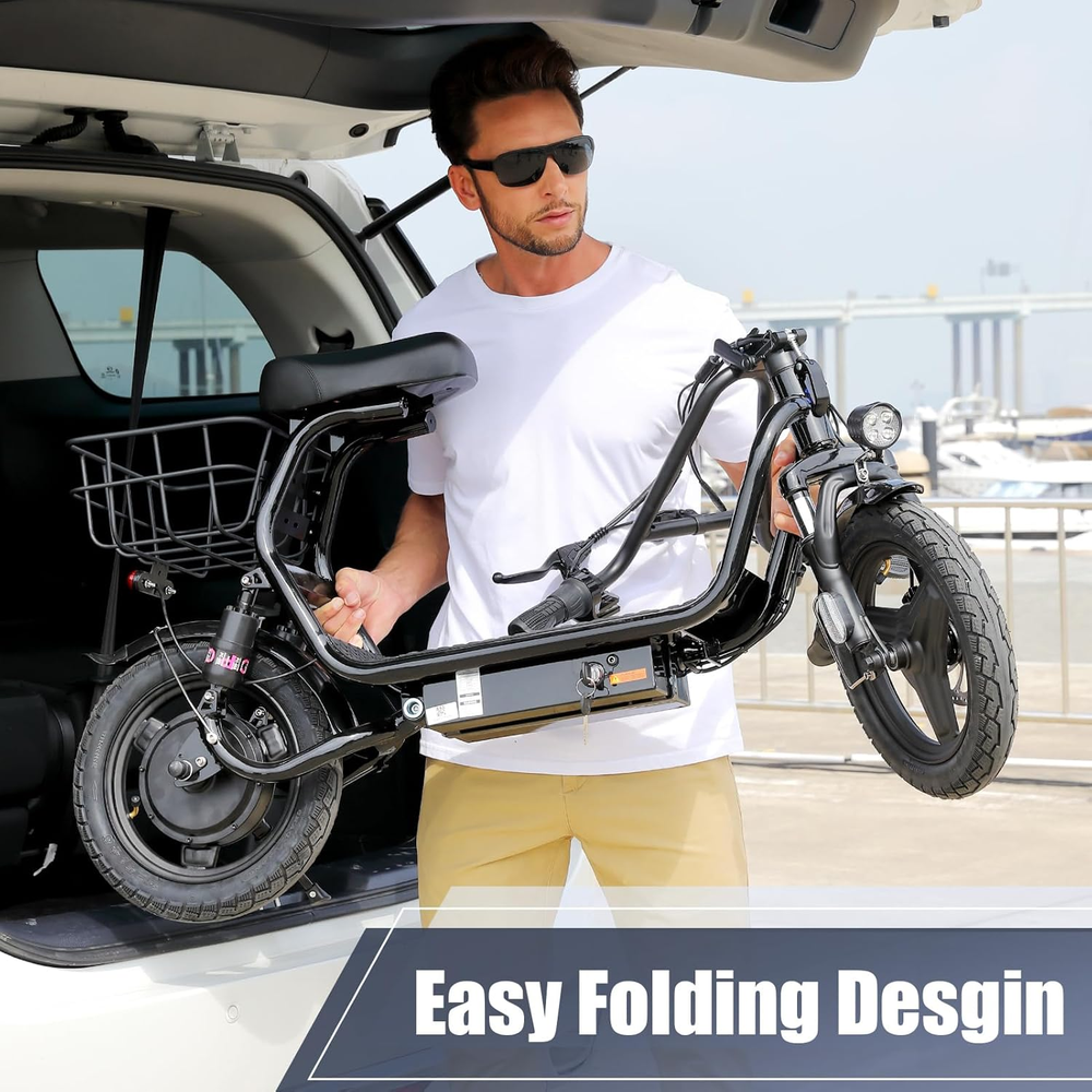 🛴【Peak 1200W Motor & 500Wh Battery】: Caroma P5 electric scooter is powered by a robust 750W(peak 1200W) motor, reaching top speeds of 20 mph and handling 20% hill grades with ease. Its high-capacity 500Wh lithium battery, enhanced by regenerative braking, provides a remarkable range of up to 30 miles. Perfect for commuting or leisure rides, this adult electric scooter offers unparalleled versatility and high performance. 🛴【Dual Shock Absorption & Large 14" Tires】The adult electric scooter features multiple shock absorption , including front and rear shock absorber and soft wide seat, significantly reducing discomfort. Its 14" pneumatic tires provide excellent grip, high elasticity, and wear resistance. The extra-wide deck makes long rides enjoyable and effortless. 🛴【Portable and Durable Travel Partner】: Equipped with foldable handlebar, the e scooter can be easily stored and carried in your trunk, you can ride it anytime you like. The aluminum frame of this electric scooter is strong and durable, which can support a maximum weight of 300 pounds. The large capacity basket is prefect for shopping trips and short errands around the block. 🛴【LCD Display & Safe to Ride】: The LCD monitor shows the battery level of the e scooter, so you can get a clear picture of your riding. The effective front and rear disc brake on the e-scooters provide excellent stability and control. The high-brightness headlight and rear brake light keep your riding safe at night. 🛴【Easy Assembly & After Sales Service】: This electric scooter is UL 2272 certified. Only the seat and the basket attachment needed to be assembled after the 2 wheel electric scooter for adults arrives. We provide a 12-month warranty for the E scooter. If you encounter problems using the product, please refer to the manual. If the problem cannot be solved, feel free to contact our customer service. scooter