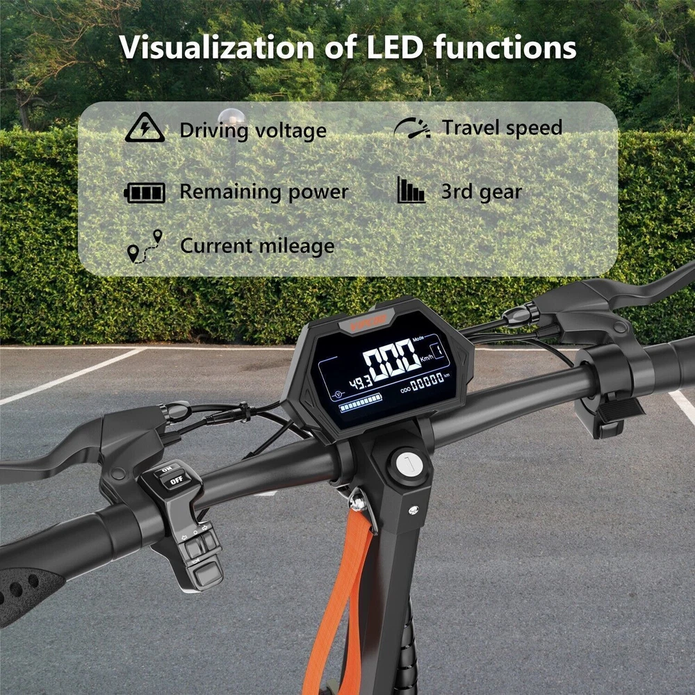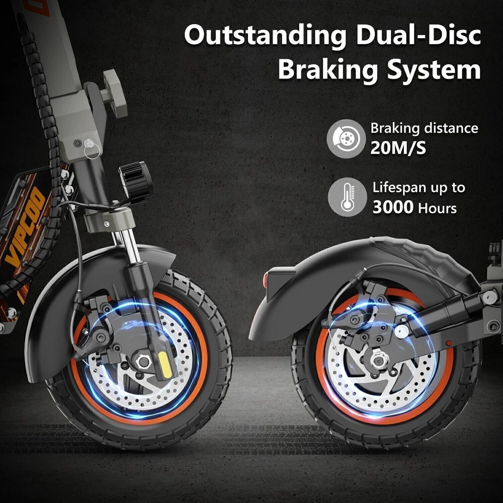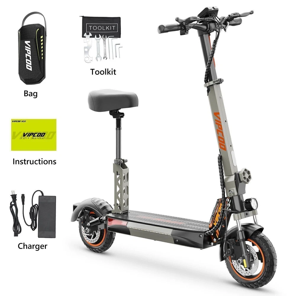 Product Description Model: VIPCOO VS1 Battery: 48V/13Ah Power: 700W Display Screen: Digital display Max Speed: 28 MPH (45 KM/H) Range: 19 Miles (20-30 KM) Max Load: 265 lbs (120 KG) Tire Size: 10 inch Tyre Type: Off-road air tires Charging Time: 6-8 hours Frame Material: Aluminum alloy Net Weight: 25.2 KG Gross Weight: 29.5 KG Package Size: 122.5 × 23.5 × 52 cm Brake: Front and rear disc brakes Light: Front LED headlights, side lights, and taillights Adapter: Input: 100-240V~50/60Hz 3.0A Max, Output: 54.6V 2.0A Additional Notes: The max load capacity is the maximum weight the e-scooter can withstand. Max speed & range may vary depending on the rider's weight, riding style, ambient temperature, battery level, and terrain. Package contents: 1 x Electric scooter. 1 x Instruction 1 x Tool set. 1 x Main charger. 🛴A new option that allows you to freely across the city - Our New VS1 Adult Electric Scooter with Seat which is with powerful battery(48V 13Ah), makes it easier for you to complete daily travel, and one charge is enough for you to ride for 15-45 miles under specific conditions. 🛴Let You Ride As You Want, Easy to Drive - Our New VS1 Escooter has three different riding modes (Eco: 9Mph, D: 18Mph, S: 28Mph), you can choose the most suitable mode for you according to your needs, and the 700w powerful high brushless motor allows you ride speed up to 28Mph, and handle all kinds of road conditions with ease! 🛴Comfortable Riding Experiences, Let You Enjoy Every Trip - Our New VS1 Electric Scooter for Adult adopts front and rear wheel suspension system and 10inch pneumatic tires, which means you can enjoy a smoother and more comfortable riding experience, even on rough roads! 🛴Make Your Safety More Secure - Our New VS1 Escooter for Adult is not only equipped with super bright headlight & taillight, but also has a side ambient light, which improves the safety of night riding and allows you to travel with peace of mind at any time. The perfect front & rear dual brakes and electronic braking system allow you to stop whenever you want. 【Important Note】- The max speed and max range of per full charged vary based on a lot factors, including: rider's weight, riding surface, incline, ambient temperature, battery level, riding style (stop/start vs cruising), wind direction, wind speed etc “Warning: It is illegal to ride electric scooters on public roads, pavements, or cycle paths. They are intended only for use on private land with the owner’s permission. See Guidance for local areas and rental operators of e-scooters.{e253595-1081650x} Our product: (1) Our product approved by UL2272/CE/ROHS certificates (2) Every piece of spare part will be inspected before assembling and very piece of completed product will be tested before shipment. Electric Scooter For Adult 24OOW Motor 37Miles Range,10-Inch Off-Road Tire 37mph 1078.0 USD Free shipping AOKDA-A1 Electric Scooter for Adults Teens Folding E-Scooter Commuter 48V/12.5Ah 250.38 USD 357.69 USD 39.99 USD 30% off 600W Electric Scooter Adults Teens Folding E-Scooter with Seat 48V/10AH 45Km/h 497.17 USD 599.0 USD Free shipping 17% off iENYRID 24OOW Dual Motor Electric Scooter Adult 10" Off-Road Tires + Seat 48V US 1200.0 USD Free shipping powered by
