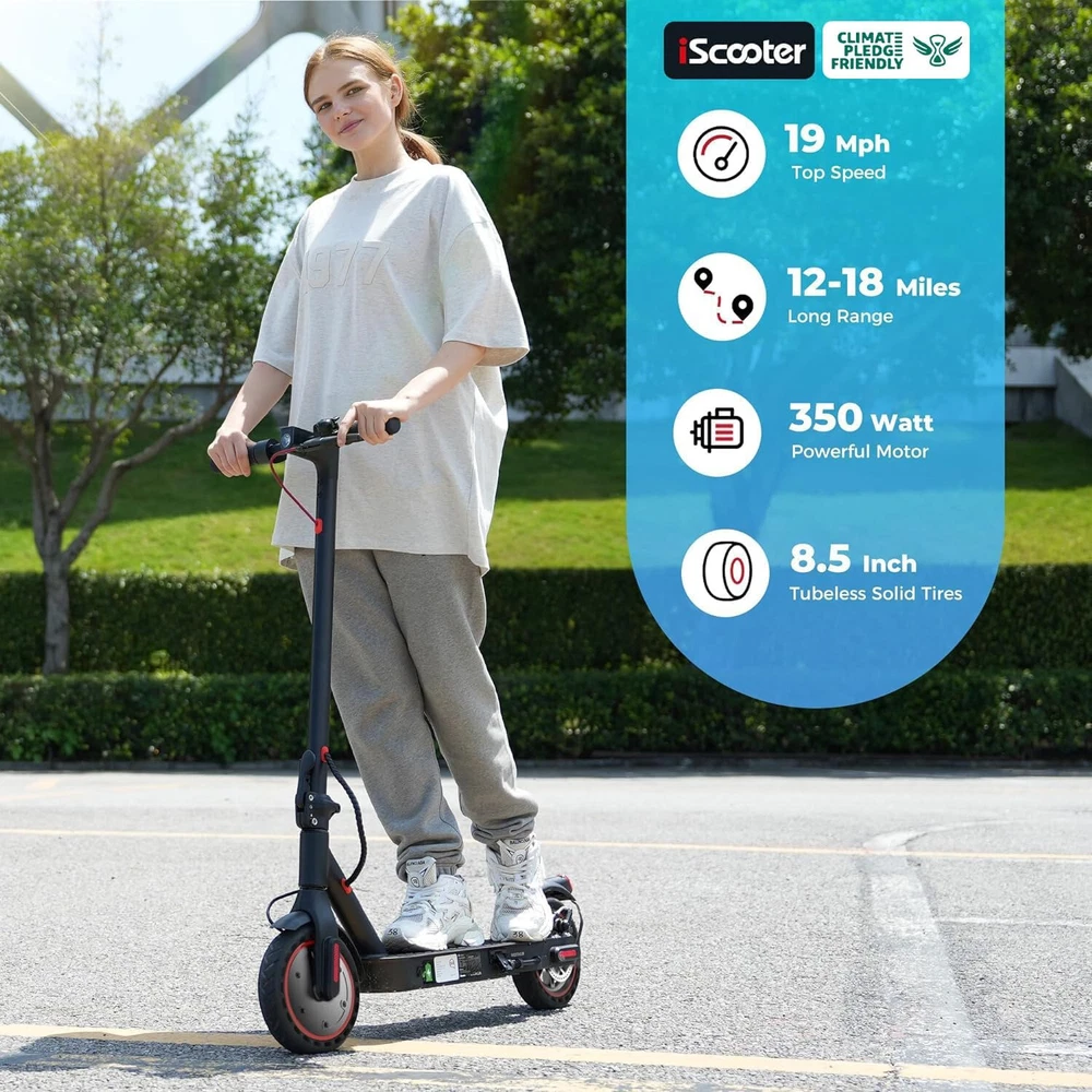 STORE NEW ARRIVALS ADD TO FAVORITE VIEW FEEDBACK CONTACT Store New Arrivals Add to Favorite View Feedback Contact Electric Scooter, 18 Miles Range, 19 MPH Top Speed, 350W Foldable Commuting Electric Scooter with Double Braking Systems and APP for Adults and Teens Description Age Range Description Adult Style i9(350W, 18miles) Age Range (Description) Adult Grip Type Ergonomic Frame Material Aluminum Wheel Material Rubber Number of Wheels 2 Wheel Type Pneumatic Maximum Distance Range 18 Miles Manufacturer Zhejiang jinpan import and export co.,Ltd Weight Capacity Maximum 220 Pounds Brake Style Front Braking, Rear Braking Handlebar Type Fixed Warranty Type Limited Item Weight 10.9 Kilograms Charging Time 6 Hours Special Features 19MPH Top Speed, APP Controller, Non Slip Deck, foldable, Double braking system(Electronic brake+disc brake) Special Feature function(f) {var _np=(window.P._namespace("DetailPageProductOverviewTemplatesJava"));if(_np.guardFatal){_np.guardFatal(f)(_np);}else{f(_np);}}(function(P) { P.when('A').execute(function(A){ A.on('a:truncate:po-attribute-truncate-3:updated', function(data) { var isTruncated = !data.truncateInstance.getIfTextFits(); var seeMoreElement = document.getElementById('po-attribute-see-more-id-3'); if(seeMoreElement) { seeMoreElement.style.display = isTruncated ? '' : 'none'; } }) }); })); 19MPH Top Speed, APP Controller, Non Slip Deck, foldable, Double braking system(Electronic brake+disc brake) See more Weight Limit 220 Pounds Item Dimensions L x W x H 42"L x 17"W x 44"H Handle Height 76 Centimeters Wheel Size 8.5 Inches Color Black Recommended Uses For Product Commuting Model Name E9PRO Product Dimensions 42"L x 17"W x 44"H 【Cost-Effective Electric Scooter for Commuters 】Discover an affordable and efficient commuting solution with our high-performance electric scooter adults. 350W electric scooters offers a maximum speed of 19mph, making your daily commute faster and more cost-effective. The Cruise Control System ensures a smooth and enjoyable ride. The scooter for adults has a maximum load capacity of 220lbs, catering to a wide range of riders. It is certified to UL2272. 【Long-lasting and Safety 】Equipped with a high-capacity 36V/7.5AH battery, our scooter electric boasts a max travel range of 18 miles. With a quick charging time of 3-6 hours, you'll have more time on the go. Prioritizing your safety, it features warning taillights and ultra-bright headlights with a range of up to 15 meters, enhancing visibility during nighttime rides. The double braking system, including disc braking and EABS regenerative anti-lock braking, ensures a secure riding experience. 【Smart APP Control】Take control of your ride with the free Smart Tuya APP, available for both iPhone and Android. Connect your adult electric scooter via Bluetooth and manage features such as lock/unlock, light control, gear adjustment, start mode selection, cruise control, and more. The smart APP enhances your riding experience and simplifies scooter operation. 【Foldable and Convenient】Experience unparalleled convenience with our one-step folding design that allows you to fold the scooter in just 3 seconds. Perfect for city commuting, campus travel, and office commutes, the scooter can be easily folded and weighs only 26 lbs, making it compact enough to fit in a car trunk. Elevate your family trips with this foldable electric scooter, providing unmatched convenience and joy. 【Quality Assurance by iScooter】At iScooter, we are committed to delivering premium, affordable, and reliable products. Enjoy peace of mind with our 12-month or 180-day warranty for different parts. If you have any questions, our dedicated customer support is ready to assist you. Your satisfaction is our utmost priority. Make your life more wonderful with iScooter's Foldable Electric Scooters. Product Description The video showcases the product in use. The video guides you through product setup. The video compares multiple products. The video shows the product being unpacked. If you are looking for one special gifts for your childs or friends, We think that our i9 electric scooter will be the perfect one! Folding: 42''x17"x19" Unfolding: 42”*17“*44“ 1 Carbonfree Certified 2 Lightweight 1 36V/7.5AH Battery 2 Smart APP 1 Headlight &Taillight 2 Dual Braking Systems 3 Solid Tire&Mudguard How fast can electric scooters go? iScooter i9 electric scooters can go about 19mph with 2st gear, 9mph with 1st gear. What are the benefits of an electric sooter? The benefits of electric scooters are that they are affordable, high cost-effective and portable to save your time to find a parking space or wait for subway. They can also save you money on gas because they can be charged quickly. How long do e scooters last? With proper care and maintenance, an e scooter can last anywhere between 2 to 5 years or even longer. How do I choose my scooter electric? You can focus on the following factors: Rider's weight, Ease of installing, Battery life, Top speed you prefer, the weight of sooter and Appearance. Why there are different top speeds with same scooter. The factor of influencing the top speed: Rider's weight, the condition of road and weather, daily maintenance, etc. RECOMMEND FOR YOU Add to Cart Add to Cart Add to Cart Add to Cart Add to Cart Add to Cart Customer Reviews 4.1 out of 5 stars 998 4.2 out of 5 stars 59 4.3 out of 5 stars 362 4.2 out of 5 stars 91 4.6 out of 5 stars 178 4.5 out of 5 stars 24 3.9 out of 5 stars 58 Price $239.99 $ 239 . 99 $299.99 $ 299 . 99 $539.99 $ 539 . 99 $689.99 $ 689 . 99 $179.99 $ 179 . 99 $399.99 $ 399 . 99 — Motor Power 350W 500W 800W 750W 350W 250W 70W Top Speed 19 MPH 15.6 MPH 24 MPH 28 MPH 15.6 MPH 5 MPH 6 MPH Long Range 18 Miles 21 Miles 25 Miles 50 Miles 12 Miles 12.4 Miles 5 Miles Tires Type 8.5'' Honeycomb Tires 12" Pneumatic Tires 10'' Off Road Tubeless Tire 10" Pneumatic Tires 8.5'' Pneumatic Tires 197*60MM Solid Tires 5'' & 3.5''PU Tires Hill Climbing Approx. 15% App