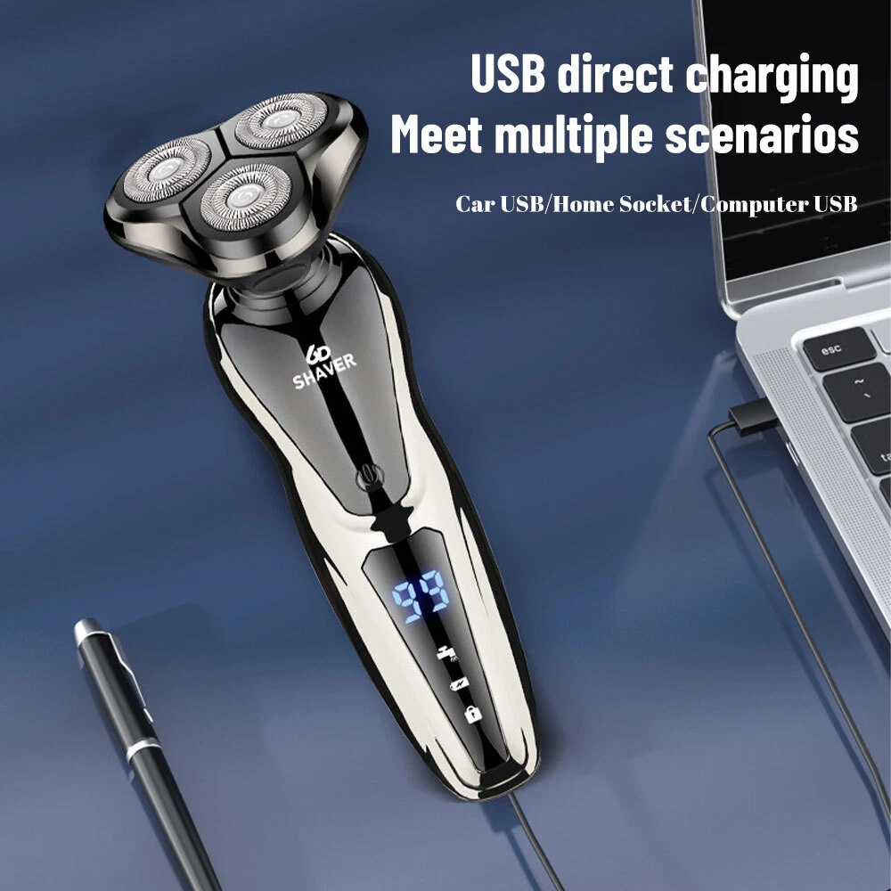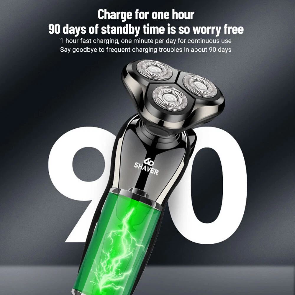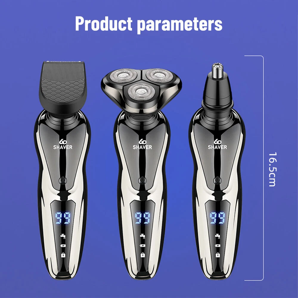 Specification Product features: full body wash, LED display, floating head Shaving head: rotary 3-heads Cleaning method: removable heads for washing Charging mode: USB charging Motor type: brushless motor Duration: about 90 minutes Built-in battery capacity: 1200mAh-2000mAh (including) Whether built-in: battery built-in battery Product noise: 36-45db Features: 1.Smart induction shaver with large LCD display and 3 replaced head. Easily adjust the mode you need. 2.The shaver with automatic reminder cleaning function, which can better protect the product.It also has an intelligent travel lock function to make it more secure. 3.The IPX6 body is waterproof and allows you to use the electric shaver whether wet or dry including even in the shower. It easily adapts to either shaving foam or gel for a better and closer shaving experience 4.Rotary electric shaver,perfectly adapts to the contours of the Face, Neck and even the Jaw for a more comfortable and close shave,minimizing pressure and irritation, provides you a more comfortable, smooth and close shaving experience. 5.Dual-track cutter gently conform to facial contours, for enhanced shaving comfort. 6.With automatic grinding technology and blades self-sharpening, which will not pull the beard or damage skin. Package Include: Groomer *1 Nose Hair Trimmer *1 Cheek trimmer *1 USB cable *1 Cutter head cover *1 Cleaning brush *1 English manual *1