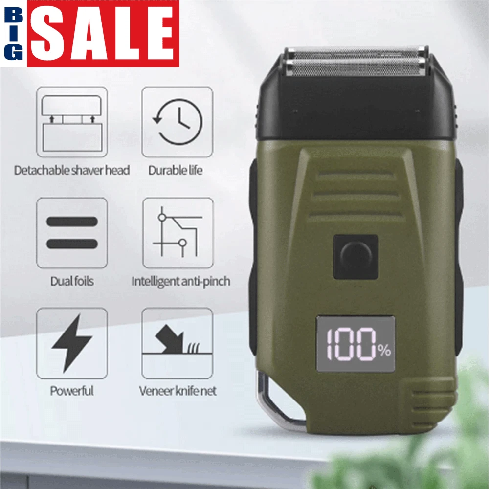 Specification Feature: Newly designed army green double-edged shaver, a machine to solve the problem of hair and beard, LCD display to check the battery at any time, IPX6 body waterproof performance, lightweight design and easy to carry. Work:Cord/cordless Type: USB Rechargeable Usage Time: 90 mins Charging Time: 2 hours Voltage: 100-240V,50/60Hz Material: ABS Weight : 250g Color : Army Green Machine Size : 4.96*2.76*1.4inch Package Size : 15.2*9.*4.5cm/6.1*3.7*1.7inch Package Included: 1* trimmer 1* Protective cover 1*charger 1* Cleaning brush 1* Manual