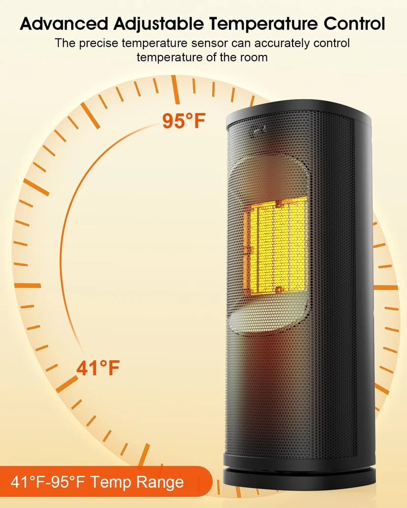 Electric Space Heater Indoor Use, 1500W Fast Heating PTC Portable Black Product Details Brand: TIOKVIOP Special Feature: ECO Mode, Fast Heating, Oscillation, Digital Display, Adjustable Thermostat from 41 to 95°F, Electronic Thermostat, Energy Efficient, Tip-over Protection, Overheat Protection, Portable Color: Black Form Factor: Tower Indoor/Outdoor Usage: Indoor Product Dimensions: 5.9"D x 5.9"W x 15.8"H Recommended Uses For Product: Office Mounting Type: Floor Mount Room Type: Bedroom Heating Coverage: 200 square_feet Burner type: Radiant Heat Output: 1500 Watts Fuel Type: Electric Voltage: 1.2E+2 Volts (AC) Item Weight: 4.51 pounds Manufacturer: Dongguan Glanto Electronic Technology Co.,LTD Item model number: J1 Special Feature: ECO Mode, Fast Heating, Oscillation, Digital Display, Adjustable Thermostat from 41 to 95°F, Electronic Thermostat, Energy Efficient, Tip-over Protection, Overheat Protection, Portable ECO Mode, Fast Heating, Oscillation, Digital Display, Adjustable Thermostat from 41 to 95°F, Electronic Thermostat, Energy Efficient, Tip-over Protection, Overheat Protection, PortableECO Mode, Fast Heating, Oscillation, Digital Display, Adjustable Thermostat from 41 to 95°F, Electronic Thermostat, Energy Efficient, Tip-over Protection, Overheat Protection, Portable See more Power SourceHeating Method: acForced Air & : Stay warm during the cold months with our 1500W electric space heater. Featuring advanced PTC heating technology, this room heater rapidly warms your indoor spaces, ensuring comfort in seconds and covering an area of up to 200 square feet to keep your room cozy and warm. - : Designed for your ultimate comfort, this indoor space heater is built with V0 flame-retardant materials and equipped with tip-over protection and overheat sensors. The portable heater boasts a wide 60° oscillation range, enhancing warmth distribution to ensure even heating throughout the room. : With a fan that uses inclined airflow technology, experience tranquility with our room space heater's ultra-quiet performance, which is 12% quieter than conventional models. You can use it in bedrooms, offices, or living rooms without any distracting noise, allowing you to focus or rest comfortably. & : Easily adjust settings from anywhere in the room using the included remote control. The intuitive LED display and touch controls provide quick access to all functions, enhancing user experience and convenience for all your heating needs. Our personal heater features a compact design and hidden handle, making it a space-saving, portable heating solution for any room. : Enjoy customized heating with our 12 hour timer function, Set the space heater to turn on or off according to your schedule, ensuring your space is cozy when you need it most. Return home to a warm environment after a long day, or wake up to a perfectly heated room. - : Achieve optimal comfort and energy efficiency with our ECO mode. This feature intelligently adjusts the electric space heater's output based on the ambient temperature, maintaining your desired indoor climate while reducing electricity bills, making your living space cozy and cost-effective.