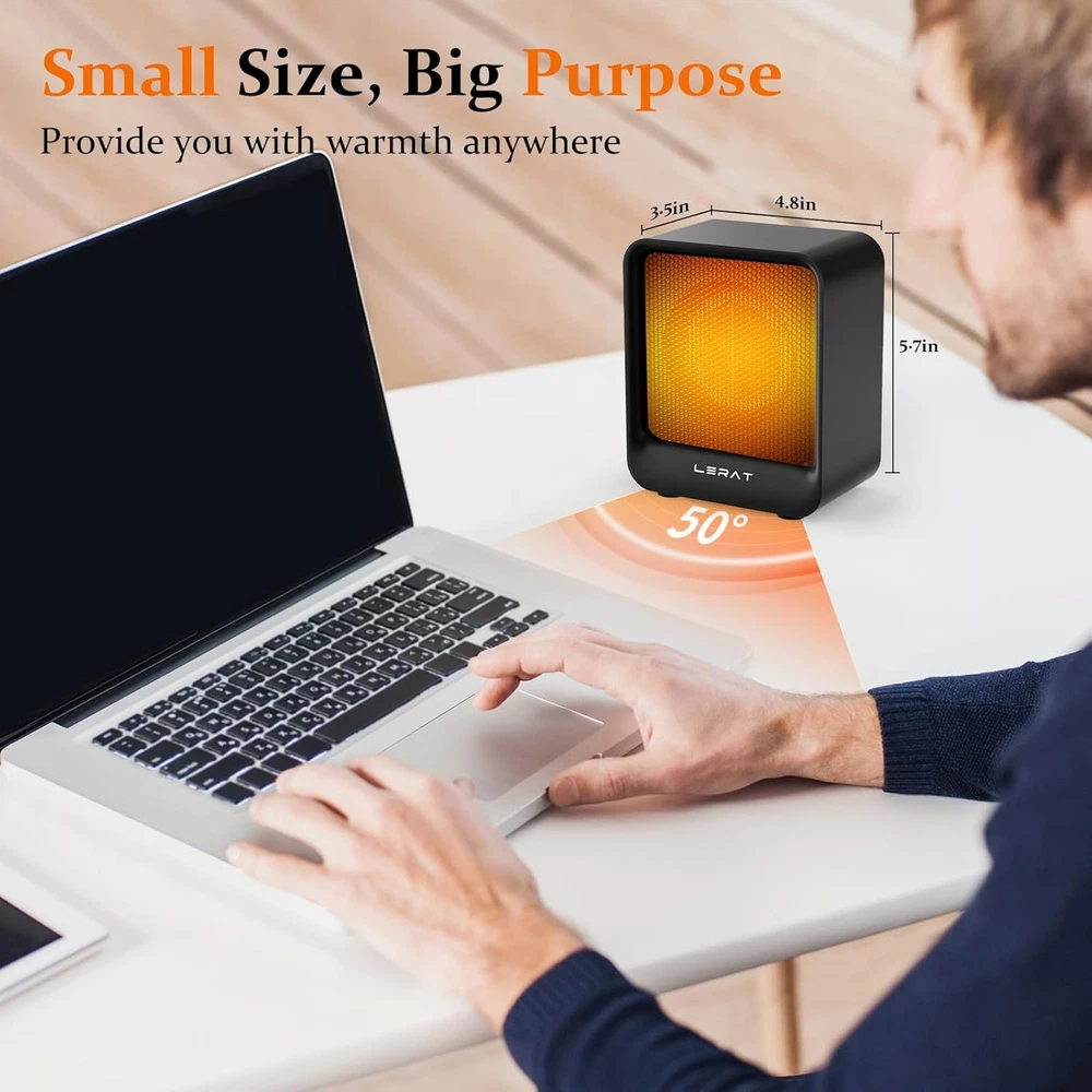 【HIGH HEATING EFFICIENCY】 High-efficiency ceramic coils heat up quickly in less than 3 seconds. The portable space heater has two different heat settings (200W warm temp and 500W high temp) to create a comfortable temperature in your room. 【COMPACT SIZE】 The product size is 4.72x5.69x3.5inch, lightweight but powerful, you can carry it with you, perfect for living room, bedroom, office, dormitory and other places. (Care needs to be taken to keep windows and doors closed so that the room temperature can be better maintained and the heating effect can be improved) 【OVERHEAT PROTECTION & TILTING PROTECTION】 The space heater warmer is made of ABS material, which is a high temperature resistant and flame retardant material, and will not overheat even if it is turned on for a long period of time; if the product is tilted or bumped into, the space heater will automatically turn off the power to effectively avoid combustion, fire, or any other accidents. 【EASY OPERATION】 The heater has only one power switch, very easy to control. There is a base underneath the heater, and the high temperature will not damage the tabletop. 【SUITABLE SCENARIO】 This tabletop heater is perfect for winter and cold nights.20 decibels silent heating function can add comfort while maintaining the desired temperature, perfect for office, reading, writing, sleeping, and also suitable for drying pets dogs and cats after bath. Product Description 1 Sleep 2 Work 3 Pet Use 4 Reading Features 1 Product Size 2 Room Size Why does the heater not heat up? Please check if the socket is normal and if the heater is placed on a smooth platform to avoid triggering the tip-over protection. Why does the heater emit a strange odor when working? The new heater may have a slight odor when used for the first time, which is normal. The odor will not return after a few hours of use. Why does the heater suddenly emit abnormal noise? It may be that the fan blade touches a foreign object. Why does the heater cut off automatically? The heater has overheating protection function, if overheating will automatically cut off the power, need to wait for the equipment to cool down before using. Why is the heating effect of the heater not obvious? It may be that the doors and windows are not sealed tightly, or the heater is not placed in a good position, resulting in uneven heat distribution.
