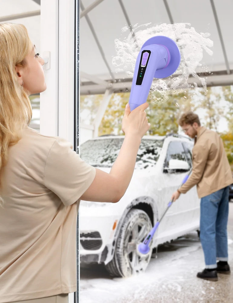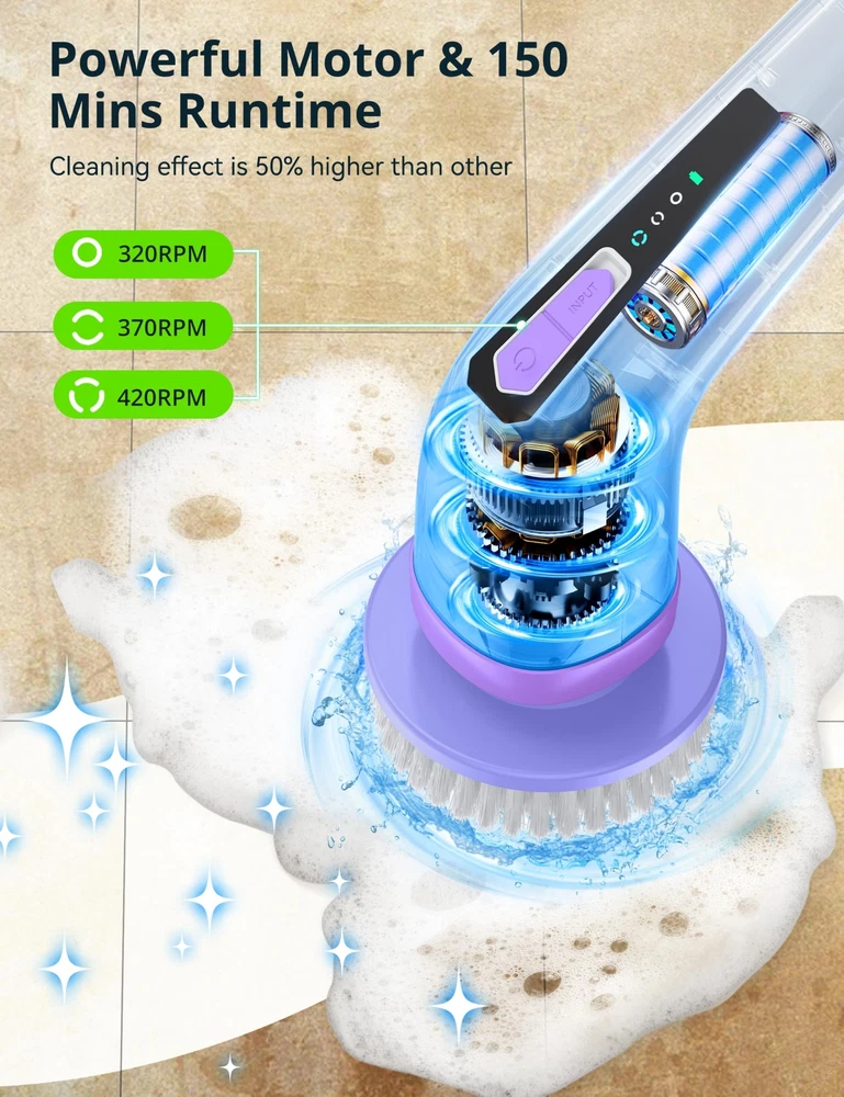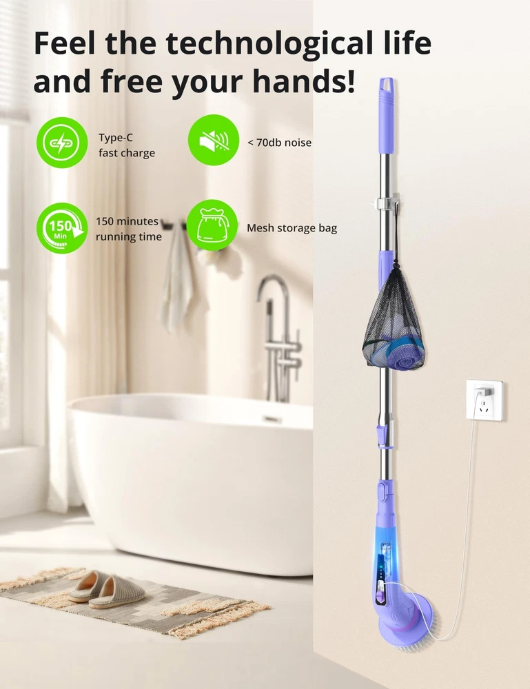 Multi-Functional Cleaning Tool: Spin Scrubber is a versatile and powerful cleaning brush that excels at tackling various cleaning tasks. Whether you need to remove limescale in the bathroom, clean tiles and floors, or even clean your car's interior and exterior, Shower Scrubber's 8 interchangeable accessory brush heads are designed for specific surfaces or types of dirt, making it adaptable to any cleaning task. Powerful and Adjustable Design: With its cordless and powerful motor, Electric Spin Scrubber offers superior cleaning ability to effectively remove stubborn stains and dirt. It features three adjustable speed settings (320RPM, 370RPM, 420RPM), allowing you to customize the cleaning intensity based on your needs. From gently cleaning delicate surfaces with the low speed setting to tackling the most stubborn dirt with the high speed setting, Bathroom Scrubber provides maximum cleaning performance. Plus, with a 150-minute battery life(2500mAh) and 4H fast charging(Type-C), you can clean without interruption. Ergonomic and Adjustable Length: Designed with user comfort in mind, bathtub scrubber has an adjustable handle length ranging from 40 to 50 inches. This feature allows you to reach higher areas like walls or clean underneath low furniture without excessive bending or stretching. It is especially beneficial for the elderly or those with physical limitations, as it significantly reduces physical exertion during the cleaning process. The detachable design (12 inches) further enhances convenience. High-quality Waterproof Design: Our electric cleaning brush is equipped with an IPX6 waterproof design, ensuring safe usage in wet environments such as bathrooms or kitchens. You can even place it directly underwater for rinsing without worrying about rust or short-circuit problems. This high-quality waterproof design not only guarantees safety during use but also ensures long-term reliability and easy maintenance. User-friendly and thoughtful design: Our cordless spin cleaning brushis designed with ease of use in mind. We provide detailed instructions to guide you through using the product effectively. Additionally, it is accompanied by a storage hook and brush head storage bag, saving space and keeping everything organized. Furthermore, we have a professional after-sales team ready to provide you with excellent customer service, ensuring a comfortable and worry-free experience with our Spin Scrubber.