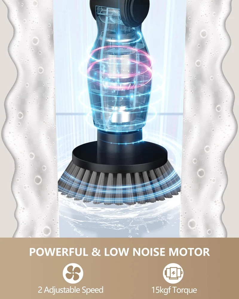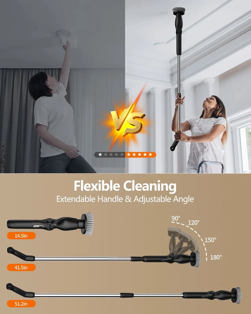 【High Torque & Low Noise Motor】YMG-818 spin scrubber can help you remove stubborn dirt and stains effortlessly and efficiently. Up to 400RPM, 15kgf torque, 55db low noise, power scrubber features a high-performance motor for deep cleaning, which is much higher than the average of other shower cleaning brushes. There are two spin speed modes to meet your different cleaning needs. Now cleaning becomes easy! 【8 Replacement Brush Heads】As always, electric spin scrubber includes 8 replaceable cleaning brushes for various scenarios. Dome brush for the tub; Flat brush for surfaces like tile floor, wall, and pool; corner brush is great for cleaning grout, faucets, edges; cloth brush for wooden floor and furniture cleaning; the sponge is for the window. Moreover, you can even polish and wax your car with those heads. 【Length and Angle Adjustable】electric scrubber can be adjusted from 14.5-51.2in, 4 adjustable angles (90°, 120°,150, 180°). So you can use it to clean those hard-to-reach areas freely and easily without kneeling or bending over. No more back-breaking work and no single dirt left behind. 【2 Ways to Control】Thanks to the extra remote controller on the long handle, you can now adjust the speed or turn the machine on/off without bending or kneeling. It's a small change to save your knees and back. Besides, you can also control the machine with the controller on the short handle. Notice: the machine requires a long pressing to turn on. 【Ideal Gift for Your Family, 2-Year Warranty】specialized in electric household cleaning brushes for many years. We are dedicated to providing more cleaning tools that can help you and your family do the cleaning in an easier way. We provide a 90-day worry-free refund and a 2-year extended warranty for free. Please feel free to contact us if you encounter any problems.Please feel free to contact us if you encounter any problems.