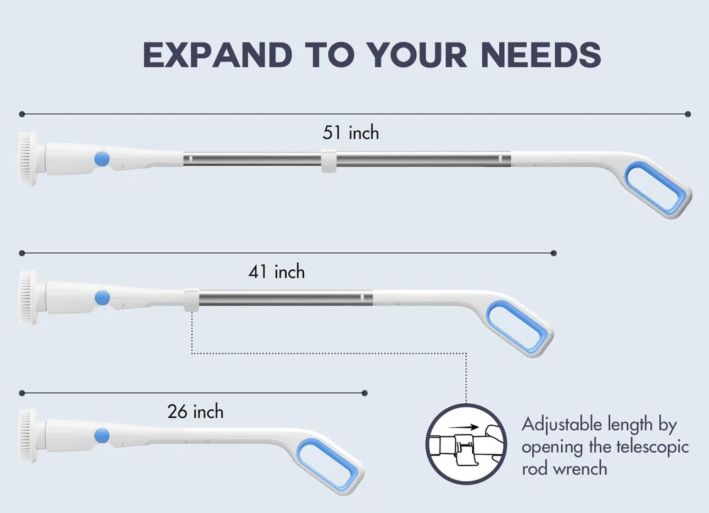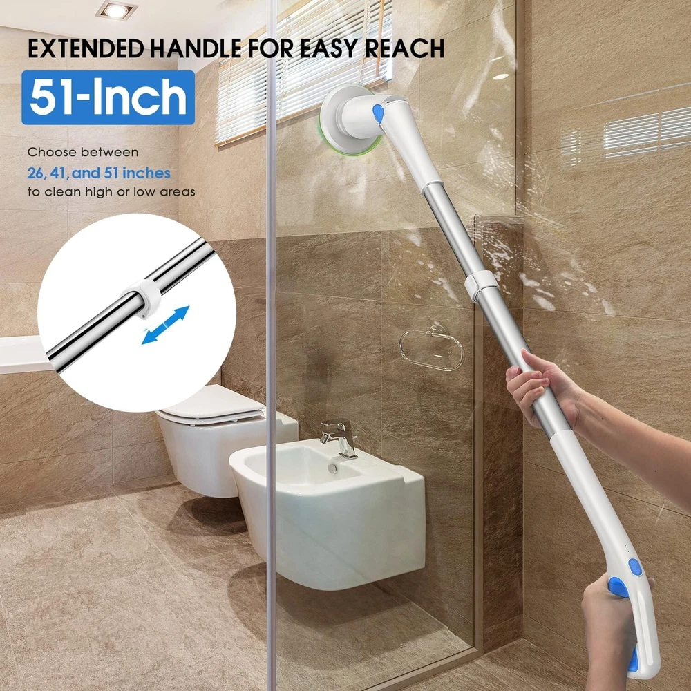Electric Spin Scrubber Shower Scrubber,IPX7 Waterproof Electric Scrubber for Cleaning,Cordless Cleaning Brush with 8 Replaceable Brush Heads Adjustable Extension Long Handle,for Bathroom Kitchen Product Details Brand: Cakila Color: White Blue Handle Material: Plastic Specific Uses For Product: Window, Floor, Table, Grill, Tile, Refrigerator, Drain, Kitchen, Patio, Vent, Comb, Wall, Bathroom, Ceiling, Furniture, Dryer Vent, Vehicle, Counter, Sink, Air Conditioner, Computer, Pool, Dish, Golf Club, Metal Cleaner See more Product Dimensions: 7.08"L x 6.3"W x 17.56"H Brand: Cakila Color: White Blue Handle Material: Plastic Specific Uses For Product: Window, Floor, Table, Grill, Tile, Refrigerator, Drain, Kitchen, Patio, Vent, Comb, Wall, Bathroom, Ceiling, Furniture, Dryer Vent, Vehicle, Counter, Sink, Air Conditioner, Computer, Pool, Dish, Golf Club, Metal Cleaner Product Dimensions: 7.08"L x 6.3"W x 17.56"H Material: Aluminum Special Feature: Portable Shape: Round Included Components: Attachment Surface Recommendation: Floor, Porcelain, Vinyl, Wood, Glass, Tile, Plastic, Metal, Windows, Stone Number of Items: 1 Theme: Cleaning Item Firmness Description: Medium Manufacturer: Cakila Unit Count: 1.0 Count Item Weight: 4.27 pounds Country of Origin: China Item model number: DDQJS13 Date First Available: December 19, 2024 Time-Saving and Efficient Cleaning: This electric spin scrubber makes cleaning easier and faster through its efficient design. Compared with traditional bathroom cleaner, shower scrubber can save up to two-thirds of cleaning time - from 1 hour to 45 minutes. Its lightweight design makes it easy for the whole family to use, especially suitable for the elderly, pregnant women, arthritis patients, and people with limited mobility. There is no need to bend down or kneel when using it, which avoids pressure on the back and knees. This electric scrubber for cleaning not only improves cleaning efficiency, but also greatly reduces the burden on the body, making it an ideal choice for daily cleaning Two-Speed Powerful Motor: Shower scrubber equipped with two working speeds, the first gear speed is 230 rpm/min and the second gear speed is 255rpm/min, which can be switched with just one button operation. Our electric scrubber for cleaning is equipped with a 4V/74W advanced noise reduction motor, coupled with a 2000mAh large-capacity battery, which enables 2.5 hours of fast charging through the Type-C interface, providing up to 90 minutes of continuous cleaning Flexible Adjustable Handle: Shower scrubber with long handle is equipped with a retractable stainless steel handle, the length can be adjusted from 26 inches to 51 inches, and the angle adjustment range is from 90 to 180. This allows you to easily clean every corner of your home without having to kneel or bend down. This new bathroom cleaning supplies will change your cleaning experience and let you say goodbye to the inconvenience of traditional cleaning tools IPX7 Waterproof Multi-Function: Bathroom cleaner with long handle except for the top handle, ourspin brush for cleaning bathroom is designed with an IPX7 waterproof rating as a whole, which can be washed directly under the faucet without worrying about damage. Electric scrubber suitable for bathtubs, swimming pools, ceilings, glass, countertops, floors, tiles, kitchens, walls, windows, cars and many other scenes, it is a multi-functional tool that meets all your cleaning needs 8 Types of Replace Brush Heads: Our electric spin scrubber comes with 8 types of replaceable brush heads, including 4 cleaning heads, 1 cleaning sponge, 1 scouring pad, 1 coral mop and 1 Nylon cleaning head. Whether you're cleaning bathroom tubs and toilets, large hard surfaces, nooks and crannies, detail work, or smooth surfaces like glass or cars, our brush heads can meet your needs. All brush heads are designed to be firm and not easy to fall off