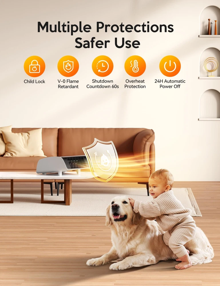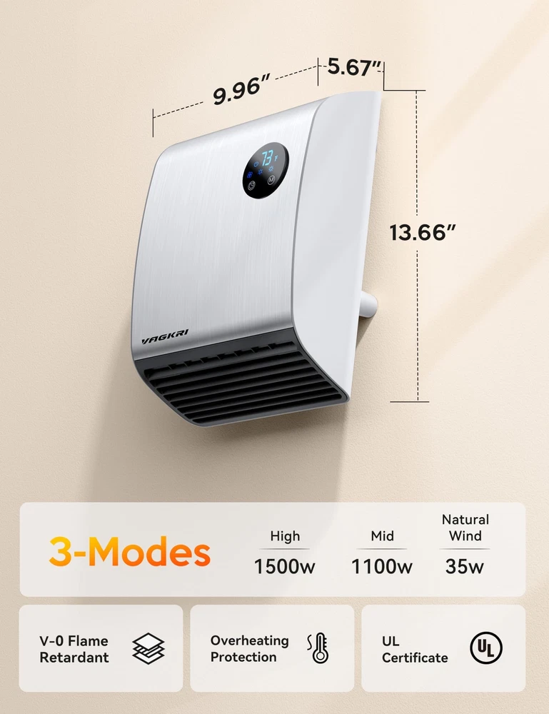 Electric Wall Heaters for Indoor - 2S 1500W Fast Heating Space Heaters for Indoor Use, Energy Efficient Indoor Space Heater Panel Wall Heaters with 3 Fan Speeds, Thermostat, Remote Continuous use for 24 hours, in order to avoid accidents, the heater will be automatically turned off. Multiple Protection Safety System - The heaters are made of V-0 flame retardant material to avoid any fire hazard, the UL 1278 Test underscores its commitment to your safety. The overheating protection system will shut off the space heater if it overheats. Child lock design gives you peace of mind and protects children, the elderly and pet. Heat the Way You Like - with multiple modes (high/medium/fan only), high-grade (1500W) can quickly heat up to the temperature you need in 2s, mid-range (1100W), fan (35W). 50-95℉ adjustable temperature , use the digital thermostat to personalize your own comfort level from 50 to 95 degrees Fahrenheit in 1 degree Fahrenheit increments. Precise heating for precise comfort. Compact and Powerful - 9.96" x 13.66" x 5.67"", the portable heater can be hung directly on the wall or placed on the table without taking up much space. Touch design, you can directly touch the screen to set the temperature, or you could control the temperature you want by remote control. Modern design with elegant bottom vents and remote controls to keep you warm anytime, anywhere. Easy to Install - Installs easily in minutes (no electrician required). Easy to operate and clean, with no moving parts, just daily wipe down maintenance. Compared to expensive central heating systems, there are no additional installation costs and you can do it yourself. Slim, sleek, space-saving design reduces floor clutter! Save Energy - The Portable Air Heater can heat any desired area of your home at any time. Safe and efficient heating capacity can replace central heating systems. 0-12 hours automatic shutdown, you can set the shutdown time after falling asleep to save your electricity bill. Note: There is a 60s countdown for turnoff to prolong the service life of the heater.