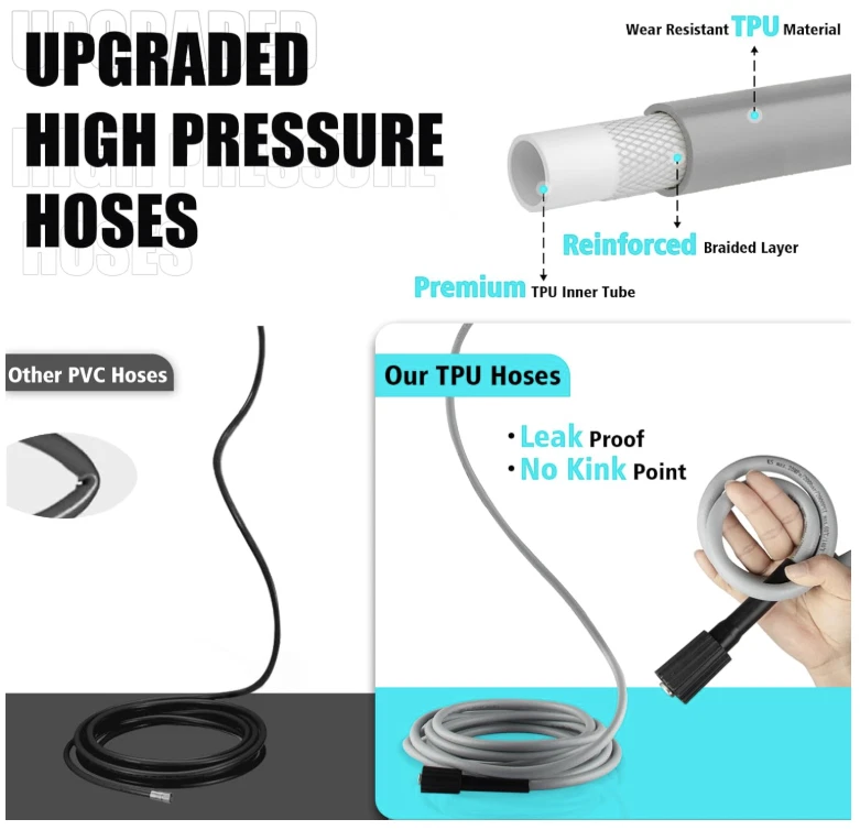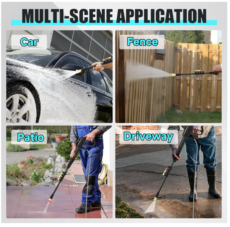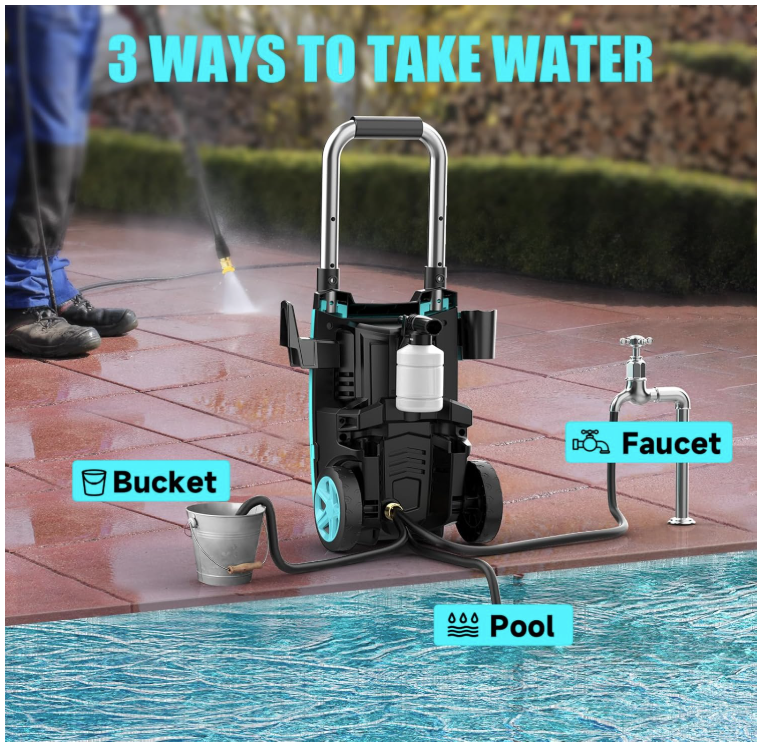 English: 【POWERFUL CLEANING】Generating up to 4300 pounds per square inch (PSI) of pressure with a flow rate of 3.0 gallons per minute (GPM). While saving water, electric pressure washer can easily remove stubborn stains, which makes it ideal for cleaning various surfaces in the home, such as cars, bicycles, fences, sidewalks, walls, courtyards, etc 【4 DIFFERENT NOZZLES】Our electric power washer with 4 quick connection nozzles (0°,15°,25° and 40°). 0 ° provides super high pressure - suitable for stubborn stains on concrete and hard surfaces of bricks. 15 ° provides high pressure - used for cleaning direways and hard surfaces. 25 ° provides medium pressure - suitable for decks and wooden surfaces. 40 ° provides low pressure - suitable for vehicles and windows 【EASY TO USE】Equipped with a 20 FT hose and 35 FT power cord, ensuring that the pressure washer has a sufficient range of use, and rollers make it easy to move around. Soap tank can achieve foaming effect in an instant. Evenly spray a large area of foam. Thicker and dense foam is perfect for car washing & general use 【3 WATER-SUCKING WAYS】The electric high pressure washer can choose bucket self-priming water or pool self-priming. At the same time, you can also connect faucet self-priming. (connect faucet not included) 【UPGRADED DESIGN DETAILS】This pressure washer attaches a 35-foot power cord with inline GFCI for use. It helps you control and check the power using. In addition, this pressure washer adopts metal spiral interface design to prevent water leakage and we have also upgraded the handle to make it be more humane 【PROFESSIONAL AFTER-SALES SERVICE】If you have any problems using power washer, please feel free to contact us and we will provide service and assistance within 24 hours Spanish: 【LIMPIEZA POTENTE】Genera hasta 4300 libras por pulgada cuadrada (PSI) de presión con un caudal de 3.0 galones por minuto (GPM). Ahorrando agua, esta hidrolavadora eléctrica elimina fácilmente las manchas difíciles, ideal para limpiar diversas superficies del hogar, como autos, bicicletas, cercas, aceras, paredes, patios, etc. 【4 BOQUILLAS DIFERENTES】Nuestra hidrolavadora eléctrica cuenta con 4 boquillas de conexión rápida (0°, 15°, 25° y 40°). La boquilla de 0° proporciona una presión extremadamente alta, ideal para manchas difíciles en concreto y superficies duras de ladrillo. La boquilla de 15° proporciona alta presión, ideal para limpiar pasillos y superficies duras. La boquilla de 25° proporciona una presión media, ideal para terrazas y superficies de madera. 40° proporciona baja presión, ideal para vehículos y ventanas. 【FÁCIL DE USAR】Equipada con una manguera de 6 metros y un cable de alimentación de 10,6 metros, garantiza un amplio rango de uso. Los rodillos facilitan su desplazamiento. El tanque de jabón crea espuma al instante. Rocía una amplia área de espuma de manera uniforme. Su espuma densa y espesa es perfecta para el lavado de autos y uso general. 【3 MODOS DE ASPIRACIÓN DE AGUA】La hidrolimpiadora eléctrica de alta presión puede elegir entre autocebante de cubo o de piscina. También puede conectar el grifo para autocebante (no incluye el grifo). 【DETALLES DE DISEÑO MEJORADOS】Esta hidrolimpiadora incluye un cable de alimentación de 10,6 metros con interruptor diferencial integrado. Esto le ayuda a controlar y verificar el consumo de energía. Además, esta hidrolavadora incorpora un diseño de interfaz en espiral de metal para evitar fugas de agua y hemos mejorado el mango para un manejo más humano. 【SERVICIO POSVENTA PROFESIONAL】Si tiene algún problema con la hidrolavadora, no dude en contactarnos y le brindaremos servicio y asistencia en 24 horas.