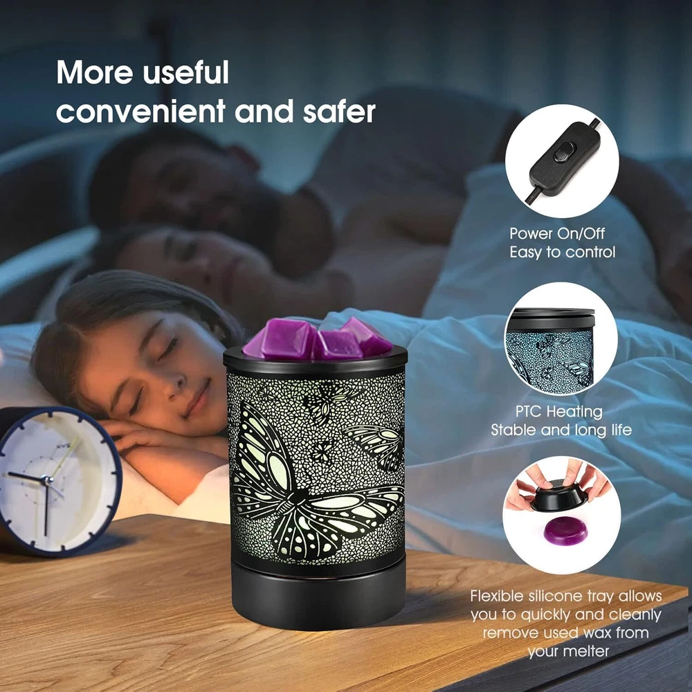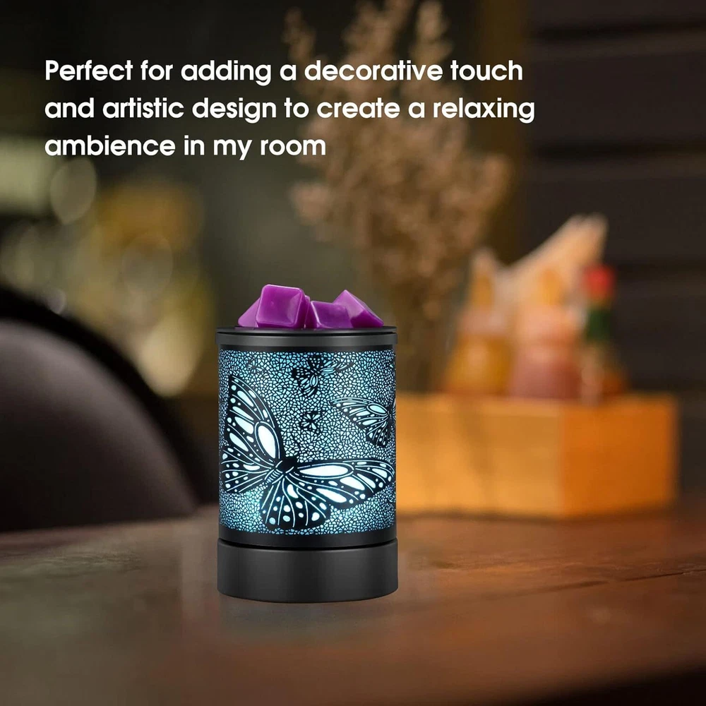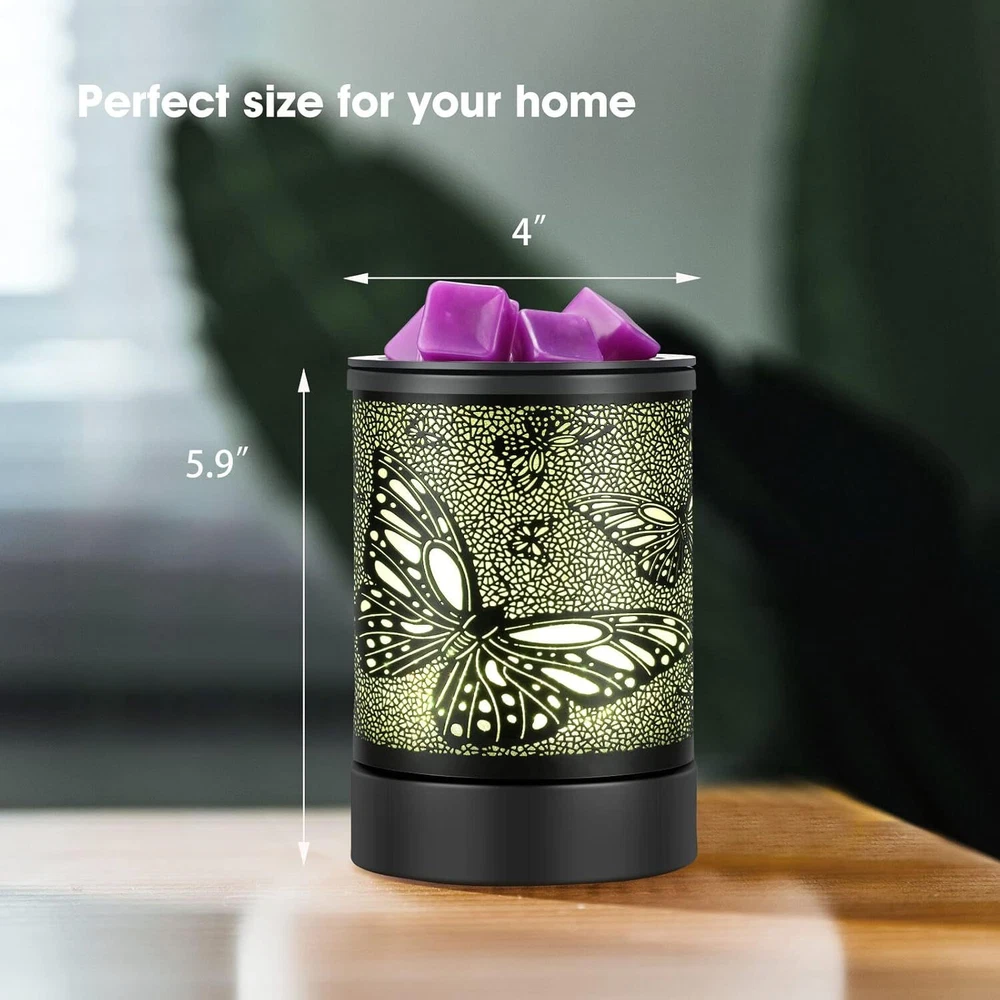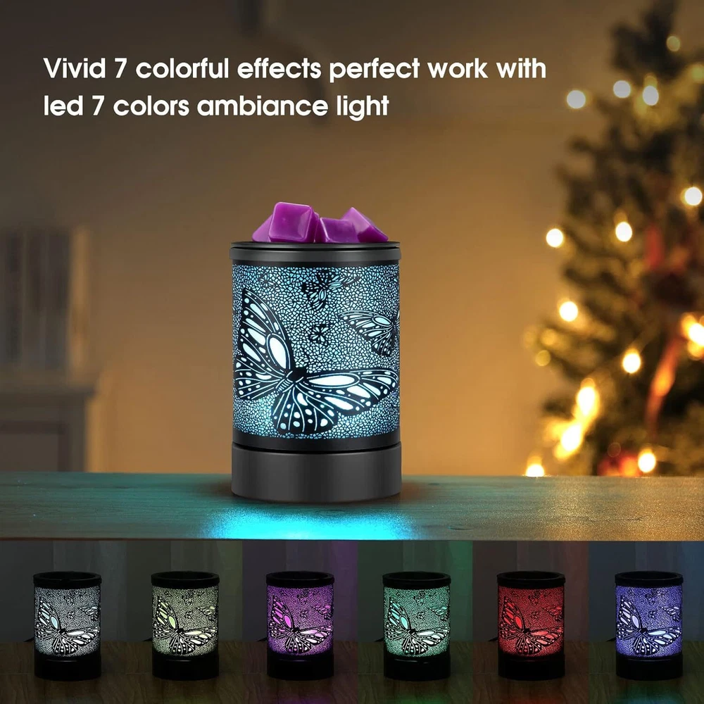 Electric Wax Melter Black Metal Oil Burner Led 7colors Candle Wax Warmer Removable Silicone Tray Aroma Fragrance Lamp for Home Product Details Package Dimensions: 6.77 x 5.04 x 4.84 inches Item Weight: 1.19 pounds Manufacturer: INRORANS Country of Origin: China Item model number: HDR8243 Batteries required: No Cute Pattern: This elegant Electric Wax Melts Burners lights up to showcase a sweet pattern and is compatible with both scented fragrance oils and wax melts, This electric wax warmer is built-in heating PTC element, reusable silicone liner, modern 7 colors led Night light, a perfect wax warmer for scented wax melts or oils, perfect gift option for your families,and friends Air Freshener & Night Light:Our Glass Oil Burner can be used with scented candles. Relax and enjoy your surroundings with beautifully wax melt scents or fragrance oils in our electric dragonfly warmer. Wax burns slower and more gently in an a wax warmer than it does in a tea-light burner but the scent lasts longer.This wax burner fragrance wax warmer also built in 7 colors Cycle changing which further adds atmosphere.The wax warmer for scented wax melts also can be as night light lighting Quick Heating:Inrorans wax warmer electric warm and heat the wax melts faster and more stable with PTC technology,This fragrance Warmer Candle Wax Warmer can heat your favorite scented candle safely and flameless to avoid fire breaking out and air pollutionor other pollutants.Compare with traditional bulbs,this tart warmer,no need replace bulb,which avoid some troubles. Removable Silicone liner:The flexible silicone tray liner allows you qukickly remove wax or melts from electric wax burner ,easy to clean,Convenient and useable,BTW,this liner of wax c,andle warmer is dural and be resued .