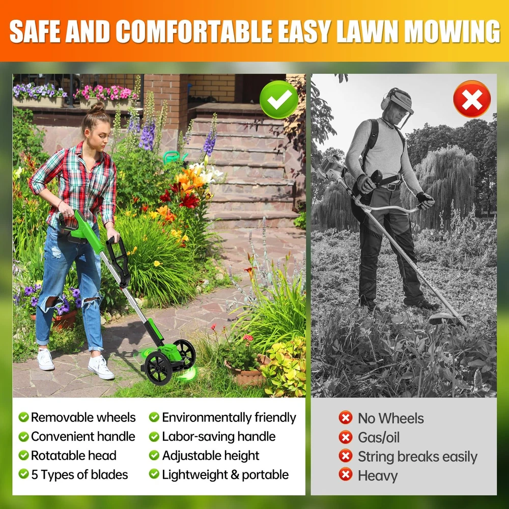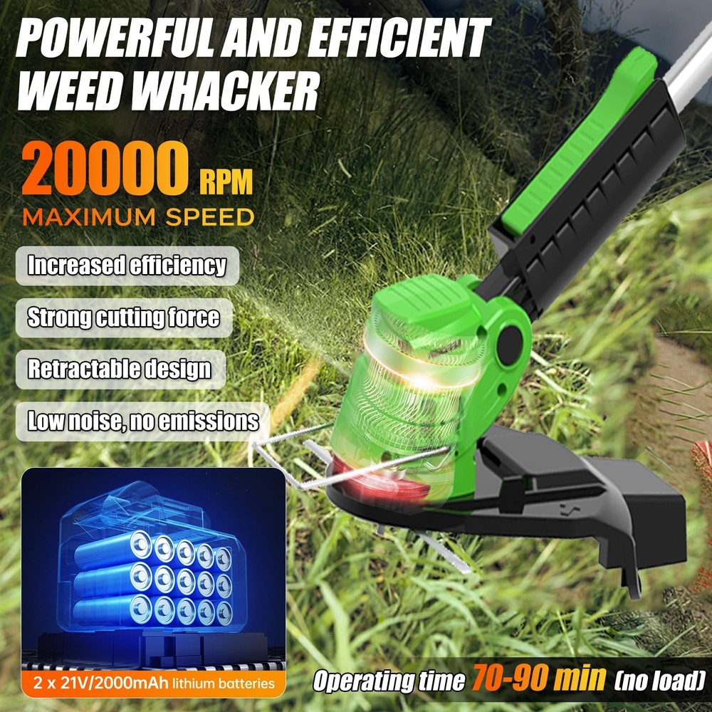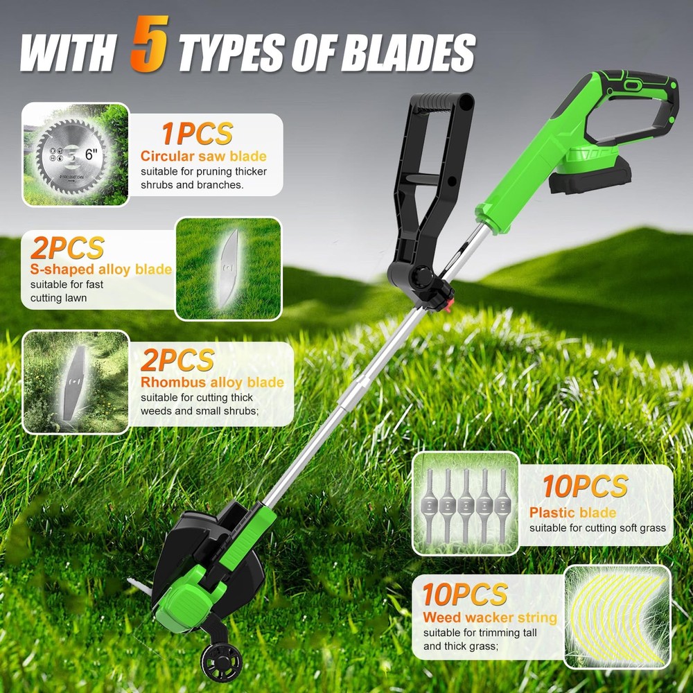 The multifunctional cordless electric weed wacker is versatile and can be used as grass trimmer, edger, lawn mower, easy for different cutting jobs. Upgrade 650W electric weed wacker battery powered is built to handle heavier workloads, allows the electric lawn mower cordless to achieve a maximum 20000 RPM speed. With LED power display, detachable wheels, Rich auxiliary accessories to improve work efficiency 👍👍👍【The Latest Cordless Weed Wacker for 2025】👍👍👍The newly upgraded Cordless string trimmer has stronger power, simpler operation, more comprehensive functions, and longer usage time! 【Powerful Efficient Weed Wacker】The multifunctional cordless electric weed wacker is versatile and can be used as grass trimmer, edger, lawn mower, easy for different cutting jobs. Upgrade 650W electric weed wacker battery powered is built to handle heavier workloads, allows the electric lawn mower cordless to achieve a maximum 20000 RPM speed. With LED power display, detachable wheels, Rich auxiliary accessories to improve work efficiency 【5 Kinds of Replaceable Blades】:This battery operated weed wacker is equipped with 5 kinds of blades. Nylon Blade blade for mowing young grass. Stainless steel blade for fast cutting lawns,weeds and small shrubs. Stainless steel S-blades are well for older weeds, reeds, etc pruning. weeding rope is suitable for trimming weeds on the roadside. A weed trimmer circular saw blade made of manganese steel with high cutting power for trimming thick bush branches 【New shaped Handle & Lightweight & Safe Design】 Our stringless electric weed whacker weighs only 3.5 pounds, lightweight, even the elderly or women can easily control and use it. With double safety button design, you need to press the safety lock and trigger at the same time to start the brush cutter, ensures your safety. New shaped ergonomically designed handle for long hours of work without feeling tired, can be hung anywhere. Easily keep your garden and yard clean and tidy 【Height and Cutting Angle Adjustable 】 The no string trimmer is equipped with adjustable telescopic shaft, which can be adjusted freely from 33" to 47" to meet the needs of most people's garden pruning work. The pivoting head of this electric weed trimmer can be adjusted (0 - 90°) to help you enter the hard-to-reach corners without cord limitation. Retractable design, which can further reduce the occupied space and make it more convenient to move and store 【2Pcs 21V/2000mAh lithium battery (high power, high efficiency)】2000mAh electric brush cutter mower with higher efficiency and longer run time (70-90mins no loading/40-60mins working time), charging time (2-3hours), The two batteries can work alternately, easily weeding the entire yard.compared with a gas weed wacker, it has lower noise, no emissions, does not need to start several times, and very little maintenance 【Top quality customer service】We provide 3 years guarantee of product service. If you have any questions about our grass cutter machine, please contact us, we will always provide you with the best service until you are satisfied