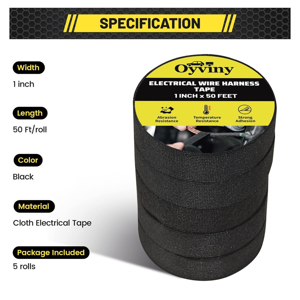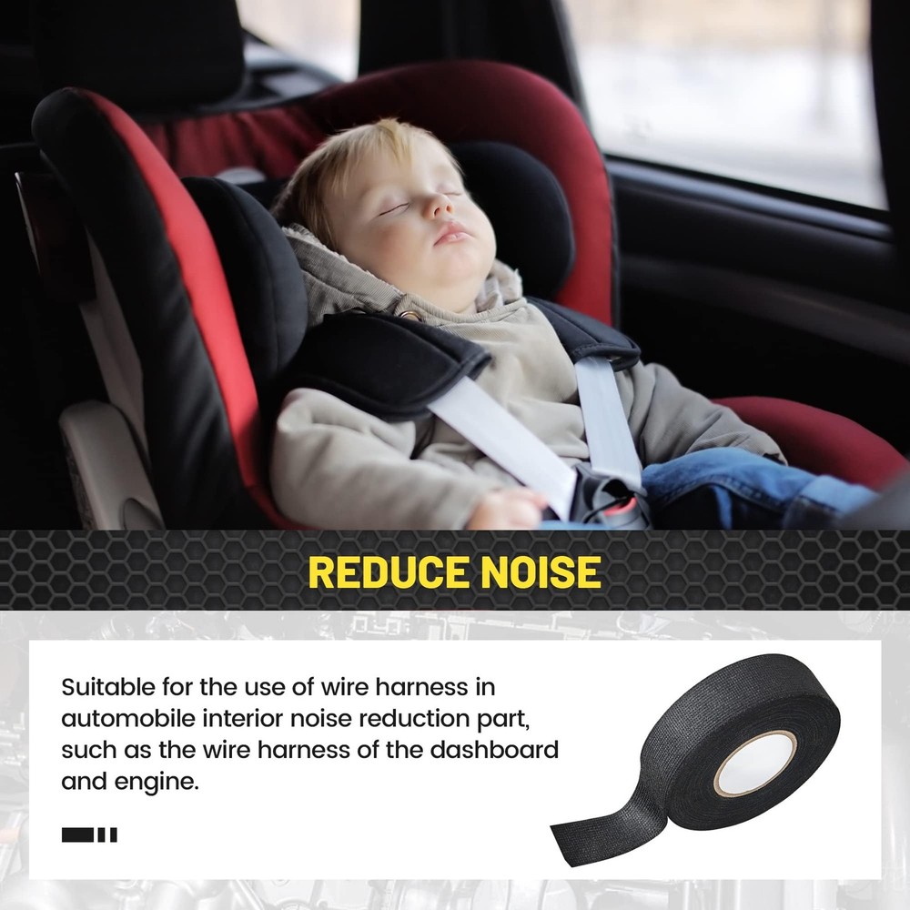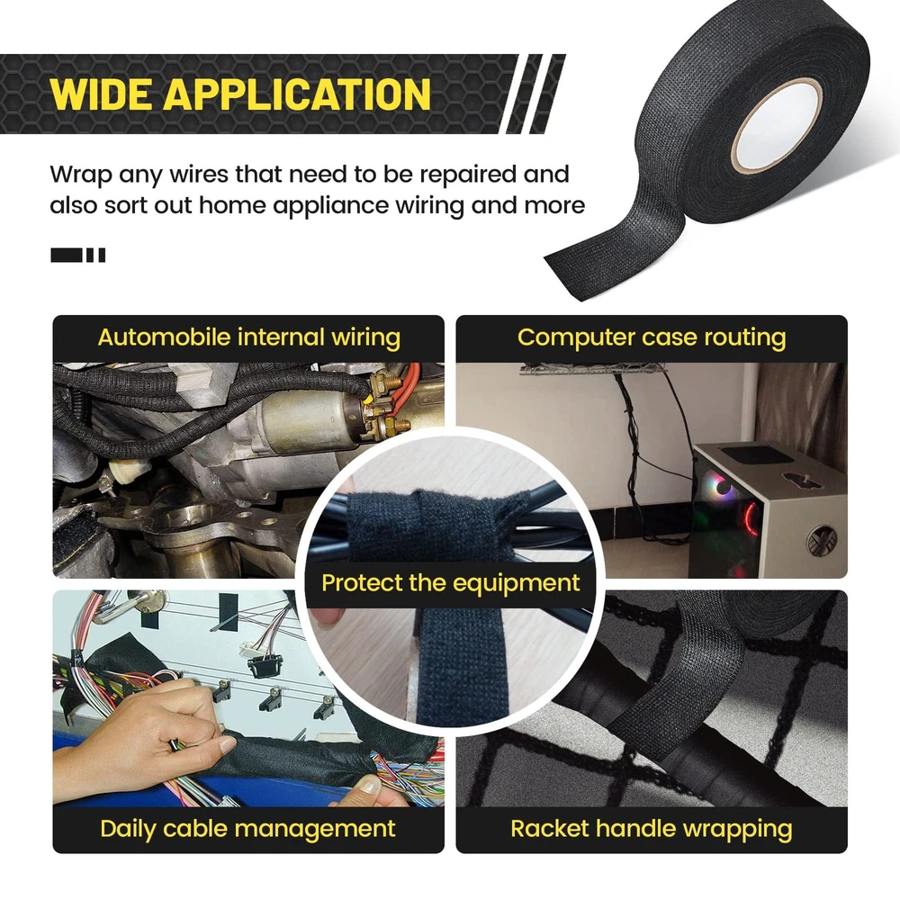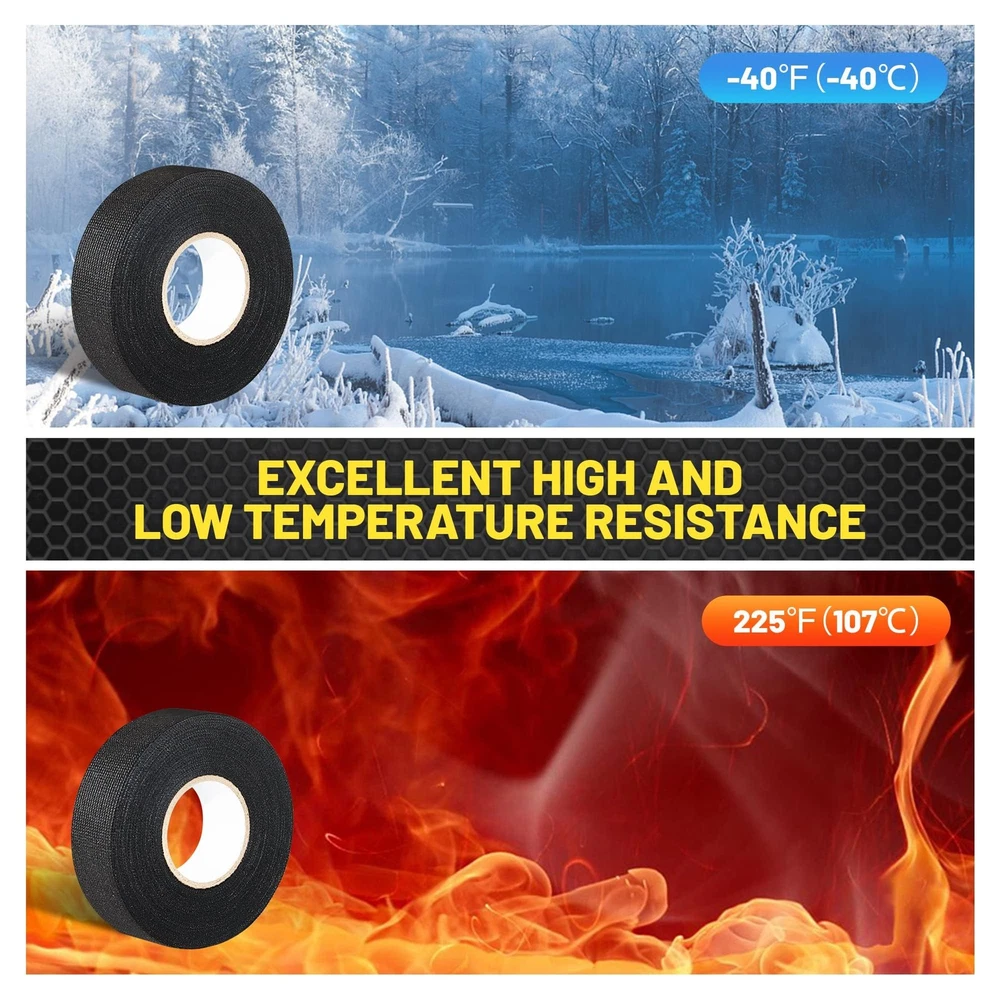 Wire harness cloth electrical tape is nice for battery winding insulation, automobile interior noise reduction, wire joint and wire fixing. Wire harness automotive cloth tape has strong anti-aging, resistance material and high stability at high temperature. This heat resistant tape for car engine is also an excellent smoke tape. Wire Harness Cloth Tape Application: Automotive wire loom tape is widely used in the area near the engine, battery or on normal wire harness and also suitable for the use of wire harness in automobile interior noise reduction part, such as instrument panel harness; Wrap any wires that need to be repaired Temperature Resistance: Electrical wiring harness cloth tape made of high-quality polyester non-woven fabric and strong acrylic pressure sensitive adhesive, with high adhesive Force, abrasion resistance and high-temperature resistance (-40℉- 225℉) Easy to Tear: automotive cloth tape is easy to tear and convenient to use, just wrap the harness cloth tape around the wiring harness and gently tear it apart, No tools required; You could tear the tape at any length according to your need Good Performance: Automotive wire loom harness cloth tape is wear-resistant and with strong anti-aging, which can be applied for a long time; It is also suitable for automotive circuit and engine maintenance to achieve the effect of insulation protection Harness Cloth Tape Size: Package comes with 5 rolls 25mm x 15m electrical wire harness tape, each roll radio wiring harness cloth tape is 1 inch width and 50 feet length, the size and length is suitable for your daily use