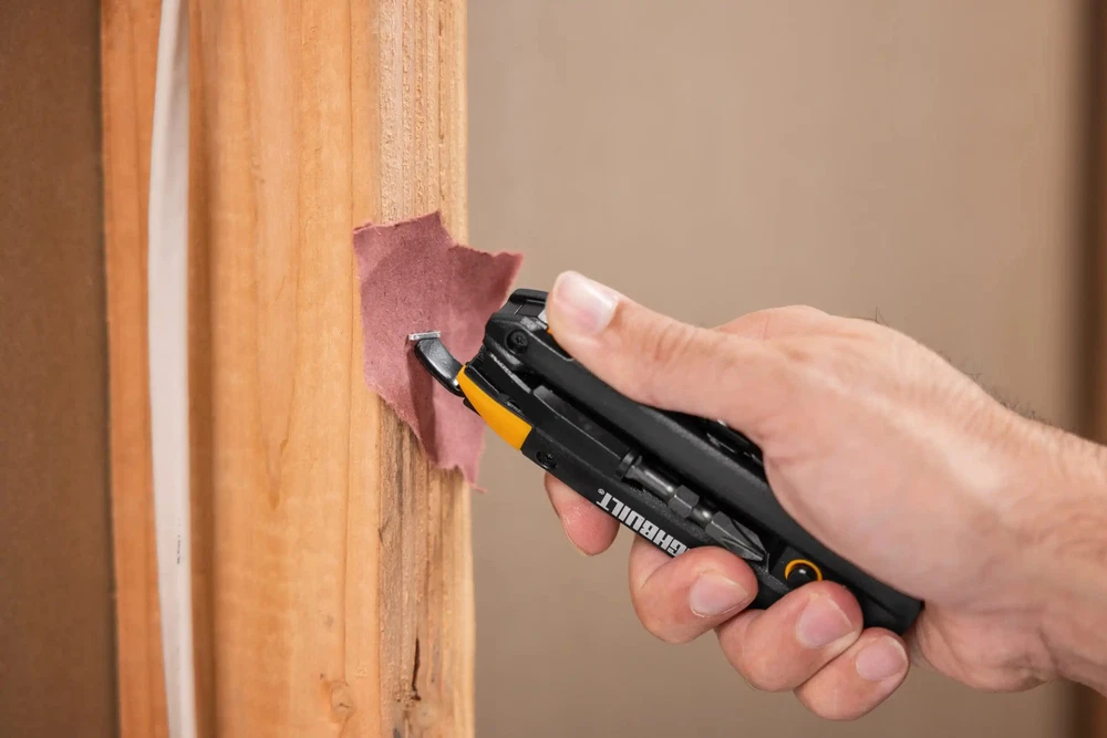 TB-H4-12-IM Electrician's Folding Utility Knife with Bit Driver + Pry Bar Electrician's Folding Utility Knife is designed for convenience and durability, with 5 built-in tools. Equipped with a wire and string cutter, as well as a prying tool, double-ended screwdriver bit (PH2/SL1-4-in), and a 1/4-in bit holder/nut driver, this knife empowers you to tackle a variety of tasks, from cutting through tough materials to prying open containers to tightening or loosening screws and bolts. The button lock ensures that the knife stays firmly in place when open, providing a reliable cutting experience. Plus, the blade-release button allows for quick, tool-free blade changes, so you can replace a dull blade or adapt to different tasks on the fly. Blade storage in the handle holds up to 3 blades. A sturdy belt clip keeps this utility knife at your side when you need it most. Elevate your cutting experience with 5-in-1 Electrician's Folding Utility Knife - a tool that's versatile, convenient, and built to last.