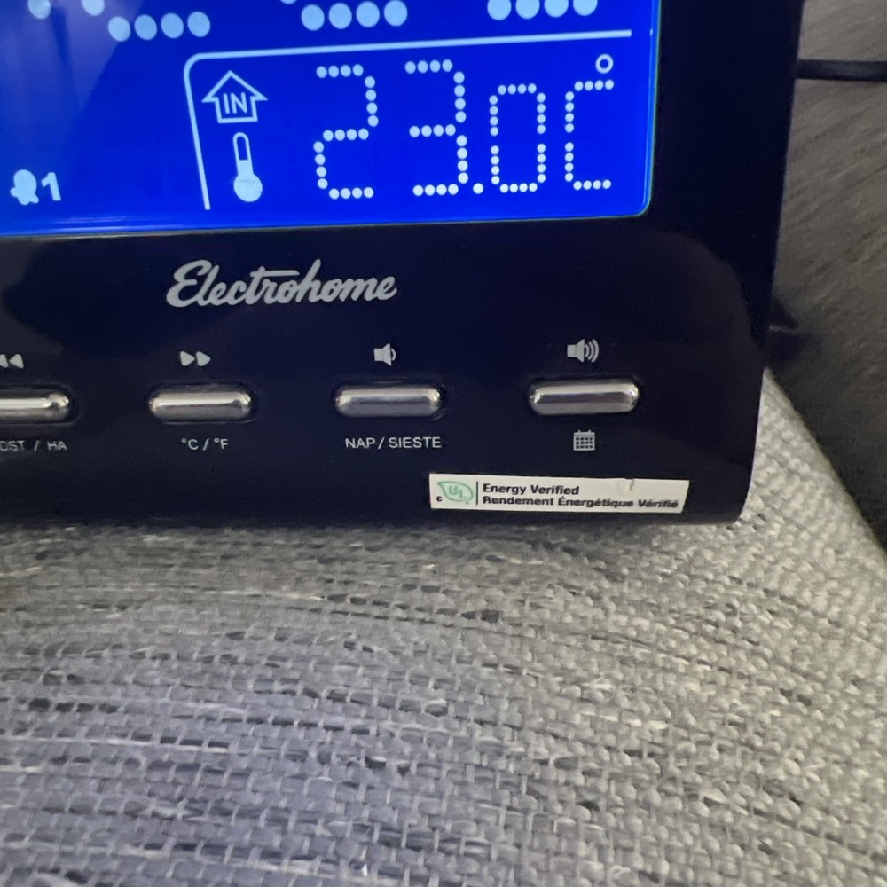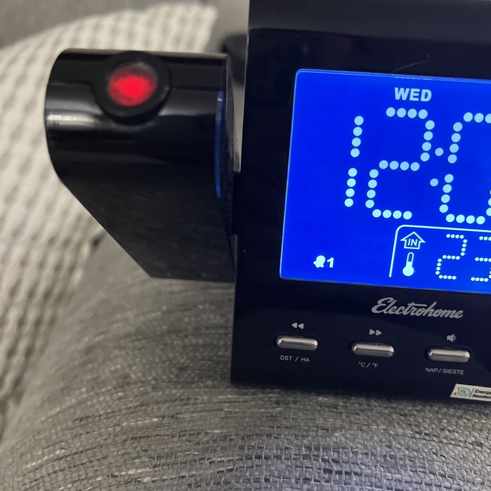 The Electrohome EAAC601 Projection Alarm Clock with AM/FM Radio is a modern and stylish clock radio with a crowned top design in black plastic. It features a quartz movement for accurate timekeeping and comes with Amazon Alexa smart home compatibility. This clock radio includes dual alarms, an LCD display, AM/FM radio, battery backup, day/date display, temperature display, and a 3.5mm auxiliary input for added convenience. Perfect for use in the bedroom or bathroom, this alarm clock adds a touch of abstract style to your home decor with its unique design and features.