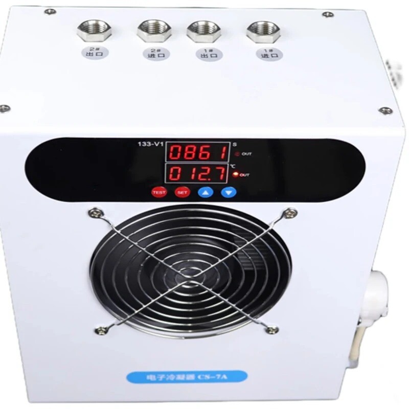 Electronic condenser small dual channel smoke detector stainless steel cold cavity CEMS gas dehumidification cooler Name: Electronic condenser Model: CS-7A Voltage: AC 220V 50Hz Rated current: 0.7A Power: 150W Flow: 10L/min Outlet dew point: ≤5℃ Rated pressure: ≤0.2Bar Air inlet: G1/4 Air outlet: G1/4 Drainage outlet: Φ5 Drainage method: peristaltic pump Inlet temperature: ≤60℃ Cold cavity temperature: 0-10℃ Drainage time: 0-9999S Number of channels: 2 Size: 240*127*290MM Working environment temperature: 0-35℃ Bottom mounting hole size: 230*89MM hole Φ7 Back mounting hole size: 177*237MM hole Φ7 Product introduction: This product is an electronic refrigeration gas condenser. It is used to cool the hot and humid sample gas to reduce the water content of the sample gas to achieve the purpose of gas-liquid separation.