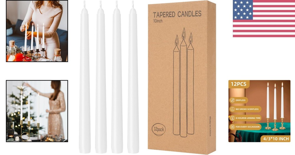 Elegant 10 Inch White Taper Candles - 12 Count, Ideal for Weddings & Home Decor ‹ › ‹ › ‹ › ‹ › ‹ › ‹ › ‹ › ‹ › Elegant 10 Inch White Taper Candles - 12 Count Ideal for Weddings & Home Decor Key Features: Each taper candle stands at a graceful 10 inches tall. Crafted from high-quality unscented wax for a clean, mess-free burn. Designed for a dripless experience , eliminating the hassle of wax spills. Fits effortlessly into standard taper candlestick holders for a secure fit. Remarkable burn time of up to 8 hours for prolonged illumination. Pack includes 12 taper candles , perfect for all your decorating needs. Benefits: Add a timeless and elegant touch to any occasion. Perfect for romantic settings, weddings, and festive events. Creates an enchanting atmosphere with a warm and inviting glow. Versatile for use as standalone accents or in centerpiece arrangements. Transforms any space into a haven of tranquility and beauty. Why Choose Our White Taper Candles? Elevate your decor with our Elegant 10 Inch White Taper Candles, meticulously crafted to burn flawlessly and driplessly. Envision the beauty they will bring to your next event—be it a romantic dinner or a grand wedding. Their classic appearance blends seamlessly with any decor style, providing that essential touch of elegance. These taper candles not only enhance your space but do so with a consistent, ambient light that lasts for hours. With the convenience of being unscented, they allow you to maintain your chosen fragrance in your space without overpowering scents. Don't miss the chance to create unforgettable moments with our soft, warm glow. Order your 12-pack of taper candles today and transform your home and events into magical experiences that you and your guests will cherish. Shipping Free & Fast Shipping - We offer free shipping to most of the USA with a normal delivery time of 3-7 days. However, due to the current situation, additional delivery time (up to 3 weeks) may be required for some items. Alternative Carriers - We may use alternative carriers (e.g. USPS, FedEx, UPS, etc.) to ensure your package arrives safely and on time. Due to the use of multiple carriers, we are unable to provide a tracking number automatically. Handling Time - Orders are processed and shipped within 1-2 business days of receiving cleared payment. Shipping Restrictions - Shipping to Alaska, Hawaii, Puerto Rico, Guam, and other US territories may incur shipping charges or delivery restrictions. Please contact us before ordering, or your order can be refunded/cancelled. State Restrictions - There may be restrictions based on your state of purchase. For example, certain items may not be shipped to California due to state regulations. Contact for Tracking Updates - If you require tracking updates or have any concerns about the delivery of your order, please feel free to contact us, and we will be happy to assist you. Return 30-Day Hassle-Free Returns - We want you to be completely satisfied with your purchase. If you are not, you can return the item within 30 days of receiving it for a full refund or exchange. Easy Return Process - To start a return, simply contact us and we will provide you with a prepaid return shipping label and detailed instructions. Restocking Fee - There are no restocking fees for returns. However, the buyer is responsible for return shipping costs if the return is not due to a seller's error. Refund Processing Time - Refunds will be processed within 5 business days of receiving the returned item in its condition. Payment We accept all major credit cards, PayPal, and Apple Pay for your convenience. Your payment information is secure and encrypted to ensure a safe and seamless transaction. Please complete your payment within 3 days of purchase to avoid any delays in shipping. Feedback Your feedback is extremely important to us. We strive to provide the best products and customer service possible. If you are satisfied with your purchase, please take a moment to leave us a positive review. If you have any concerns or issues with your order, please contact us before leaving negative feedback. We are committed to resolving any problems and ensuring your satisfaction. Contact Us If you have any questions or concerns, please feel free to out to our customer support team. You can contact us through the eBay messaging system. We are available Monday to Friday, 9:00 am to 5:00 pm EST, and we will do our best to respond to your inquiry within 24 hours. Buy it now and enjoy a pleasant shopping experience! Unit Quantity: 12 Features: Smokeless,Dripless,Long Burning,Unscented Theme: Taper Candles Material: Paraffin Wax Room: Indoor Type: Taper/Dinner Candle Scent: Unscented Color: White Shape: Round Size: Medium Number in Pack: 12 Style: Classic Power Source: None Item Weight: 1.19 pounds Item Width: 10 in Battery Type: None Burning Time: 5 hrs Unit Type: lb