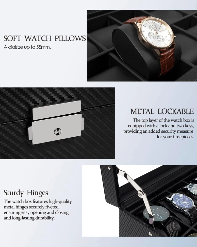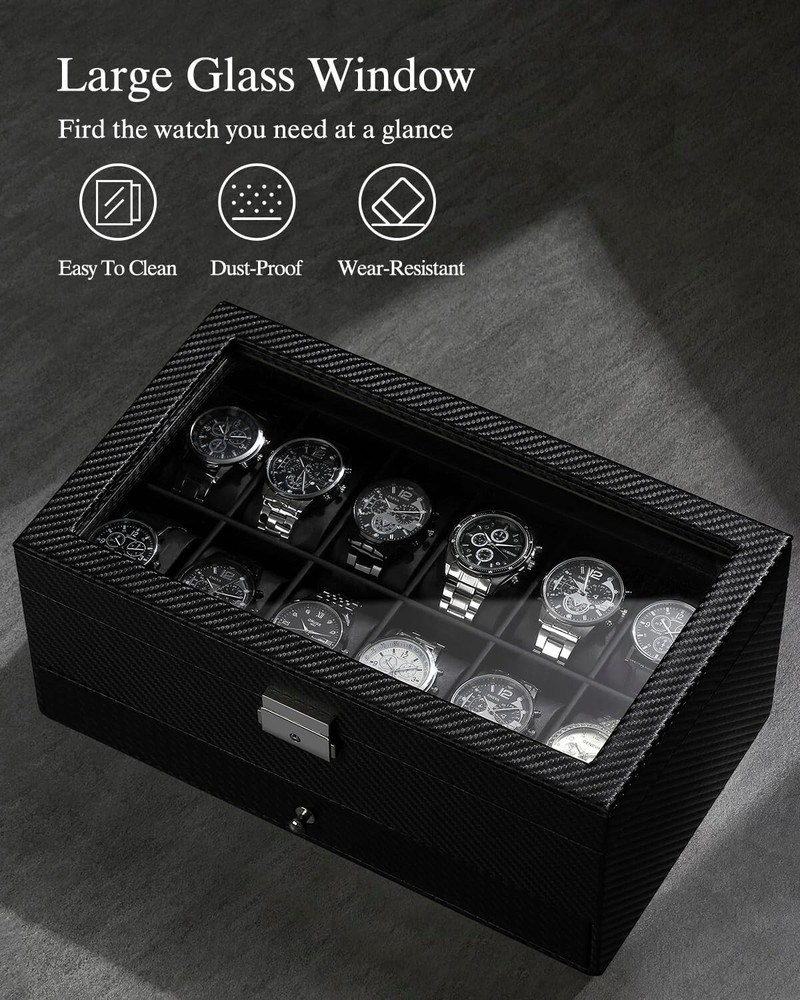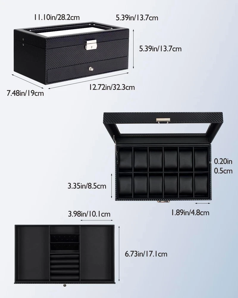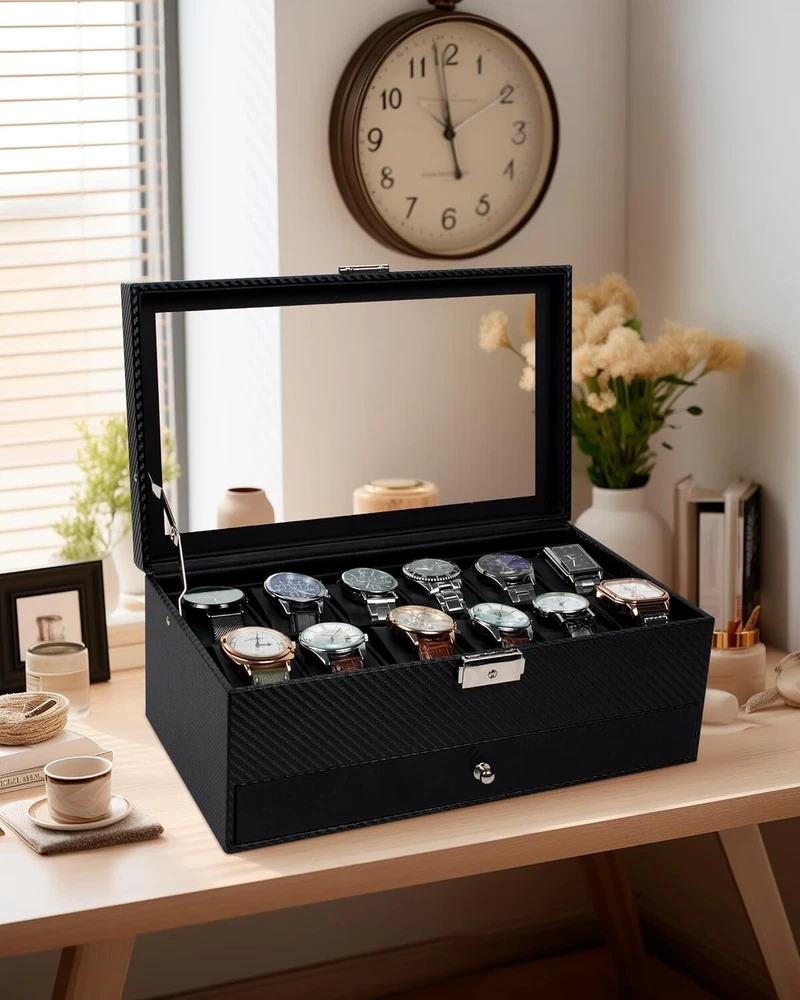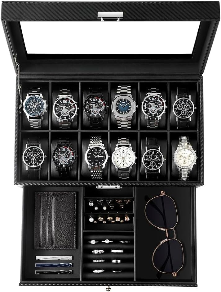 Elegant 12-Slot Watch Box with Glass Lid & Dual-Layer Jewelry Storage
