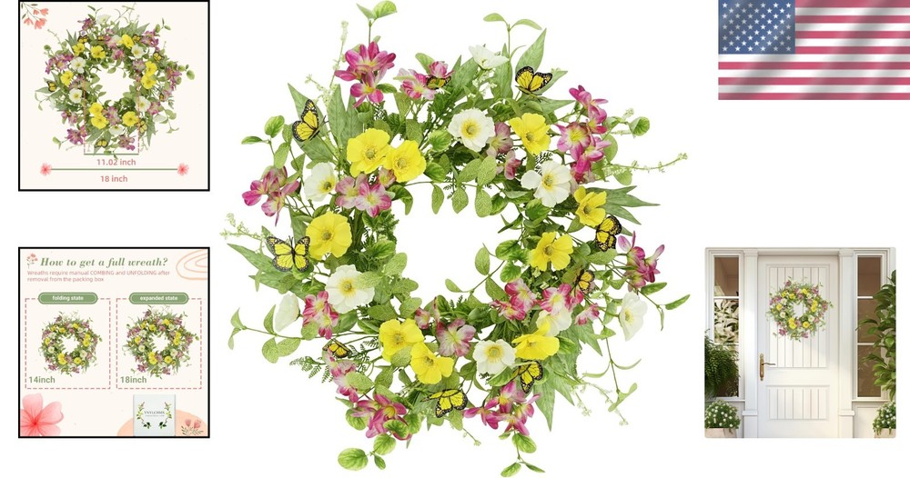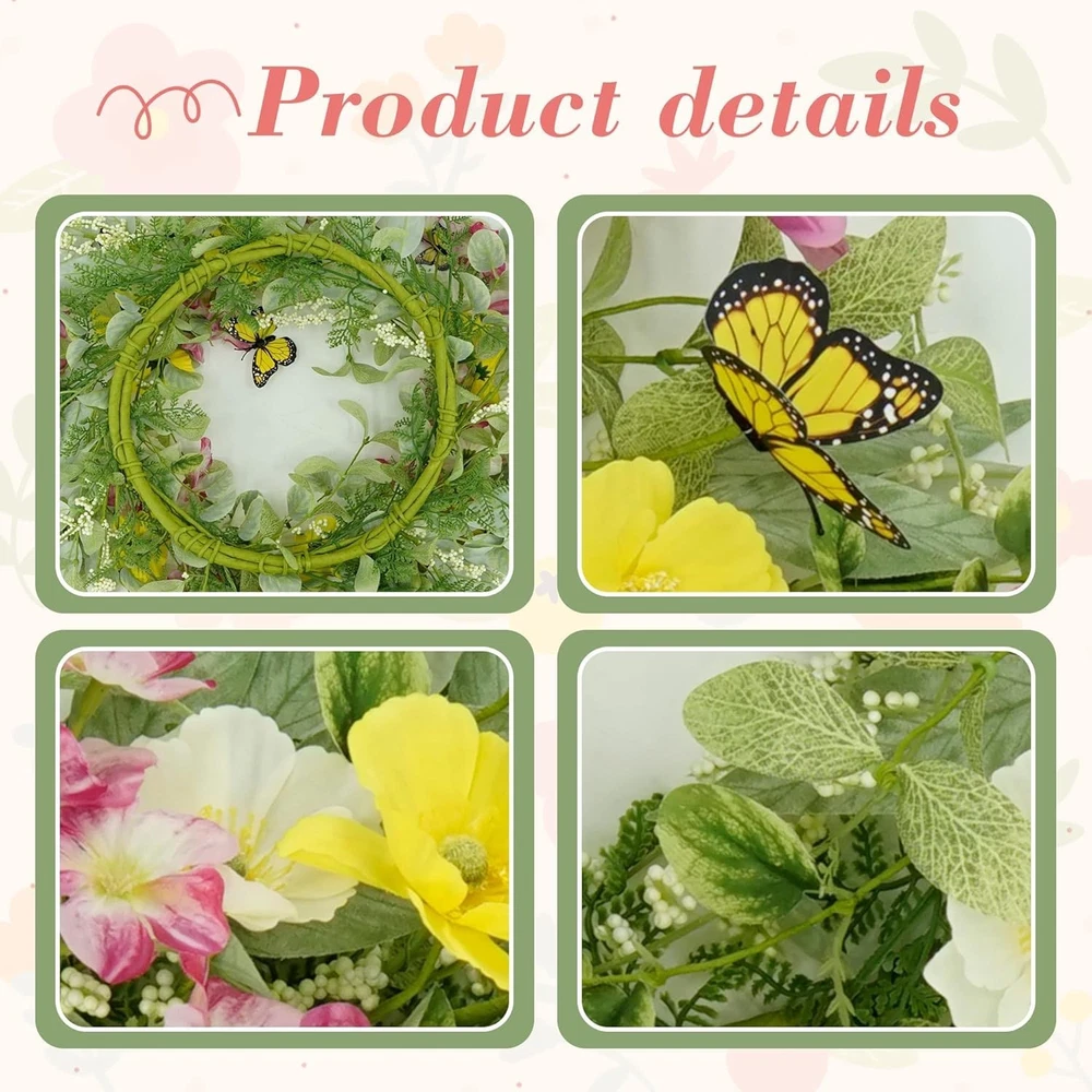 Elegant 18-Inch Spring Summer Wreath with Daisies & Butterflies for Every Door ‹ › ‹ › ‹ › ‹ › ‹ › ‹ › ‹ › ‹ › ‹ › Elegant 18-Inch Spring Summer Wreath with Daisies & Butterflies Transform your home into a vibrant oasis with this stunning Spring Summer Wreath adorned with beautiful daisies and whimsical butterflies. Measuring an ideal 18 inches in diameter, this wreath is perfectly sized for adorning your front door, creating an inviting entrance while celebrating the beauty of each season. Features: Realistic Design: Surrounded by lush eucalyptus leaves, colorful daisies, and delightful butterflies, this wreath exudes a lifelike charm that enchants throughout the . Versatile Applications: Use it to embellish your front door, windows, or as a vibrant wall decoration in your living room, fireplace, or kitchen. Easy Maintenance: Handcrafted from high-quality silk and durable iron coils, this artificial wreath is designed to endure. It requires no watering, trimming, or special maintenance, ensuring long-lasting beauty. Wreath Instructions: Arriving in a secure box to prevent damage during transport, simply unfold and shape it for a breathtaking full appearance. Why Choose Our Elegant Wreath? Step into a world of seasonal charm with this exquisite wreath that brings a fresh breath of spring and summer into your home. With its exquisite craftsmanship and vibrant colors, it’s not just a decorative piece; it’s a statement of elegance and personality. Perfect for creating a warm welcome for your guests or as a delightful gift for loved ones, this wreath enhances your living space with natural beauty and joy. Indulge in the luxury of effortless decoration—order your Elegant Spring Summer Wreath today and let your home blossom with style! Shipping Free & Fast Shipping - We offer free shipping to most of the USA with a normal delivery time of 3-7 days. However, due to the current situation, additional delivery time (up to 3 weeks) may be required for some items. Alternative Carriers - We may use alternative carriers (e.g. USPS, FedEx, UPS, etc.) to ensure your package arrives safely and on time. Due to the use of multiple carriers, we are unable to provide a tracking number automatically. Handling Time - Orders are processed and shipped within 1-2 business days of receiving cleared payment. Shipping Restrictions - Shipping to Alaska, Hawaii, Puerto Rico, Guam, and other US territories may incur shipping charges or delivery restrictions. Please contact us before ordering, or your order can be refunded/cancelled. State Restrictions - There may be restrictions based on your state of purchase. For example, certain items may not be shipped to California due to state regulations. Contact for Tracking Updates - If you require tracking updates or have any concerns about the delivery of your order, please feel free to contact us, and we will be happy to assist you. Return 30-Day Hassle-Free Returns - We want you to be completely satisfied with your purchase. If you are not, you can return the item within 30 days of receiving it for a full refund or exchange. Easy Return Process - To start a return, simply contact us and we will provide you with a prepaid return shipping label and detailed instructions. Restocking Fee - There are no restocking fees for returns. However, the buyer is responsible for return shipping costs if the return is not due to a seller's error. Refund Processing Time - Refunds will be processed within 5 business days of receiving the returned item in its condition. Payment We accept all major credit cards, PayPal, and Apple Pay for your convenience. Your payment information is secure and encrypted to ensure a safe and seamless transaction. Please complete your payment within 3 days of purchase to avoid any delays in shipping. Feedback Your feedback is extremely important to us. We strive to provide the best products and customer service possible. If you are satisfied with your purchase, please take a moment to leave us a positive review. If you have any concerns or issues with your order, please contact us before leaving negative feedback. We are committed to resolving any problems and ensuring your satisfaction. Contact Us If you have any questions or concerns, please feel free to out to our customer support team. You can contact us through the eBay messaging system. We are available Monday to Friday, 9:00 am to 5:00 pm EST, and we will do our best to respond to your inquiry within 24 hours. Buy it now and enjoy a pleasant shopping experience! Item Width: Spring Summer Wreaths Unit Quantity: 18 in Material: Silk,Iron Common Name: Daisy,Butterfly Product: Spring Summer Wreaths Form: Wreath Occasion: Casual Color: Yellow & Green Type: Wreath Artificial/Fresh: Artificial Size: 18 in Item Height: 20 Inches Number in Pack: 1 Unit Type: Unit