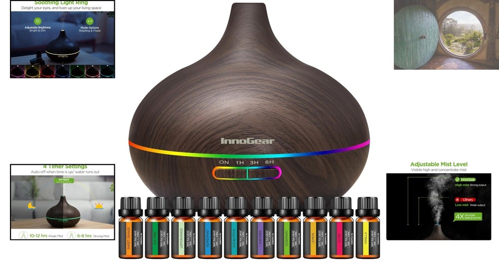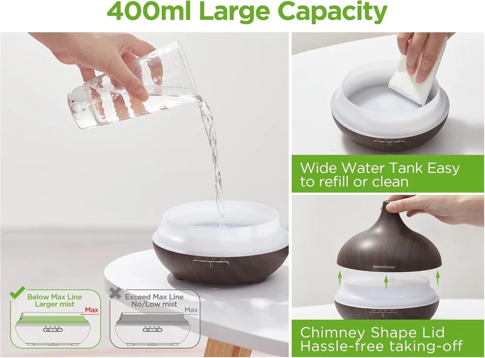 Capacity: 400 Milliliters Number in Pack: 1 Item Dimensions L X W X H: 6.1"l X 6.1"w X 5.79"h Wattage: 10 Watts Light Source: Led Material Type: Polypropylene (pp) Recommended Uses For Product: Home Item Weight: 1.2 oz Upc: 810015622636 Smart Home Protocol: None Shape: Round Volume: 400 ml Brand: Unbranded Noise Level: 30 dB Color: Dark Wood Grain Coverage: Large Room (300 Square Feet) Scent Name: 10 Scents Included Scent: Assorted/Mixed, Peppermint, Orange, Lavender, Tea Tree, Rosemary, Eucalyptus, Lemongrass, Lemon, Clove, Vanilla Humidity Control: Yes Features: Deodorizer, Aromatherapy, Auto Off, Colorful, Eco-Friendly, Timer Setting, Waterless Auto Off Style: Modern Item Type Name: 400ml Oil Diffuser With 10 Essential Oils Effect: Stress Relief Item Diameter: 6 in Container Type: Jar Floor Area: 300 Square Feet Number of Settings: 4 Installation Area: Indoor Item Height: 5.79 Inches Material: Plastic, Polypropylene (PP) Power Source: Corded Electric Era: 21st Century (2000-Now) Automatic Shutoff: Yes Unit Count: 1.0 Count Runtime: 12 Hours For: Aromatherapy Smart Home Compatibility: None Type: Aromatherapy Diffuser