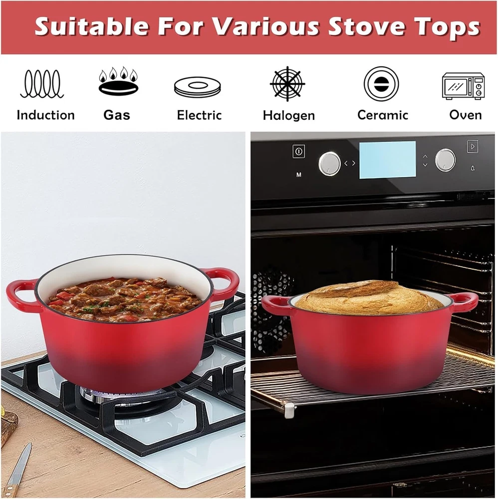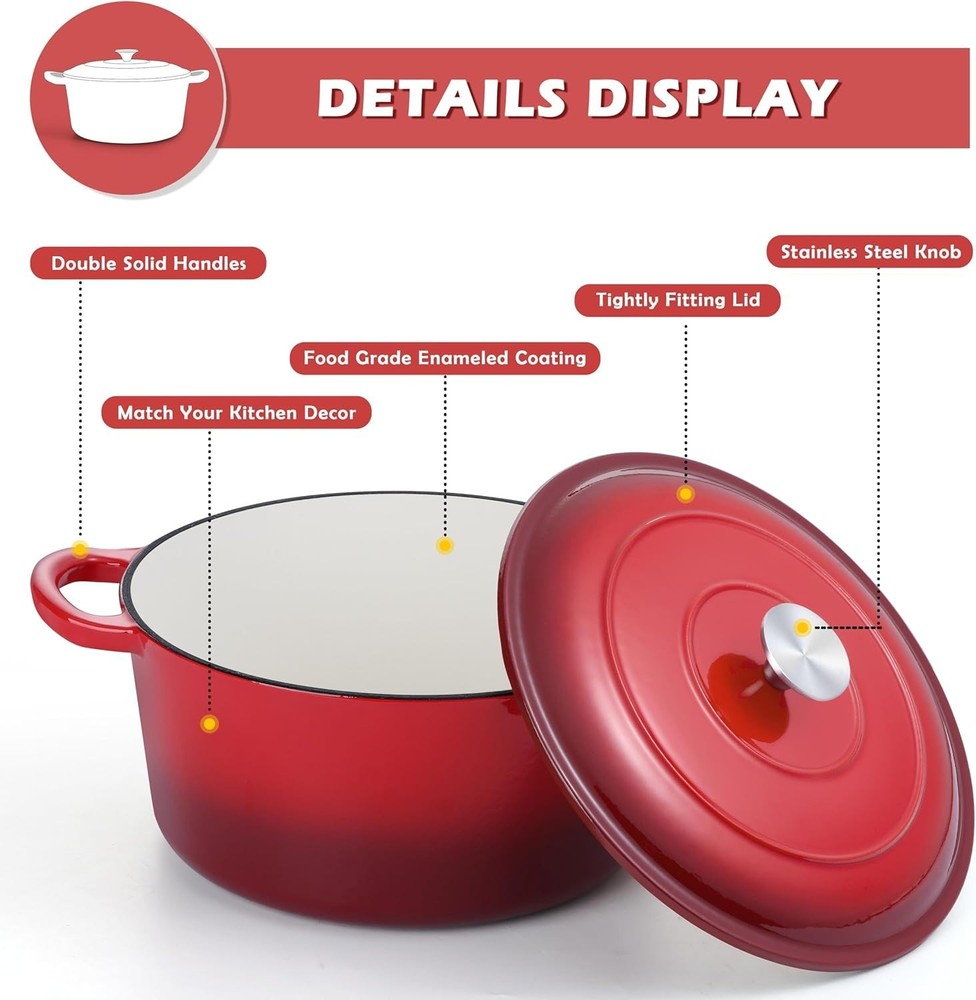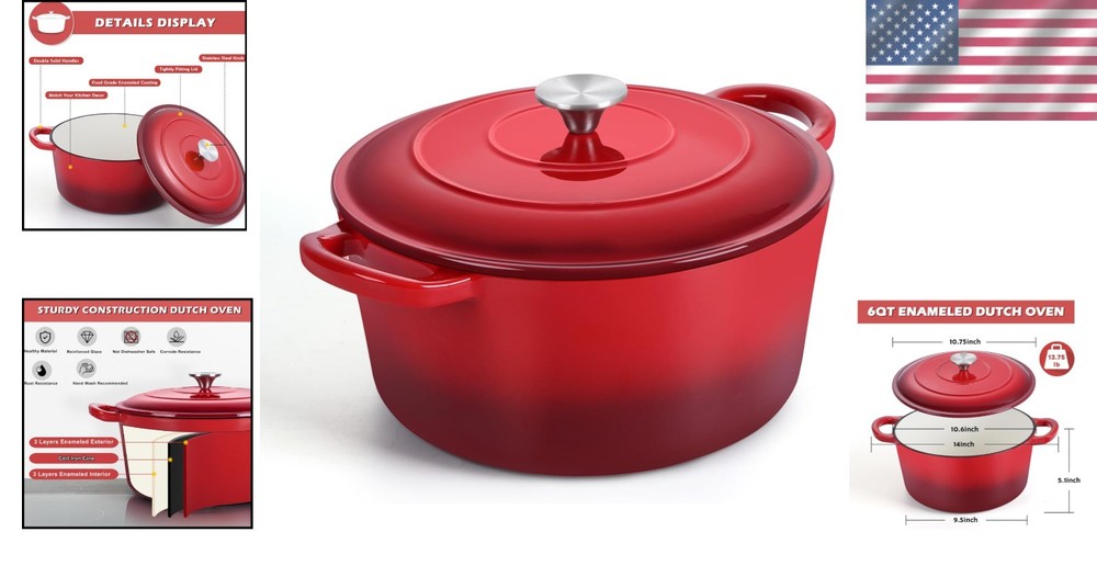 Elegant 6 Quart Enameled Cast Iron Dutch Oven - Oven Safe, Stylish Red Design ‹ › ‹ › ‹ › ‹ › ‹ › ‹ › ‹ › ‹ › ‹ › Elegant 6 Quart Enameled Cast Iron Dutch Oven Oven Safe, Stylish Red Design Features: Constructed from high-quality cast iron with a two-layer food-grade enamel coating, ensuring no toxic substances leach into your food. Thick construction provides a solid feel and long-lasting durability, serving all your culinary needs. Tri-ply construction includes a white enameled inner, a sturdy cast iron core, and a chic gradient red outer enamel that perfectly matches any kitchen décor. Internal non-stick surface reduces food sticking—a blessing for easy cleanup. Equipped with a tight-fitting lid featuring small dots to evenly distribute vapor for juicy, tender meals. Double handles designed for comfort and confidence, ensuring safe handling of heavy dishes. Benefits: Optimal heat retention ensures even cooking—perfect for stews, soups, and more. Versatile compatibility with various stovetops, including induction, electric, gas, ceramic, and glass. Can be effortlessly moved from stovetop to oven, expanding your cooking possibilities. Generous 6-quart size, ideal for feeding 4-5 people or hosting intimate gatherings. An elegant culinary gift, perfect for celebrations like Birthdays, Christmas, or Housewarmings. Why choose our Enameled Cast Iron Dutch Oven? Elevate your cooking experience with our Elegant 6 Quart Enameled Cast Iron Dutch Oven, a timeless kitchen essential that is as functional as it is beautiful. Enjoy the assurance of healthy cooking with no harmful substances and the elegance of vibrant red enamel that complements your aesthetic. Don’t compromise on quality or style—order your Dutch Oven today and discover how it transforms your culinary artistry into a masterpiece of flavor and presentation. Shipping Free & Fast Shipping - We offer free shipping to most of the USA with a normal delivery time of 3-7 days. However, due to the current situation, additional delivery time (up to 3 weeks) may be required for some items. Alternative Carriers - We may use alternative carriers (e.g. USPS, FedEx, UPS, etc.) to ensure your package arrives safely and on time. Due to the use of multiple carriers, we are unable to provide a tracking number automatically. Handling Time - Orders are processed and shipped within 1-2 business days of receiving cleared payment. Shipping Restrictions - Shipping to Alaska, Hawaii, Puerto Rico, Guam, and other US territories may incur shipping charges or delivery restrictions. Please contact us before ordering, or your order can be refunded/cancelled. State Restrictions - There may be restrictions based on your state of purchase. For example, certain items may not be shipped to California due to state regulations. Contact for Tracking Updates - If you require tracking updates or have any concerns about the delivery of your order, please feel free to contact us, and we will be happy to assist you. Return 30-Day Hassle-Free Returns - We want you to be completely satisfied with your purchase. If you are not, you can return the item within 30 days of receiving it for a full refund or exchange. Easy Return Process - To start a return, simply contact us and we will provide you with a prepaid return shipping label and detailed instructions. Restocking Fee - There are no restocking fees for returns. However, the buyer is responsible for return shipping costs if the return is not due to a seller's error. Refund Processing Time - Refunds will be processed within 5 business days of receiving the returned item in its condition. Payment We accept all major credit cards, PayPal, and Apple Pay for your convenience. Your payment information is secure and encrypted to ensure a safe and seamless transaction. Please complete your payment within 3 days of purchase to avoid any delays in shipping. Feedback Your feedback is extremely important to us. We strive to provide the best products and customer service possible. If you are satisfied with your purchase, please take a moment to leave us a positive review. If you have any concerns or issues with your order, please contact us before leaving negative feedback. We are committed to resolving any problems and ensuring your satisfaction. Contact Us If you have any questions or concerns, please feel free to out to our customer support team. You can contact us through the eBay messaging system. We are available Monday to Friday, 9:00 am to 5:00 pm EST, and we will do our best to respond to your inquiry within 24 hours. Buy it now and enjoy a pleasant shopping experience! Item Diameter: 10.6 Capacity: 6 quarts Item Weight: 15.36 pounds Heat Resistance: 500°F Item Depth: 5 Unit Quantity: 1 Stove Type Compatibility: Electric,Gas,Induction,Ceramic,Glass Set Includes: Lid Material: Cast Iron,Enameled Inner,Enameled Outer Features: Easy to Clean,Oven-Safe,With Lid Type of Oven: Electric,Gas,Induction,Oven Type: Dutch Oven Color: Red Surface Coating: Enameled Coating Shape: Round Number of Items in Set: One-Piece