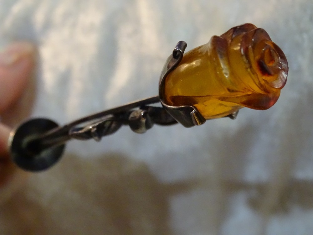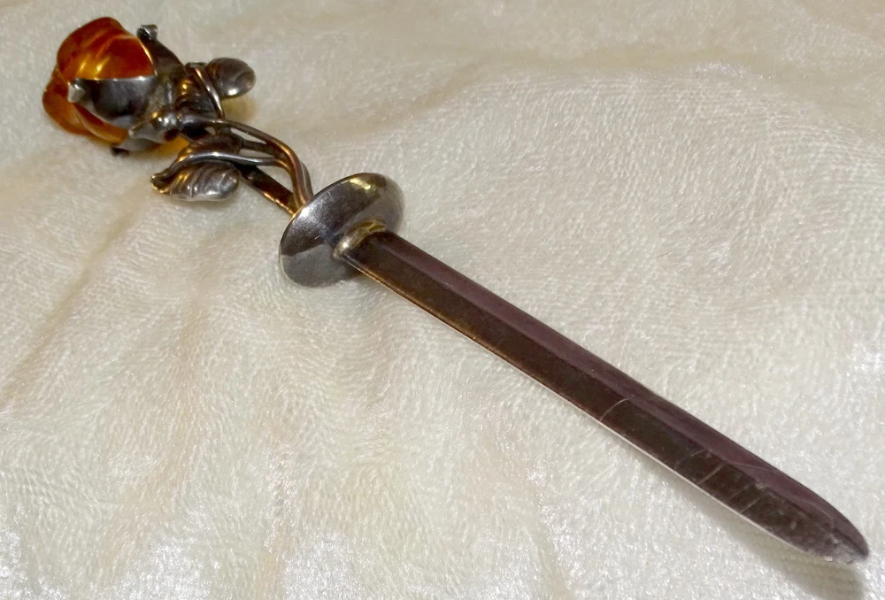 The Lovely Amber Rose 6" Very Strong Letter Opener is a vintage collectible made of a strong material and not signed. I have used it for several years with no problems opening just about anything, crafted in the United States. This elegant and sturdy letter opener features a unique design, making it a stylish and functional addition to any desk or office space. The hand carved amber rose is 1" long and with the stem and leaves almost 3". Its vintage appeal adds a touch of nostalgia to everyday tasks, while its strong material ensures durability for long-lasting use.