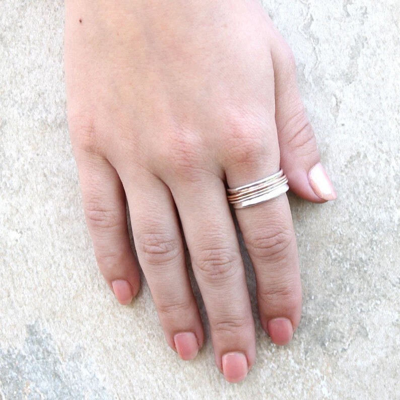 Find your center and experience a sense of calm with this beautifully crafted Tri-Color Spinner Meditation Ring. Designed with a narrow band of sterling silver, this ring features three complementary colors – silver, gold, and copper – creating a sleek and timeless design that’s both elegant and functional. Key Features: Material: High-quality sterling silver ensures durability and a beautiful shine. Tri-Color Design: A stunning combination of sterling silver, gold, and copper for a unique and eye-catching look. Spinner Band: The outer band spins smoothly, providing a soothing, tactile experience that can help reduce stress and promote focus during meditation or moments of anxiety. Perfect for Meditation & Mindfulness: Use this spinner ring to help focus your mind, calm your thoughts, or simply as a stylish accessory for everyday wear. Comfort Fit: The narrow band design offers a comfortable fit, making it suitable for daily wear. Whether you're seeking a tool to aid your meditation practice or just love the elegance of a beautifully crafted ring, this Tri-Color Spinner Meditation Ring is the perfect choice. Wear it as a reminder to stay grounded, mindful, and present.