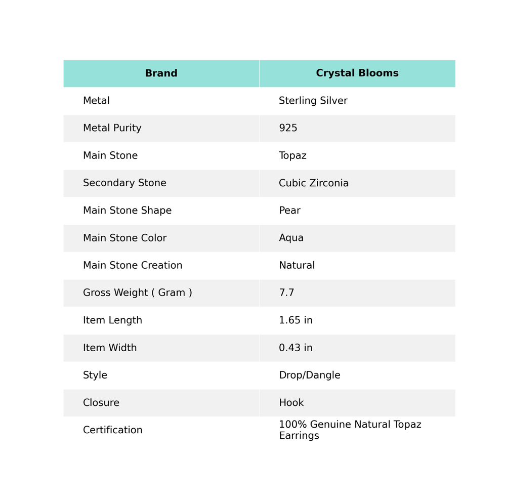 Diamond Clarity Grade: Not Applicable Color: Silver Era: Undated Colored Diamond Intensity: Not Applicable Metal: Sterling Silver Number of Gemstones: As Seen in Picture Seller Warranty: Yes Main Stone Creation: Natural Main Stone Shape: Pear Theme: Beauty Base Metal: Silver Material: Crystal, Stone, Gemstone, Metal Country/Region of Manufacture: India Antique: No Style: Drop/Dangle Main Stone Color: Aqua Occasion: Anniversary, Birthday, Engagement, Wedding Type: Earrings Brand: Handmade Secondary Stone: Cubic Zirconia Customized: No Personalize: Yes Main Stone: Topaz Item Length: 1.65 in Certification: 100% Genuine Natural Topaz Earrings Setting Style: Bezel Main Stone Treatment: Not Enhanced Cut Grade: Excellent Diamond Color Grade: Not Applicable Wholesale: Yes Signed: Yes Vintage: No Seller Notes: “Indian Handmade Best Quality 925 sterling Silver Jewelry !!” Gemstone Clarity Grade: Eye Clean Total Carat Weight: Not Applicable Country of Origin: India Closure: Hook Number of Diamonds: As Seen in Picture Metal Purity: 925 Shape: As Seen in Picture Ear Area: Lobe